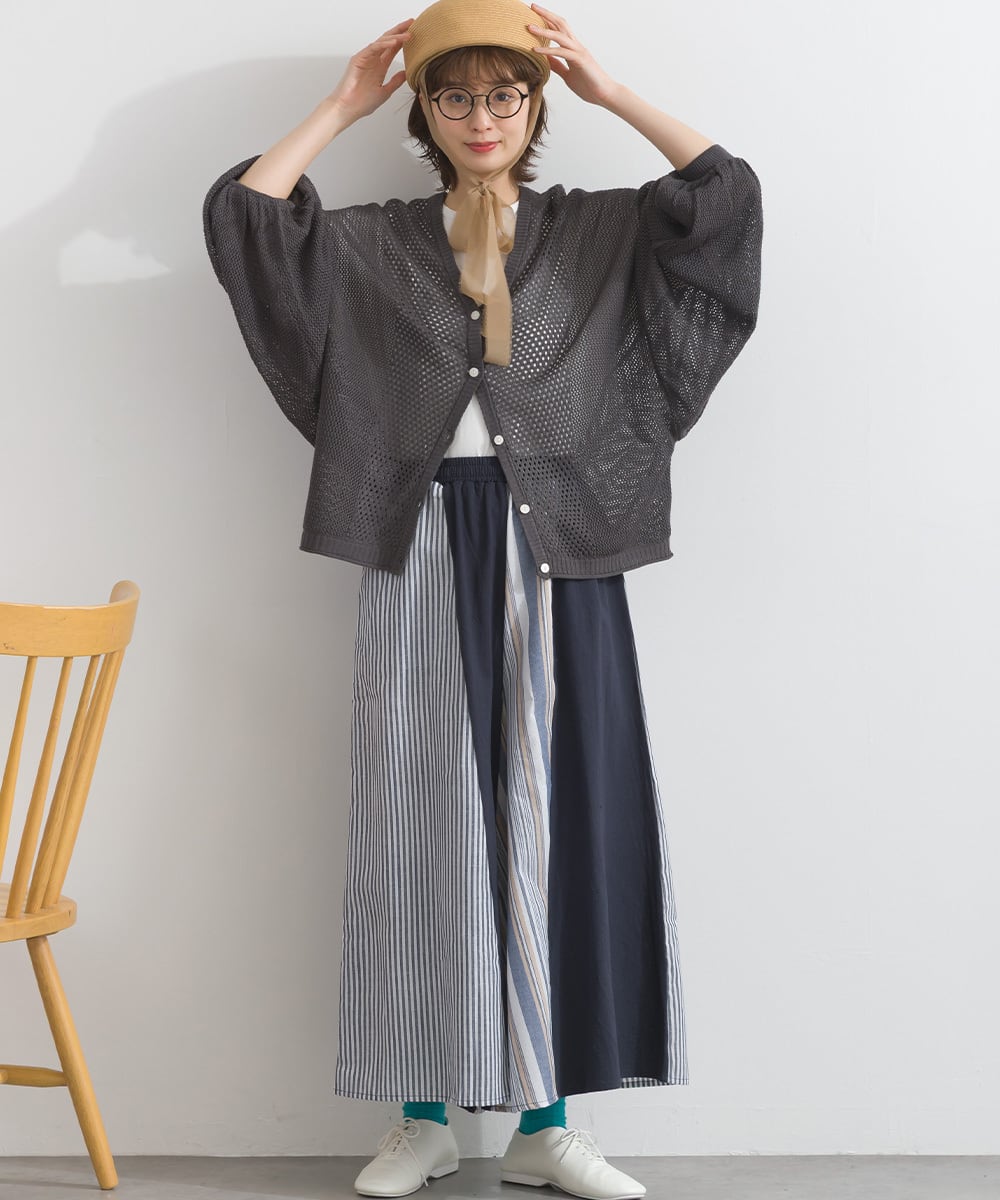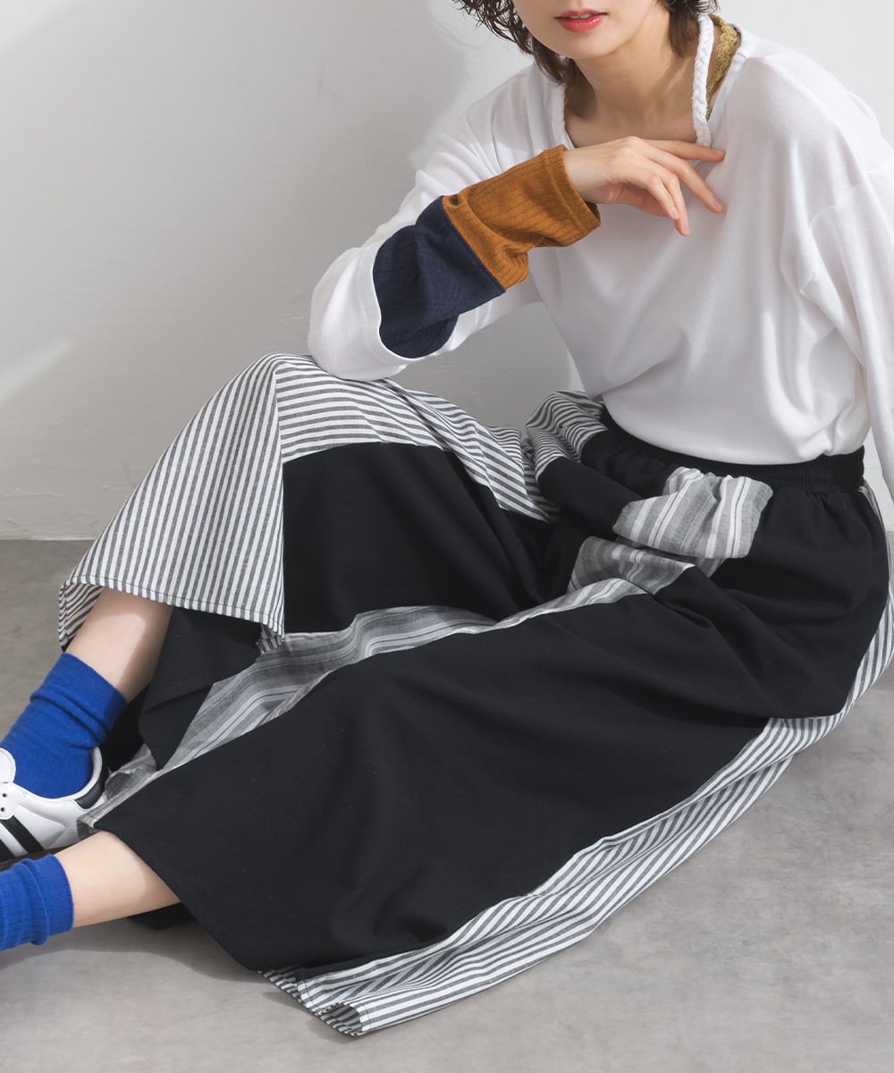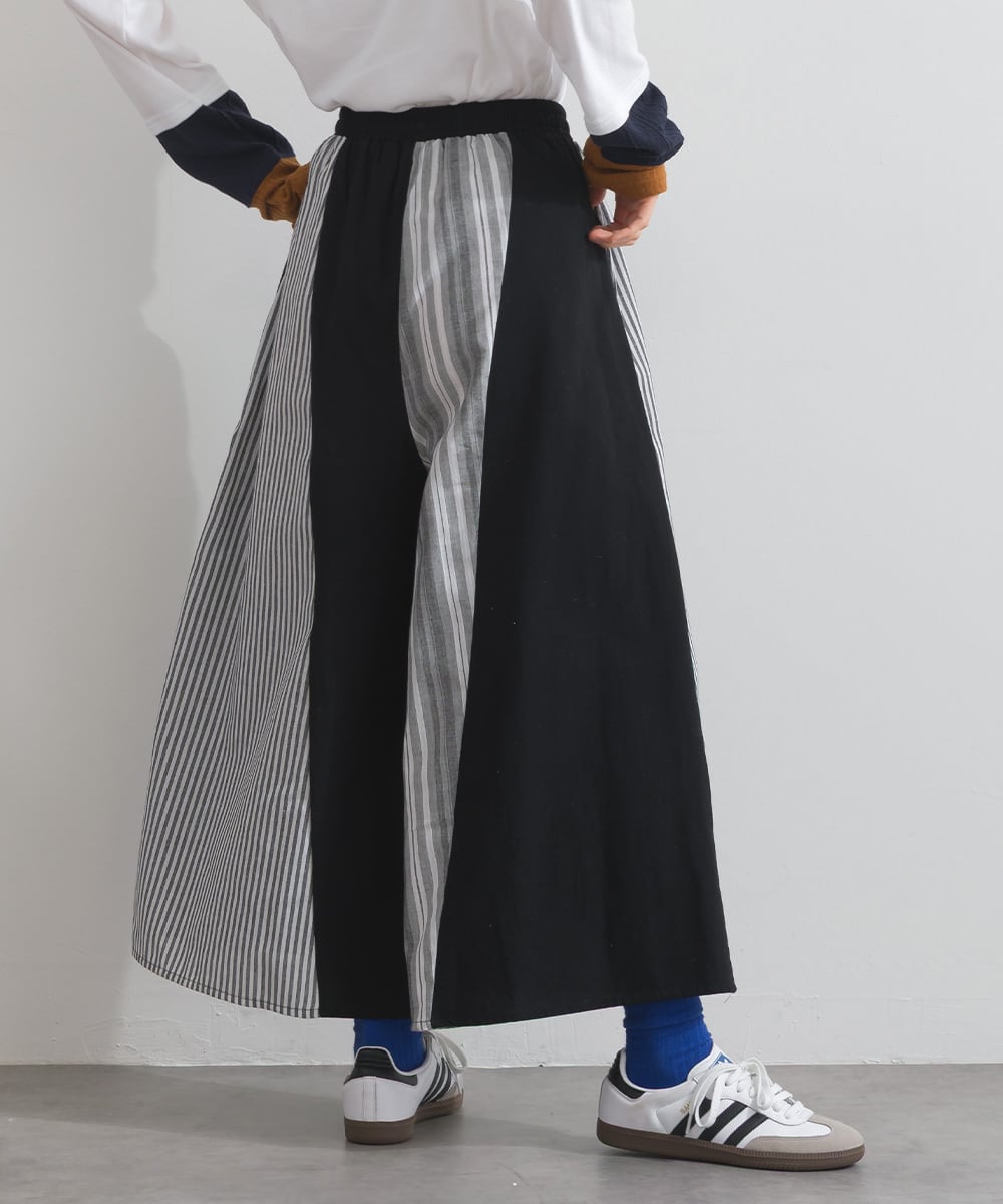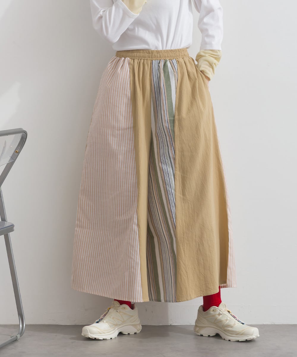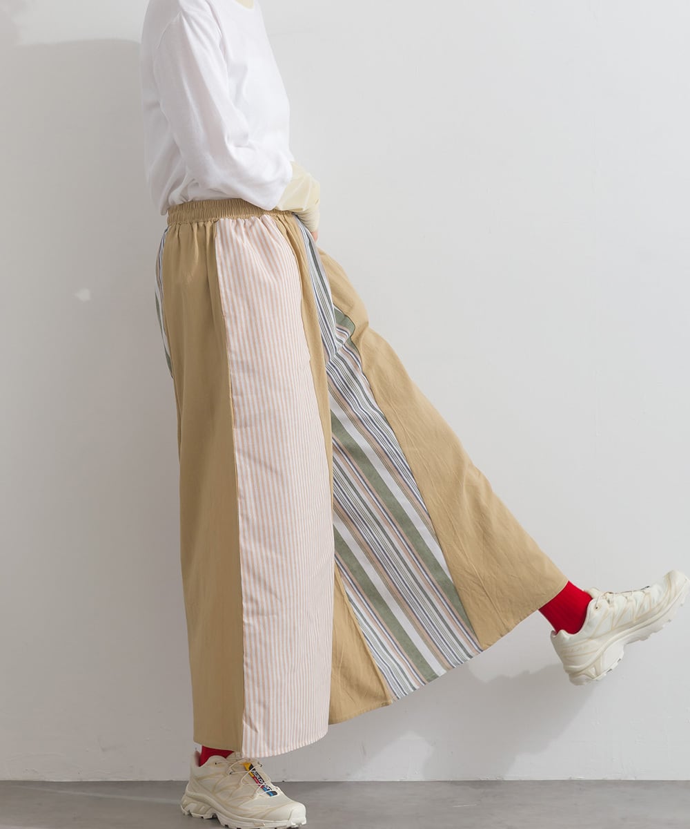 2025春夏新作 2025SSオーバーサイズ ワンマイルウエア iriey アイリー カジュアル ナチュラル ミセス ゆったり 体型カバー パンツ スカーチョ ワイドパンツ ストライプ切替 異素材切替 綿 コットン ウエストゴム イージーパンツ 人気