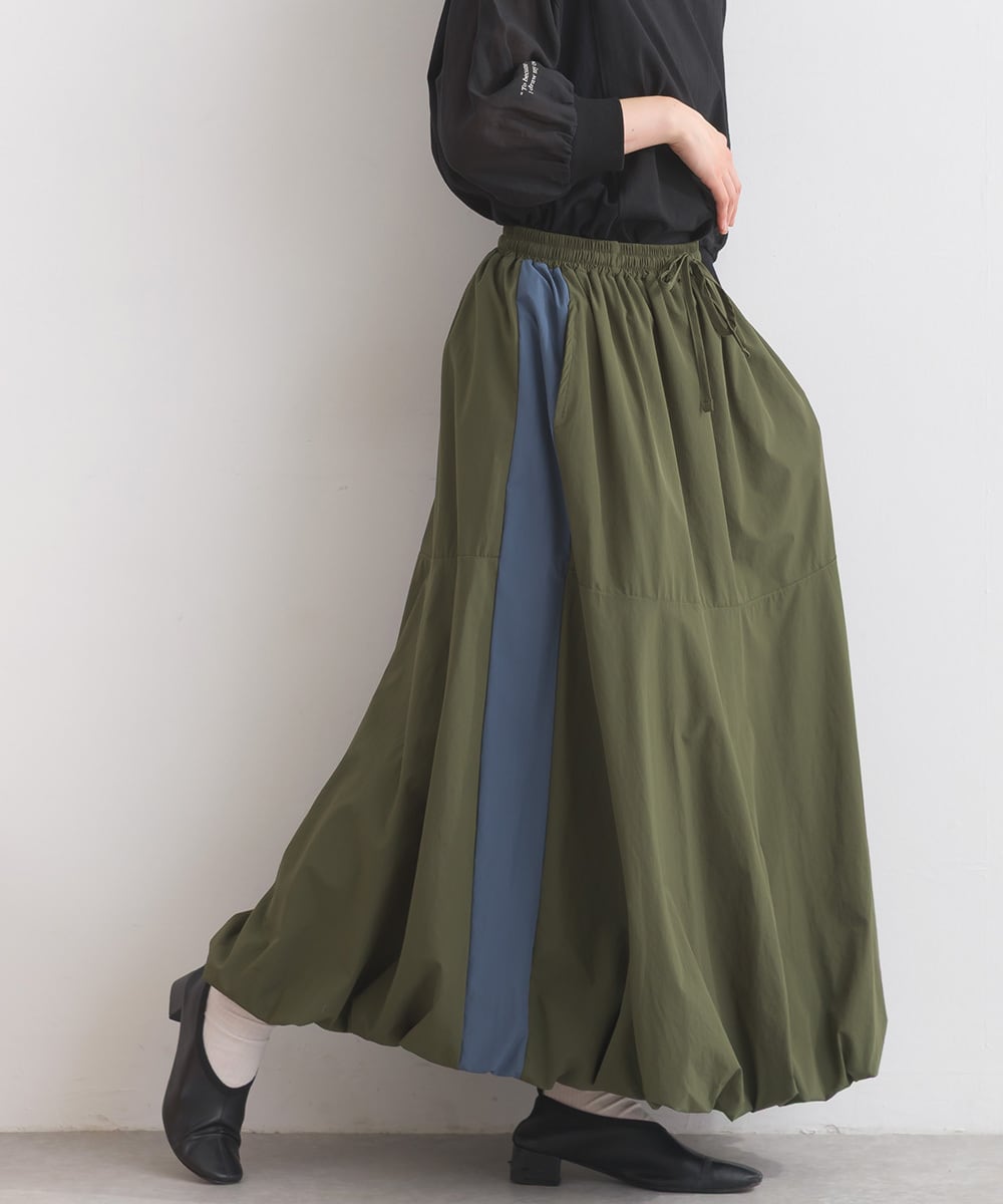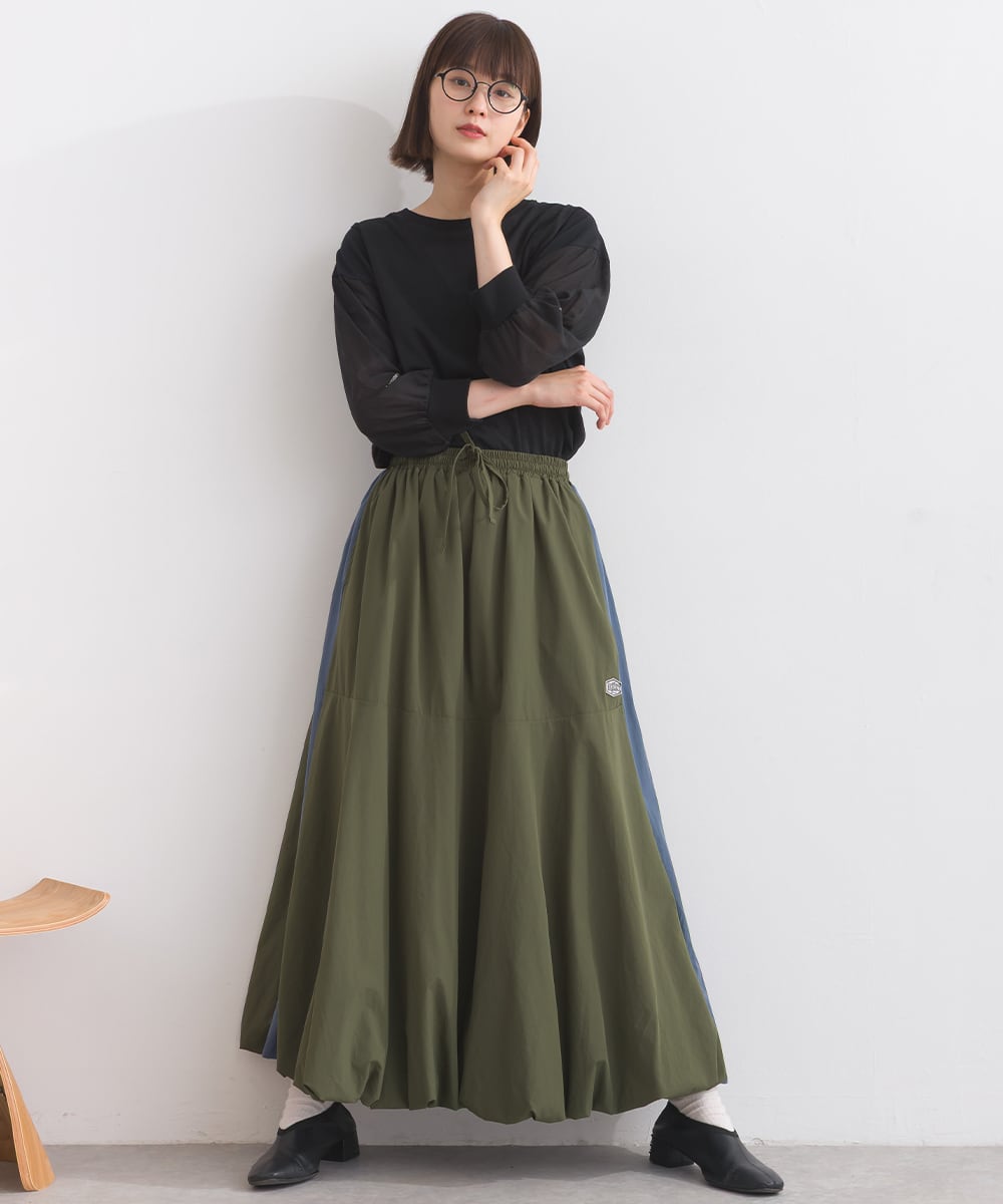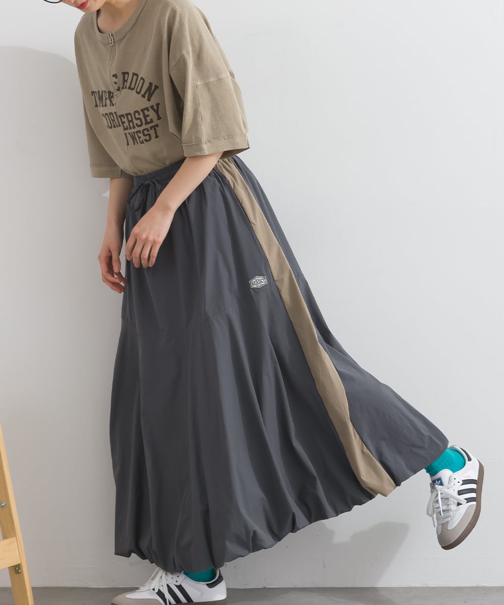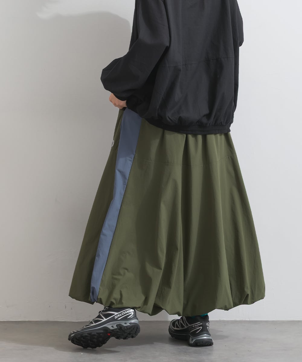 2025秋新作 2025AW 秋スカート 秋新作 オーバーサイズ ワンマイルウエア iriey アイリー カジュアル ナチュラル ミセス ゆったり 体型カバー ナイロン ストレッチナイロン ナイロンスカート モードスカート トラックスカート ラインスカート 配色スカート バルーンスカート デザインスカート スカート アスレジャー 人気