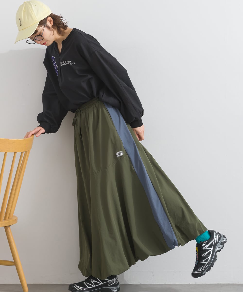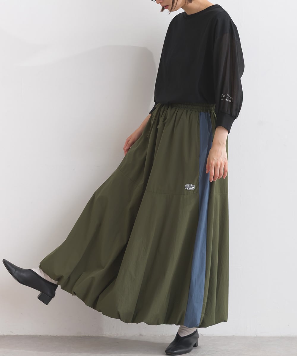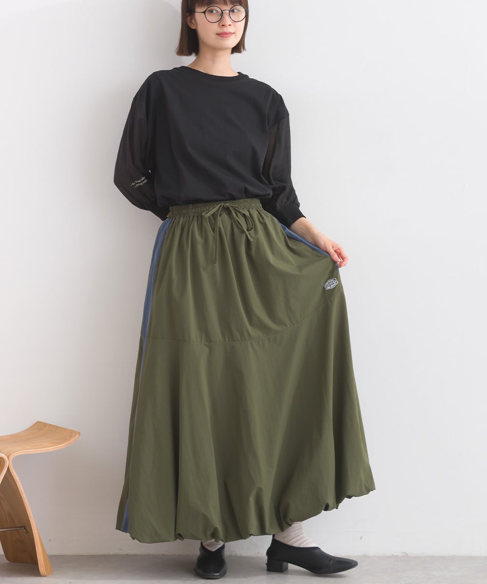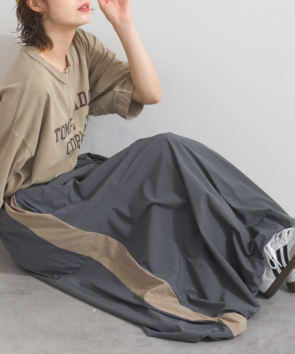 2025秋新作 2025AW 秋スカート 秋新作 オーバーサイズ ワンマイルウエア iriey アイリー カジュアル ナチュラル ミセス ゆったり 体型カバー ナイロン ストレッチナイロン ナイロンスカート モードスカート トラックスカート ラインスカート 配色スカート バルーンスカート デザインスカート スカート アスレジャー 人気