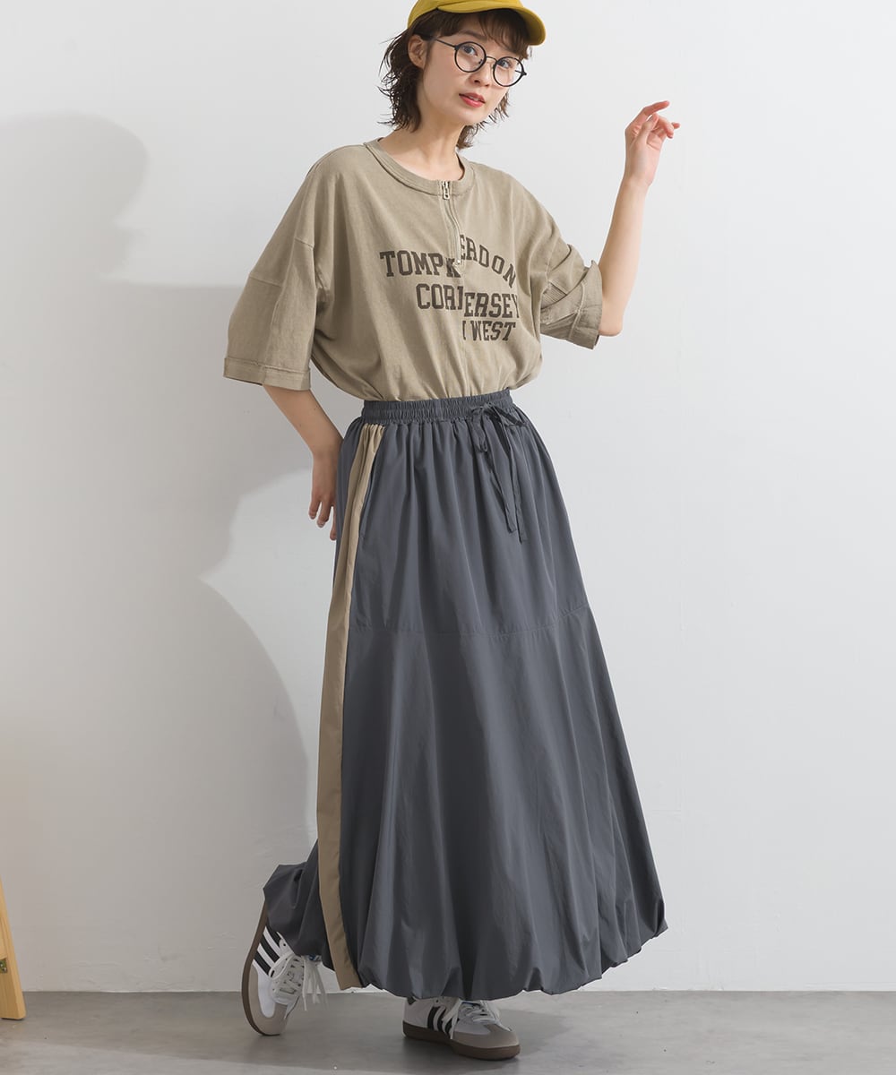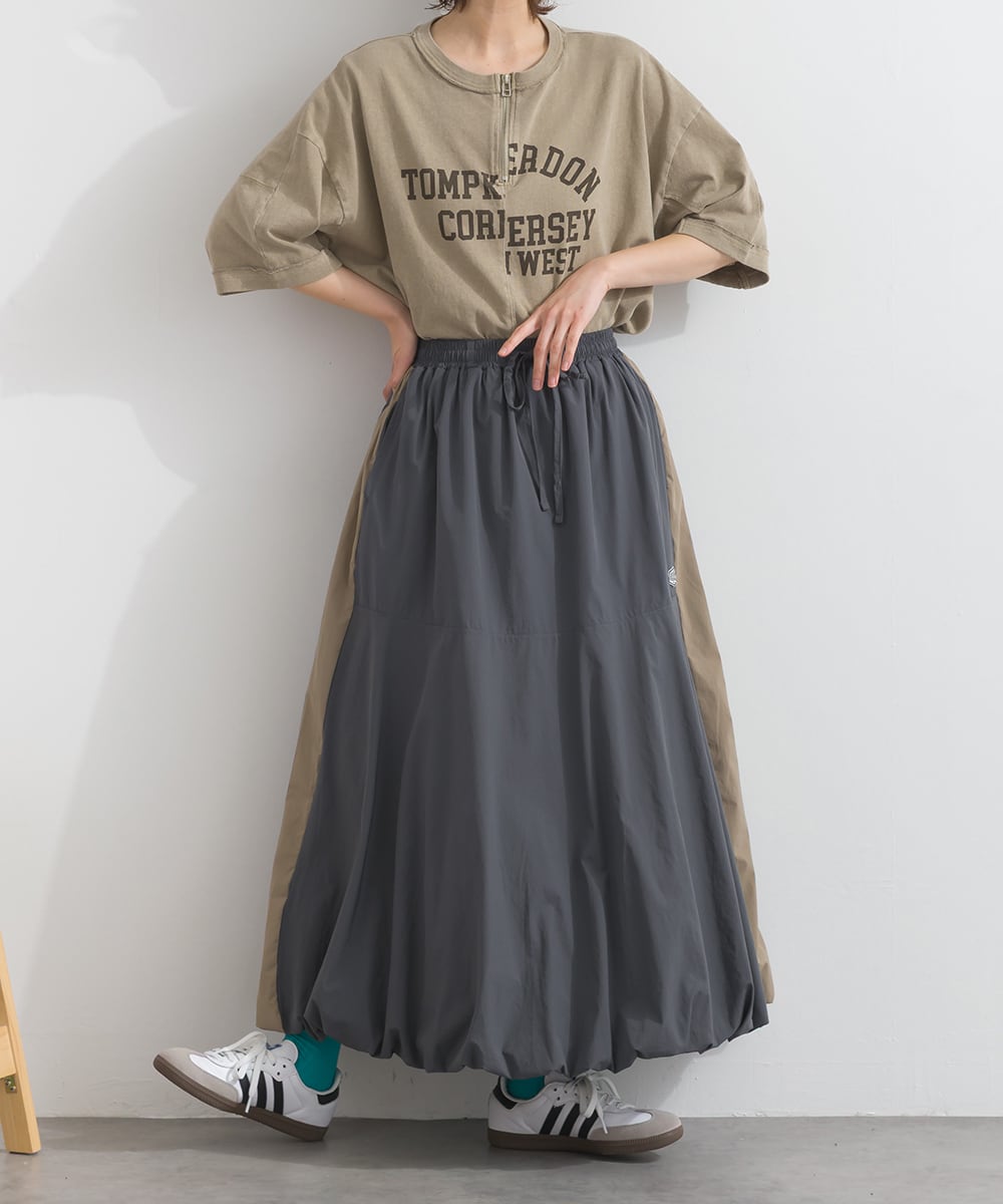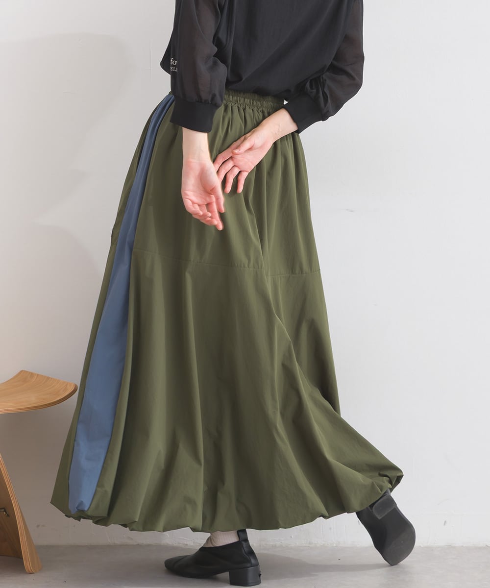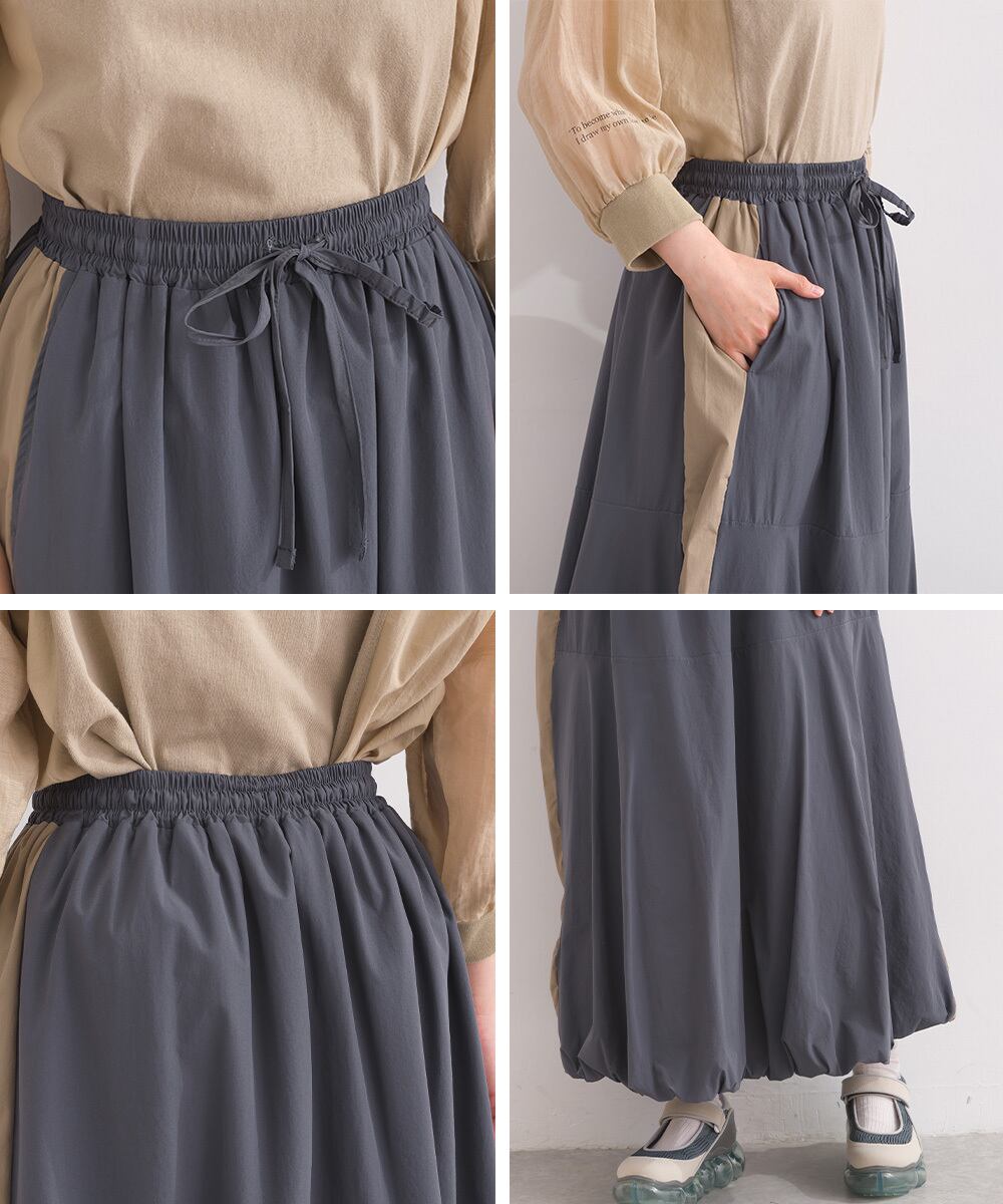 2025秋新作 2025AW 秋スカート 秋新作 オーバーサイズ ワンマイルウエア iriey アイリー カジュアル ナチュラル ミセス ゆったり 体型カバー ナイロン ストレッチナイロン ナイロンスカート モードスカート トラックスカート ラインスカート 配色スカート バルーンスカート デザインスカート スカート アスレジャー 人気