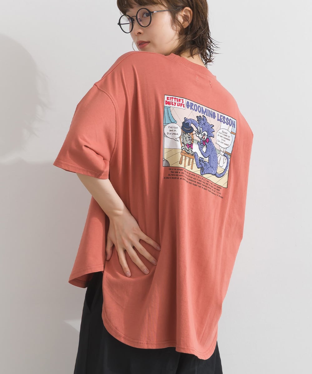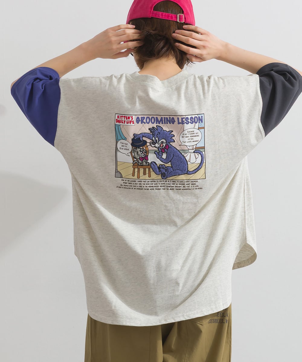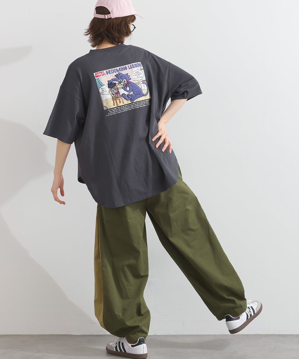 フロントはシンプルなワンポイントプリント、バックには大胆なアメコミ風プリントを施し、インパクトのあるデザインに。