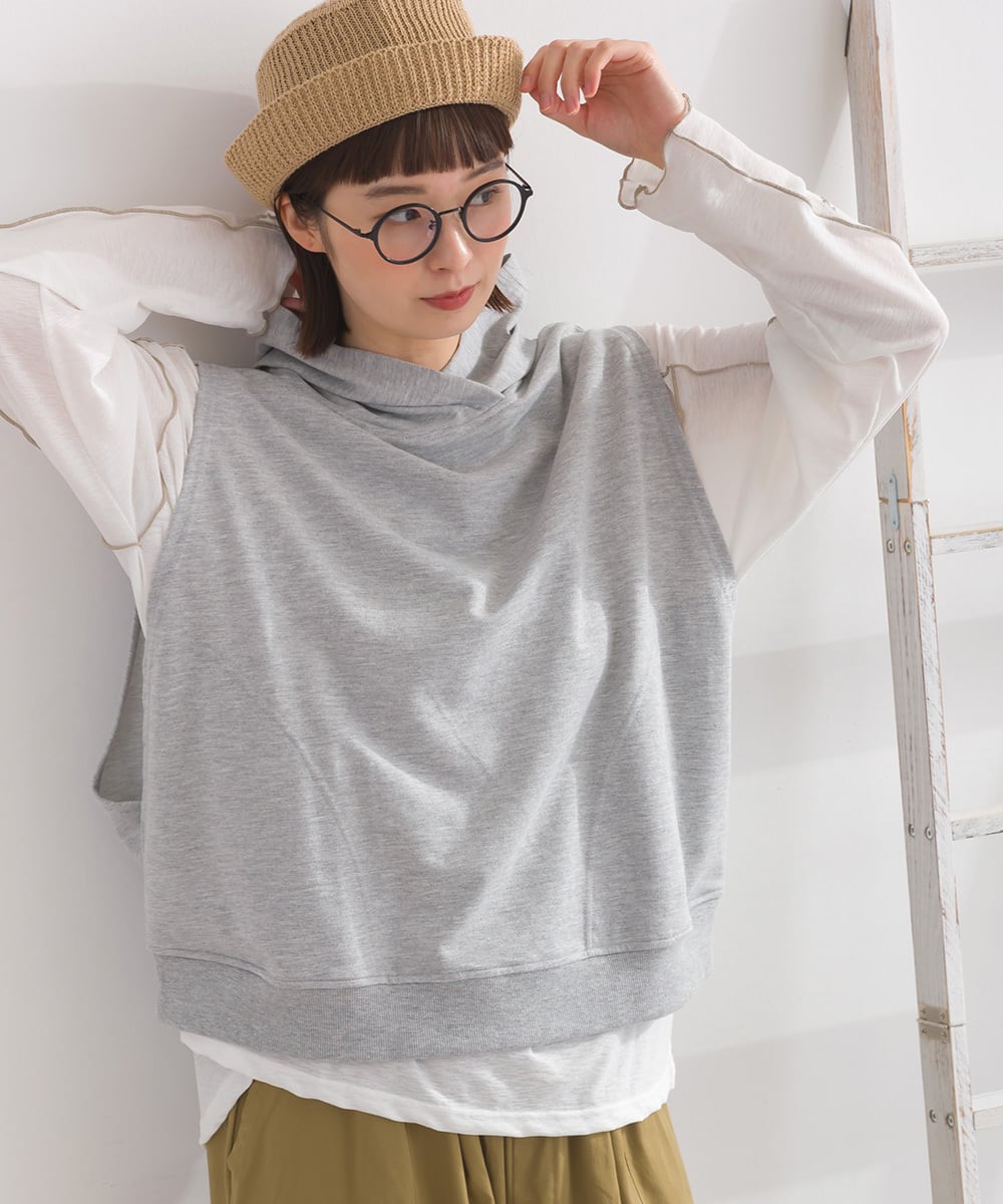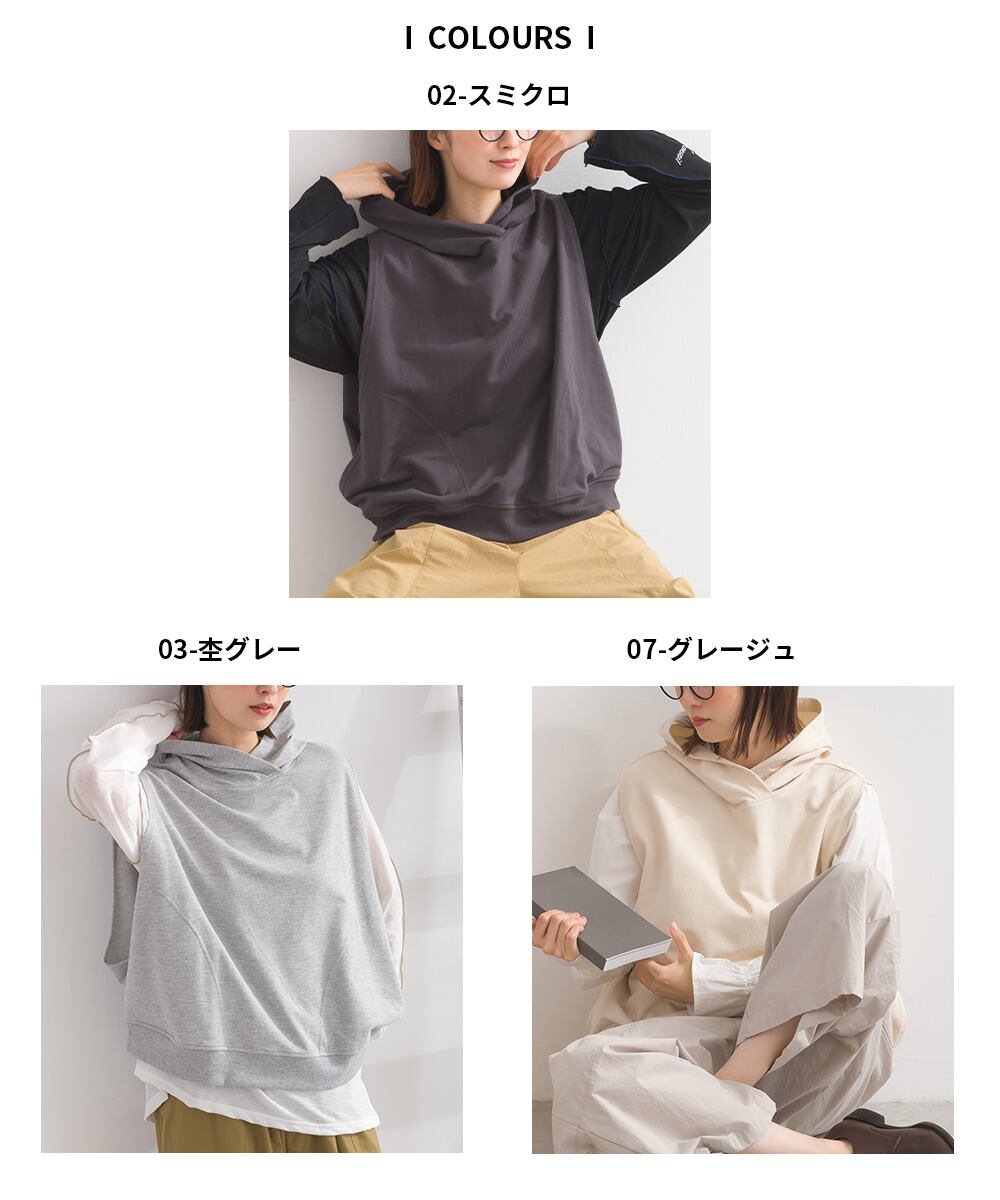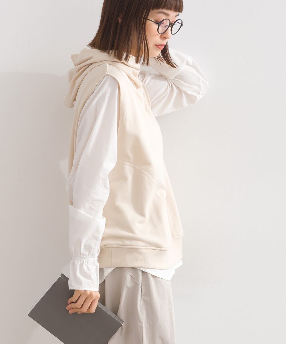 2025秋冬新作 2025AW オーバーサイズ ワンマイルウエア ミセス ゆったり iriey アイリー ナチュラル カジュアル カットソー プルオーバー デザインベスト フードベスト パーカーベスト メンズライク 綿混 コットン 人気