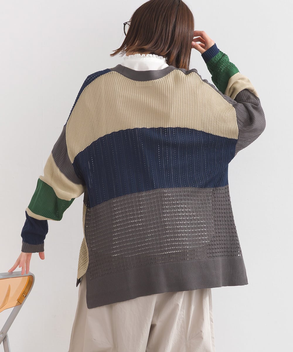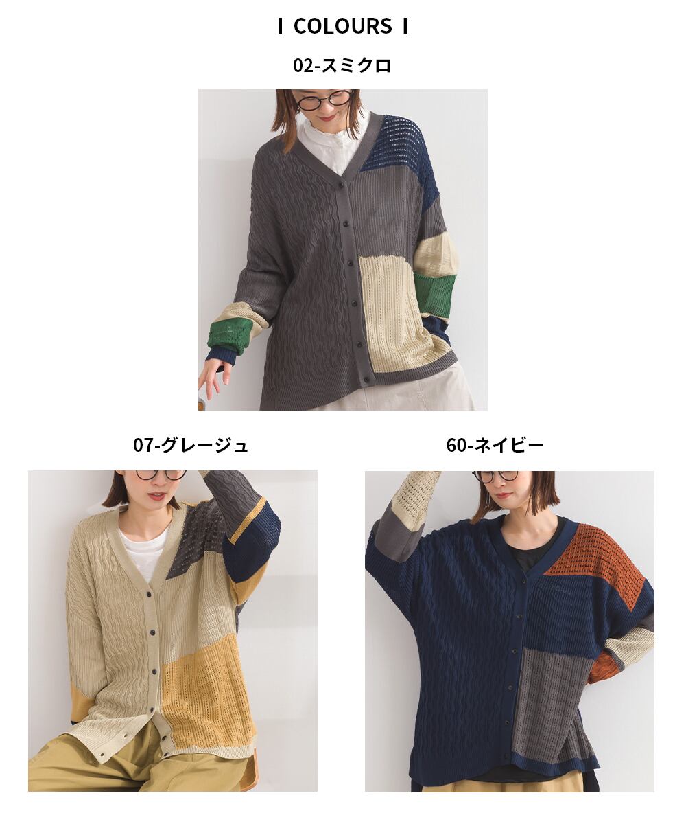 B53070 コットンライクアクリル配色編み地切替Vカーディガン / Cotton-Like Acrylic Color-Block Knit V-Neck Cardigan