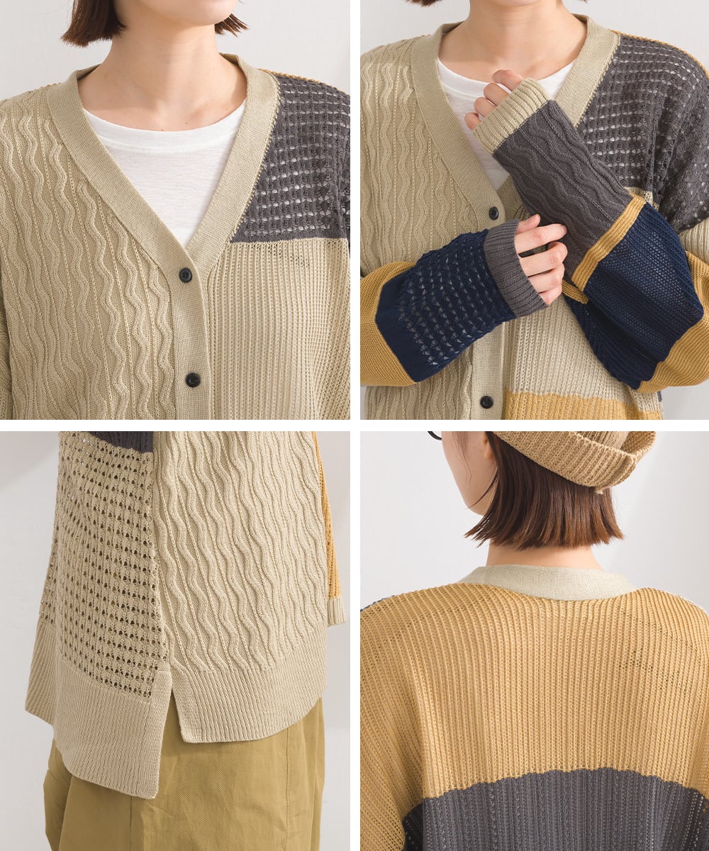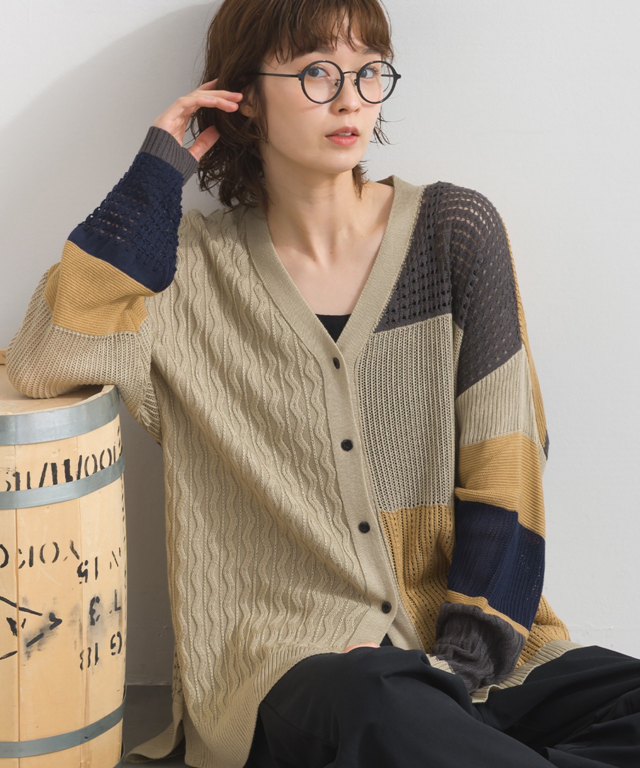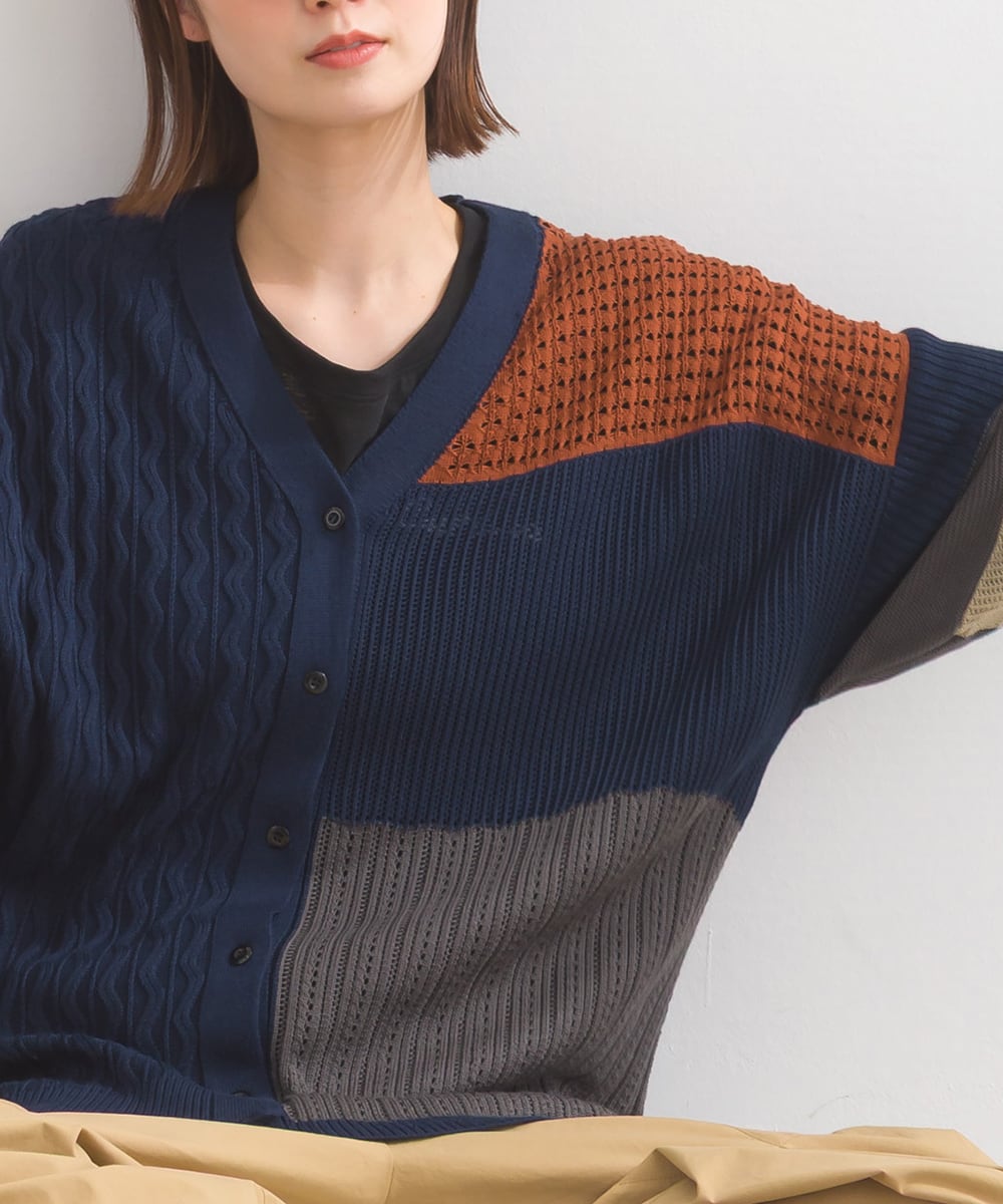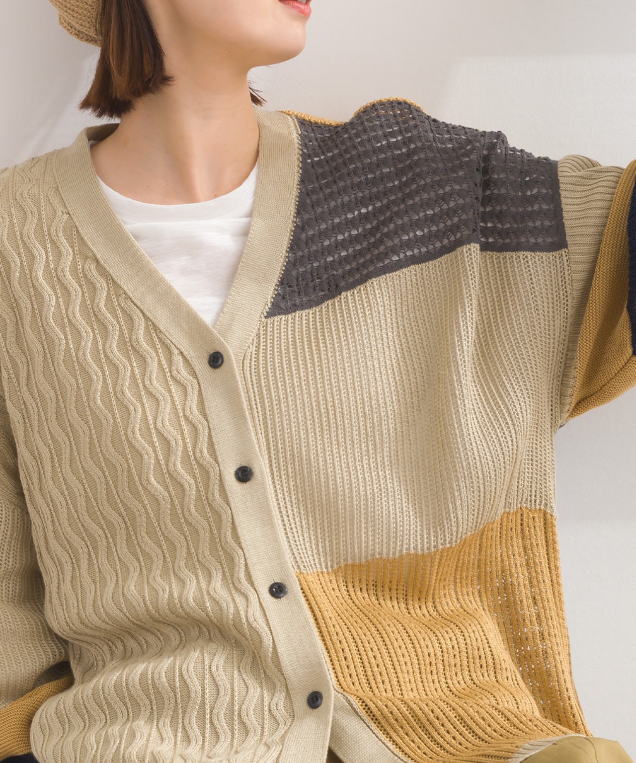 異なる編み地とカラーを組み合わせた、存在感のあるVネックカーディガン。