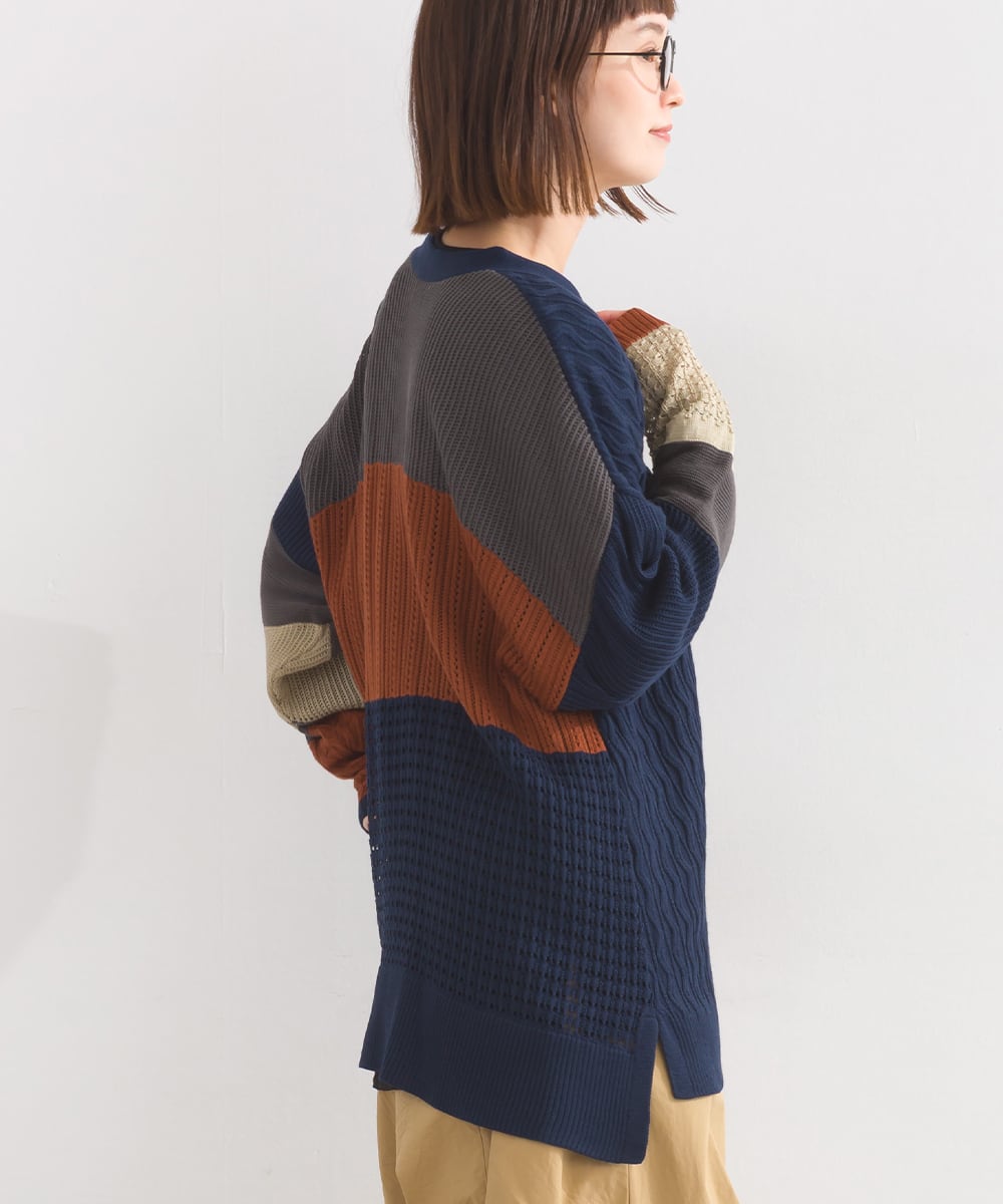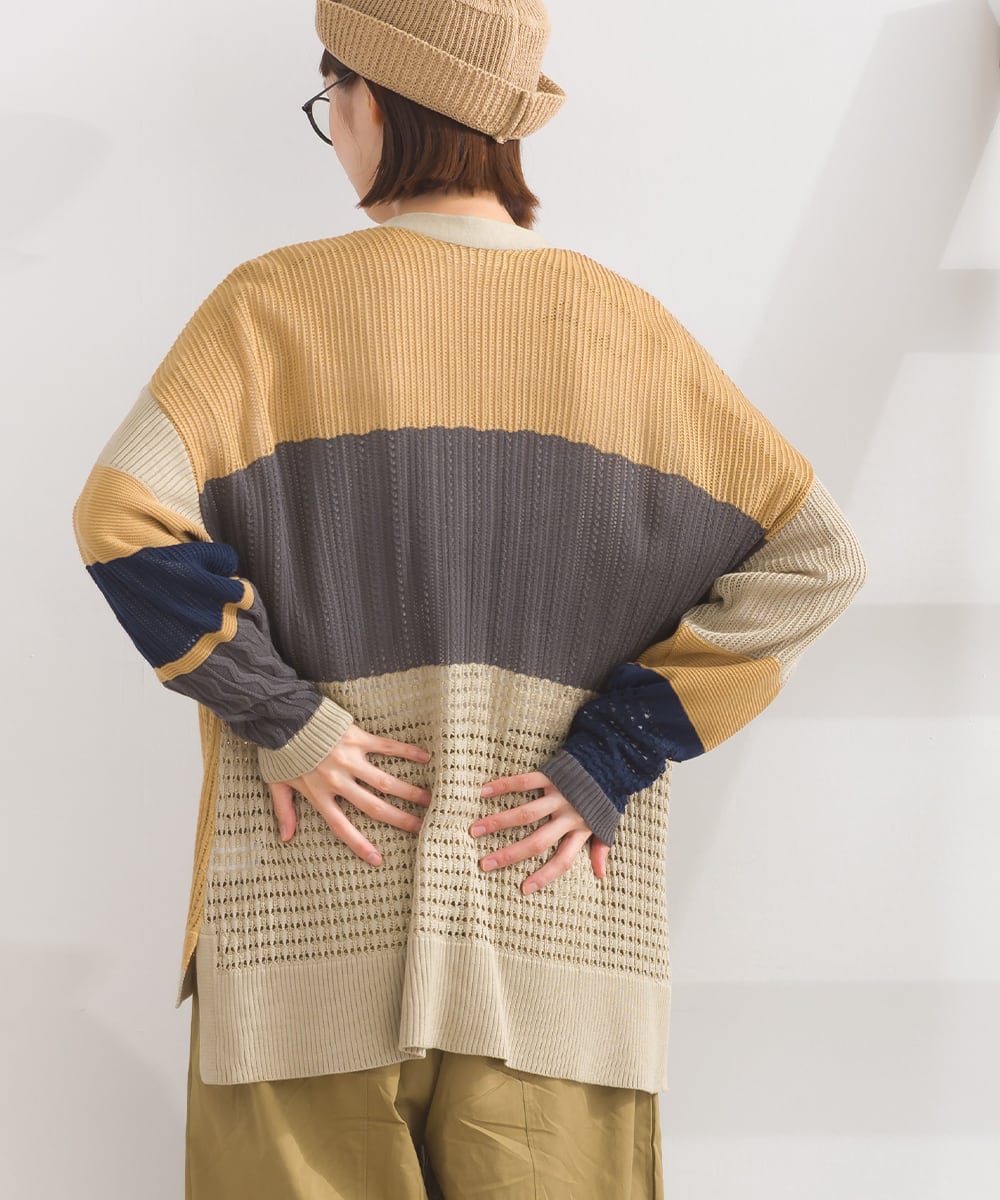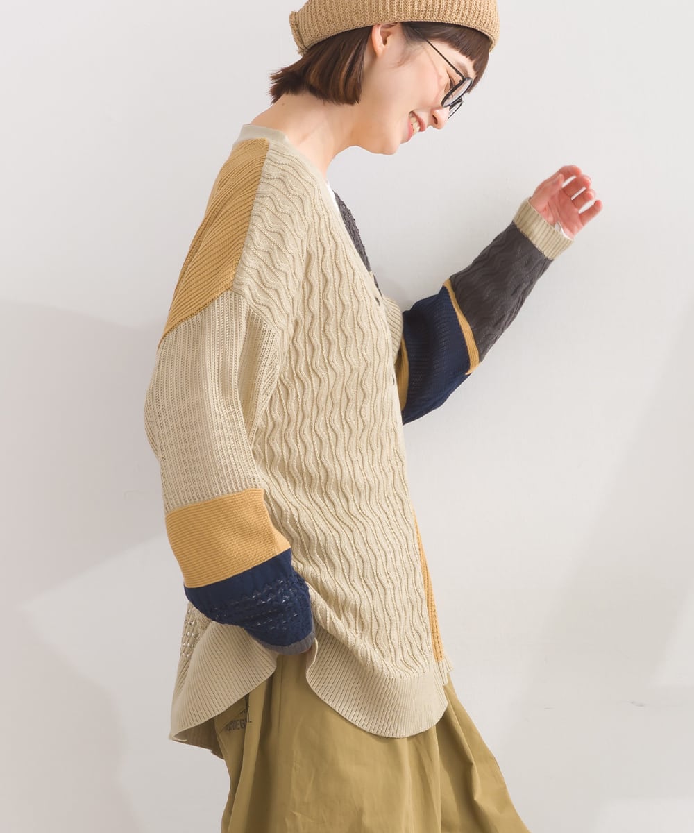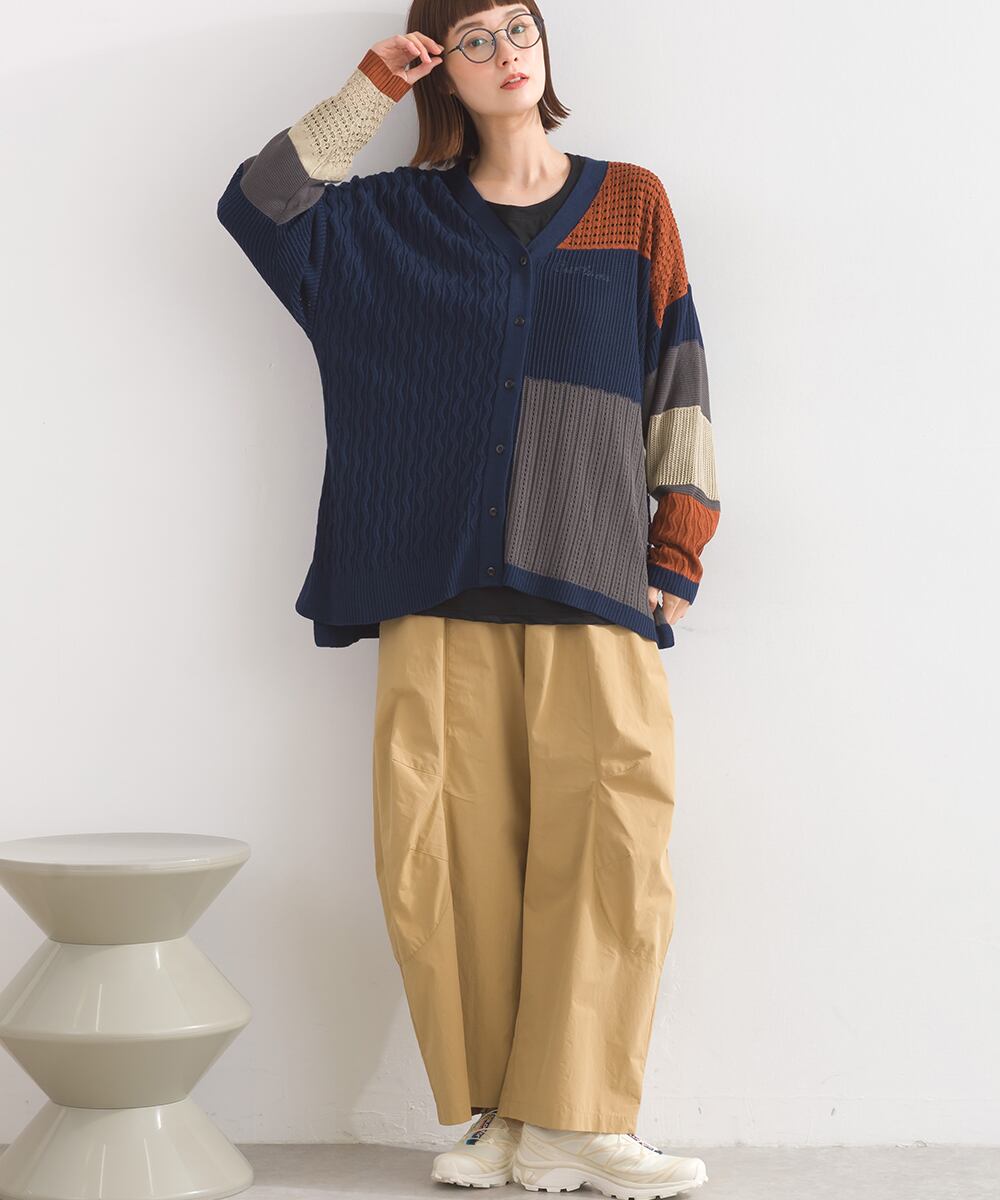 異なる編み地とカラーを組み合わせた、存在感のあるVネックカーディガン。
