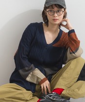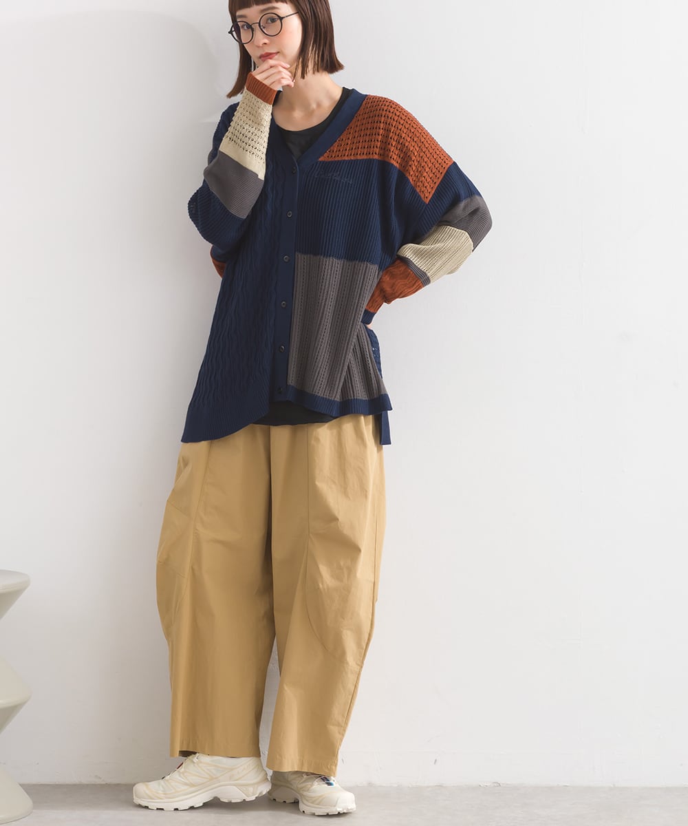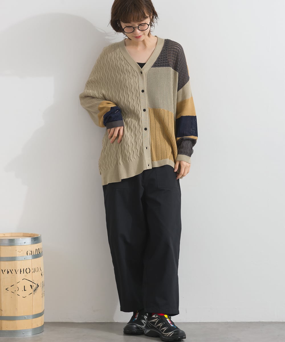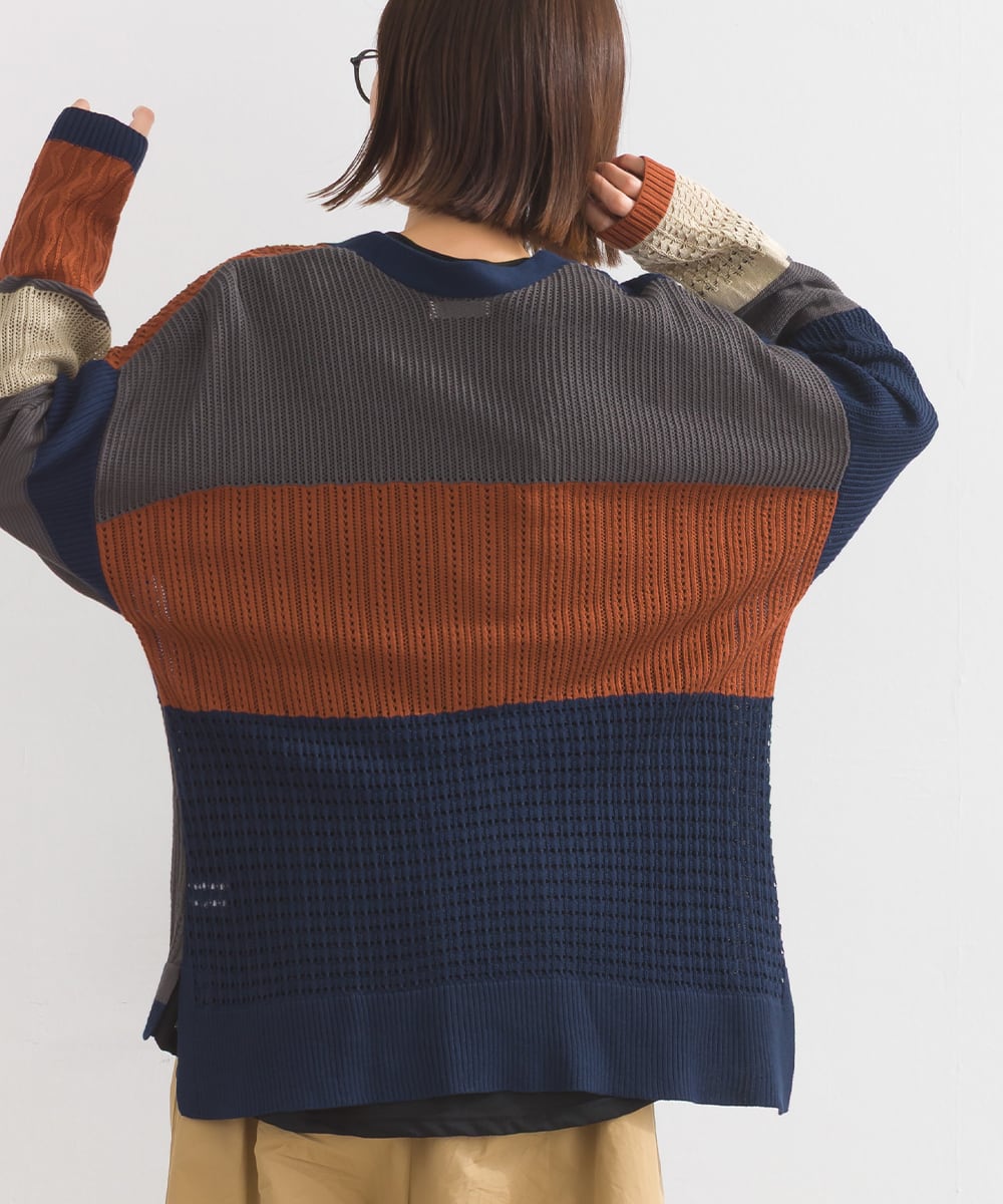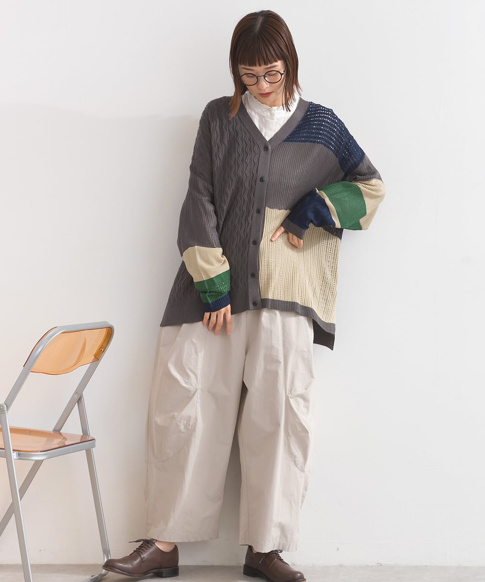 異なる編み地とカラーを組み合わせた、存在感のあるVネックカーディガン。