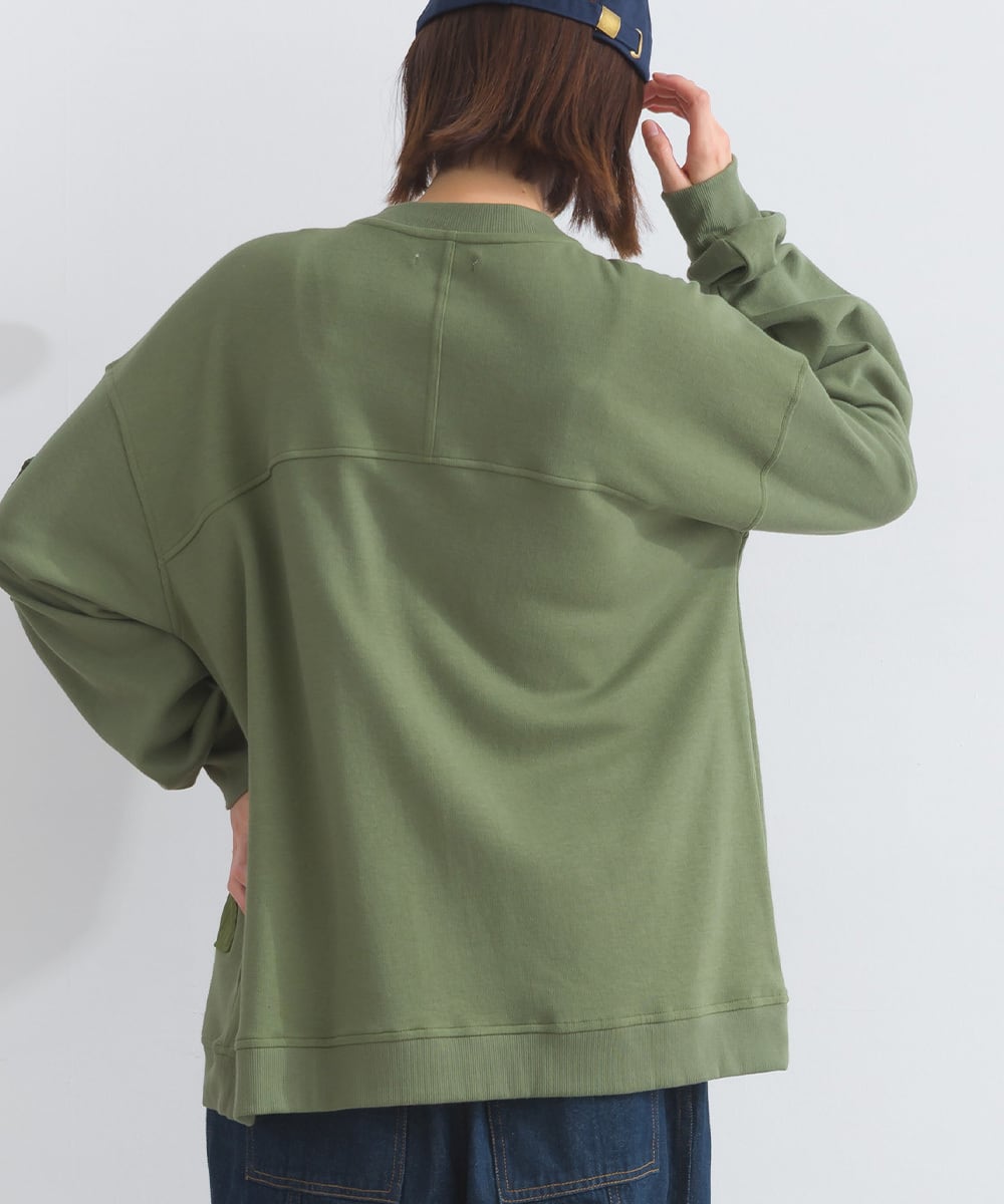 ボディ部分にはカットソー素材を使用し、ポケットや部分的に異素材をプラスすることで、立体感と動きのある表情になっています。