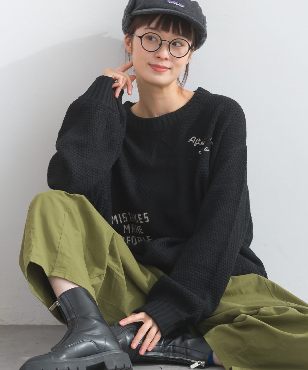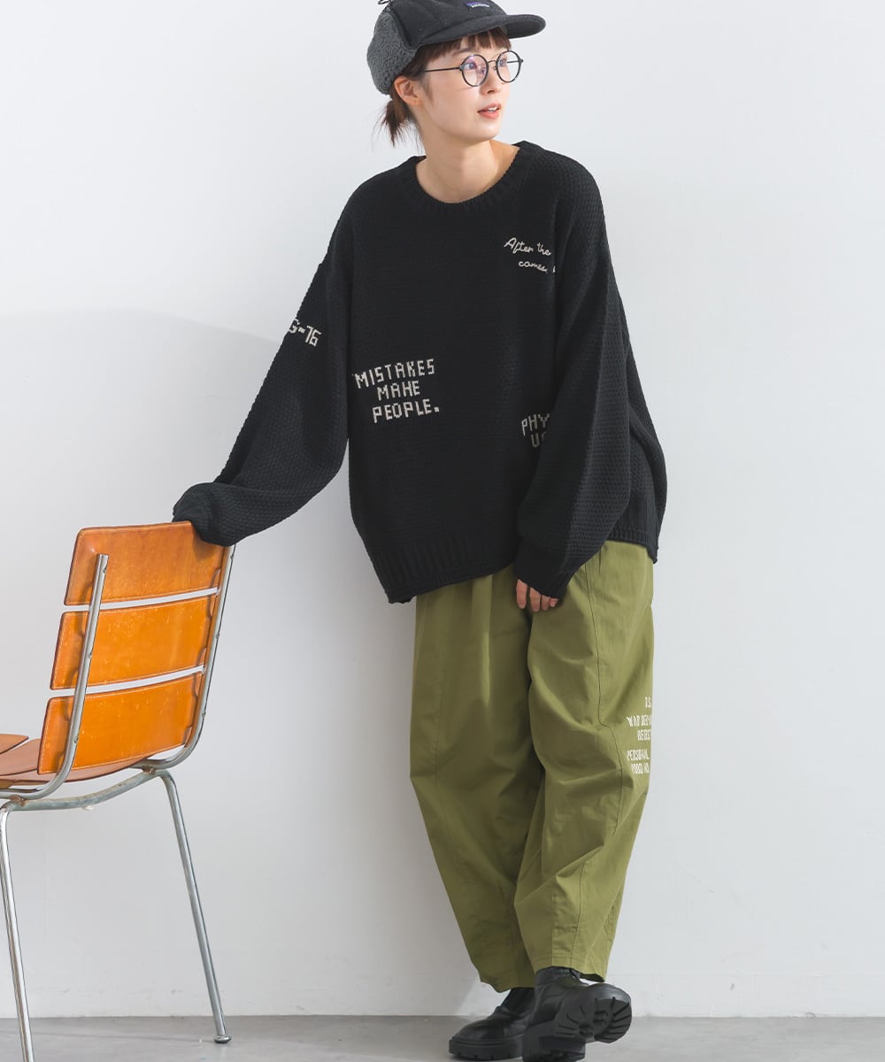 2025秋冬新作 2025AW オーバーサイズ ワンマイルウエア iriey アイリー ナチュラル カジュアル 体型カバー セーター ニットプルオーバー 透かし編み ハシゴジャカード ジャカード ランダムロゴ ニット 人気