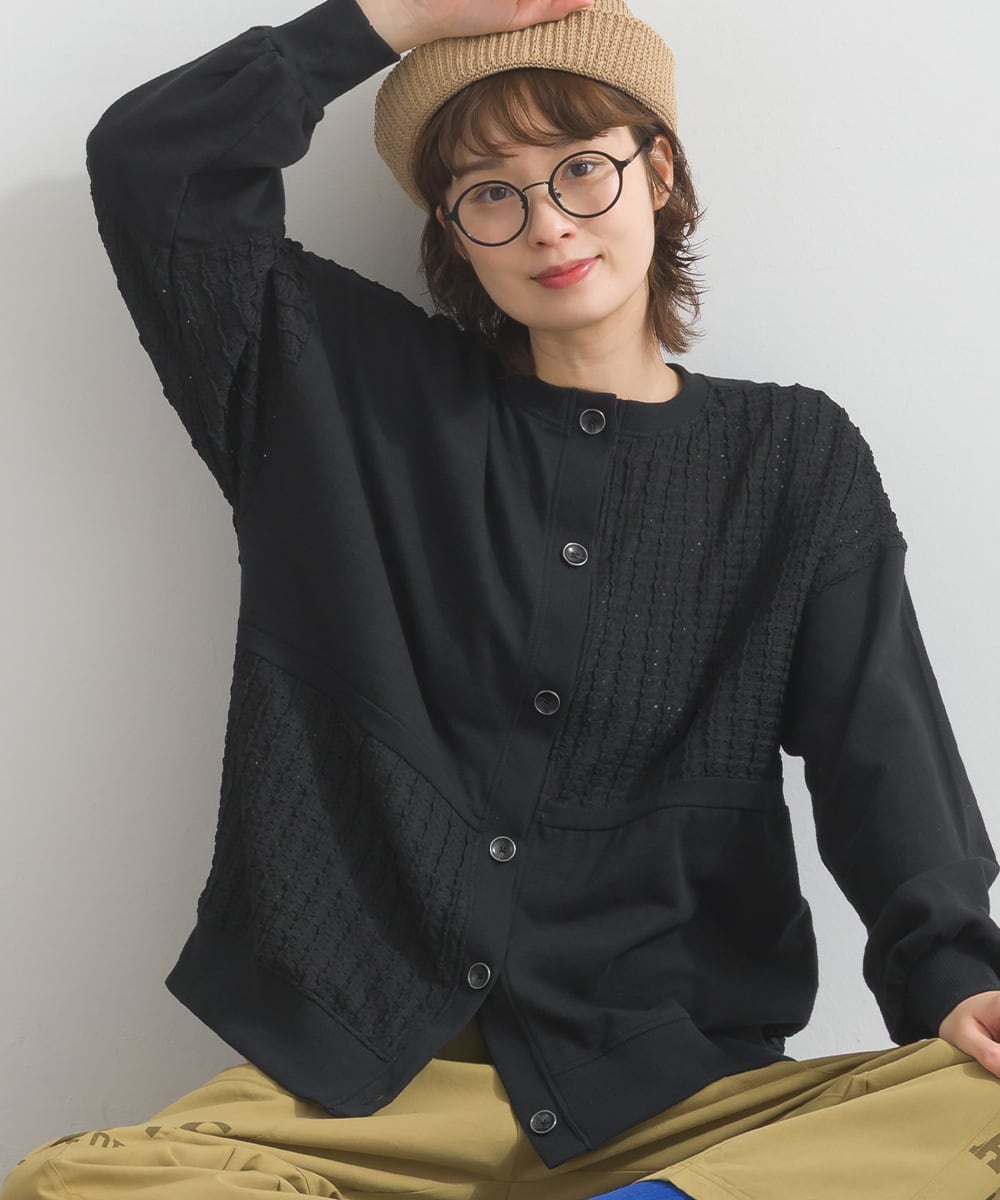 K53020 梨地異素材ブロック切替2WAYカーディガン / Textured Fabric Block Panel 2-Way Cardigan