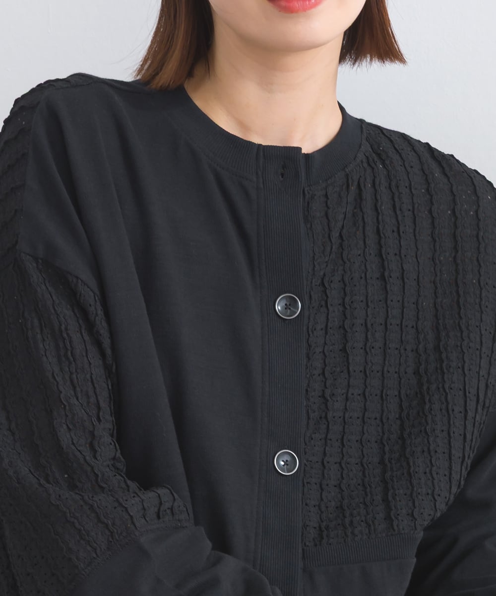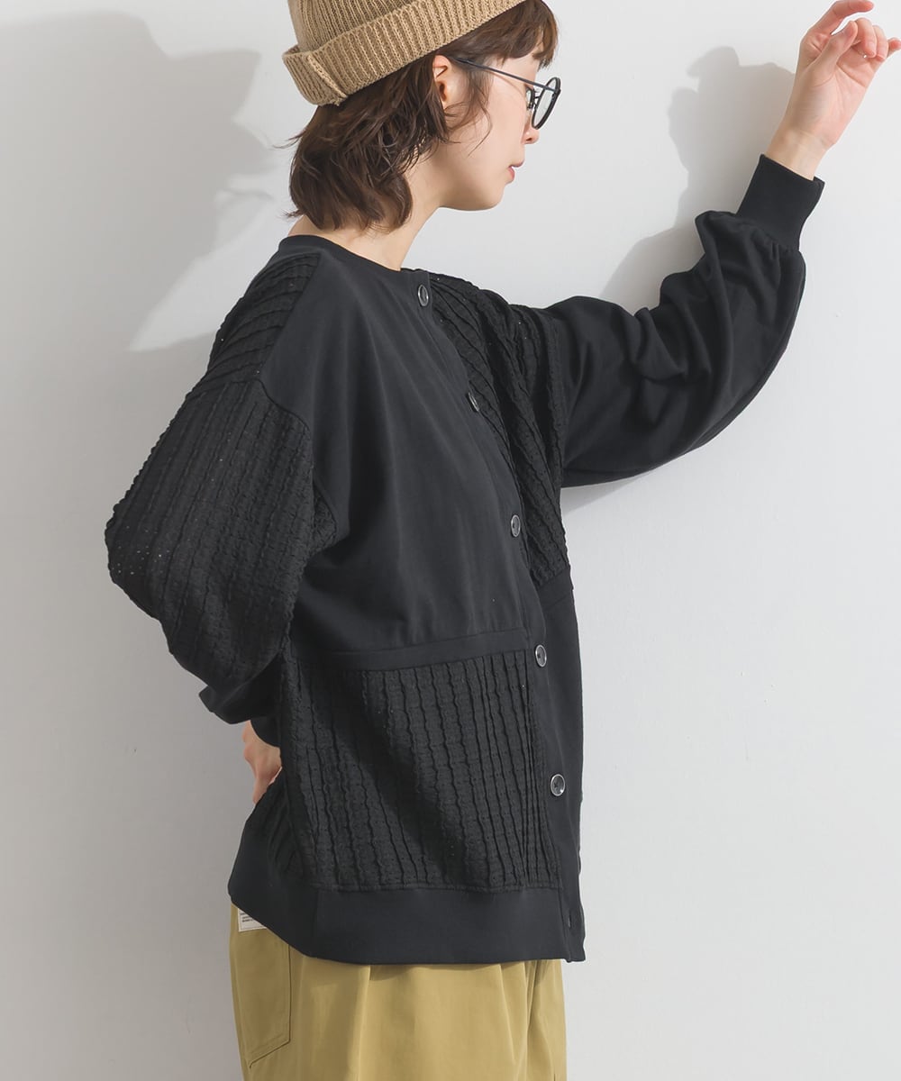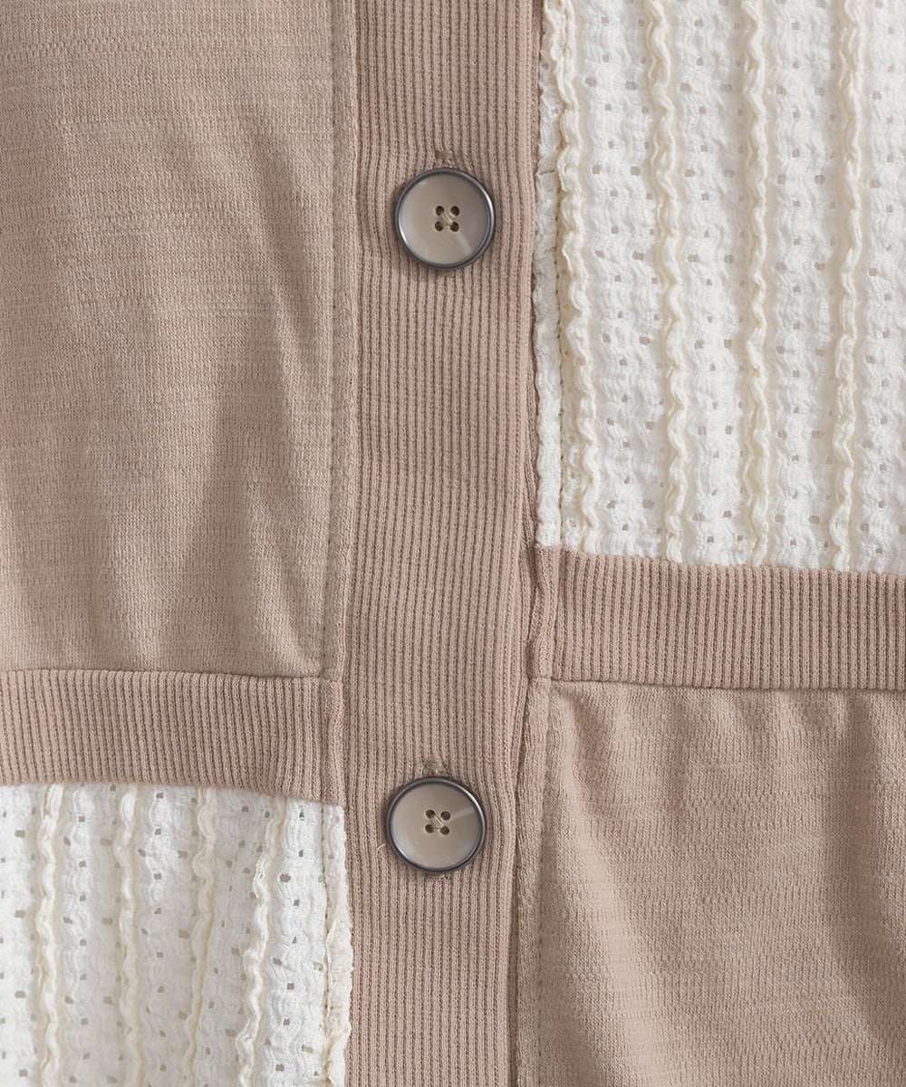 Crafted with textured crepe fabric as the base, this cardigan features block panels of different materials with a unique surface texture.