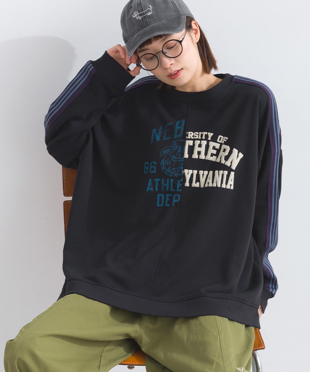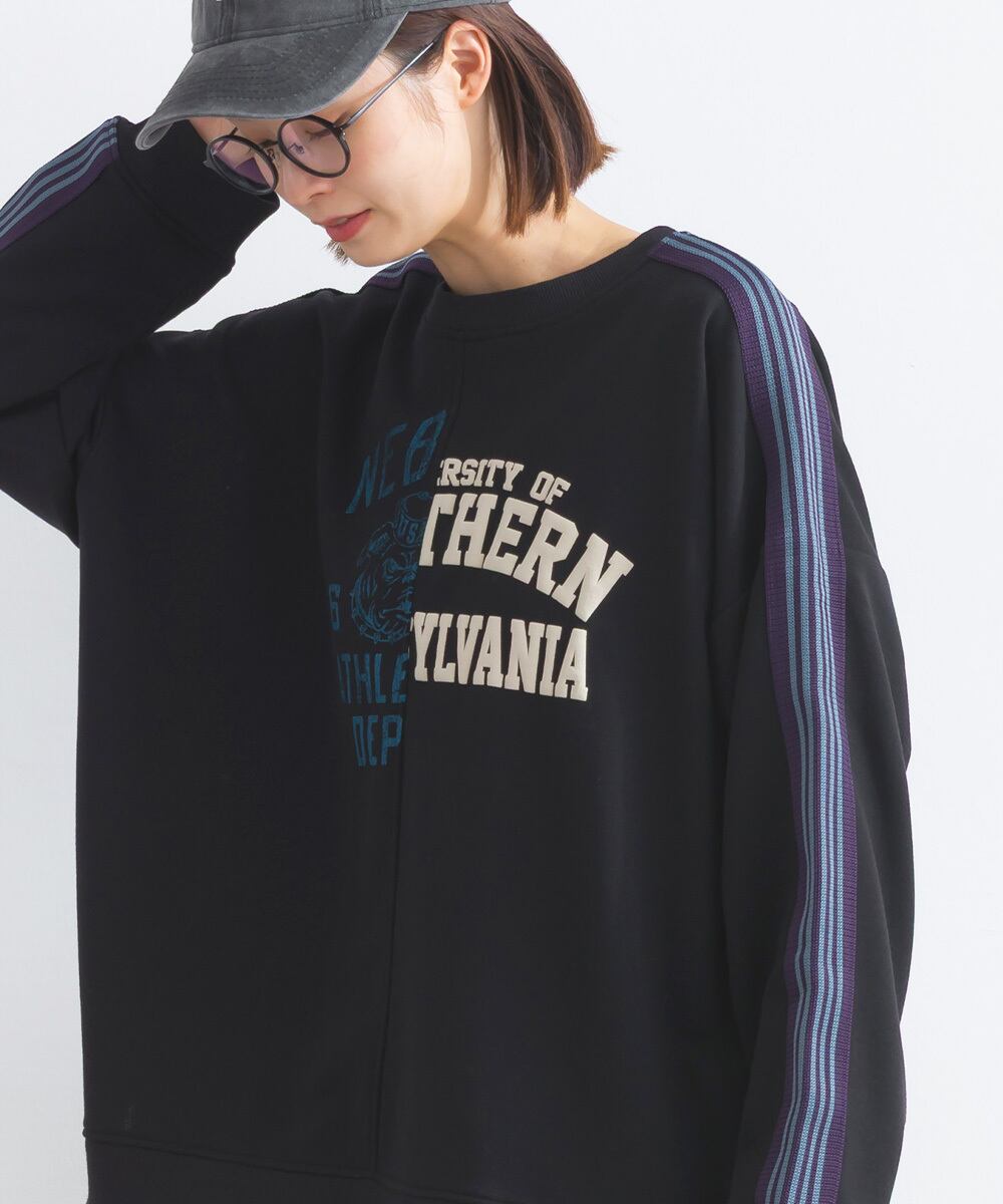 フロントにあしらわれたカレッジライクなロゴと、左右で異なる袖・身頃の切替が目を惹く主役トップス。