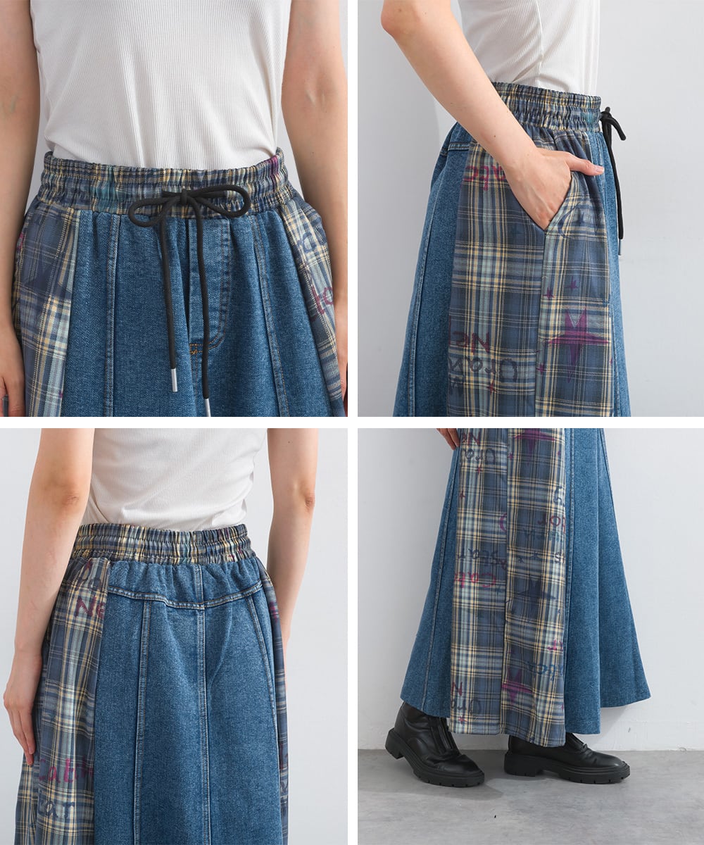デニム×チェック切替スカート