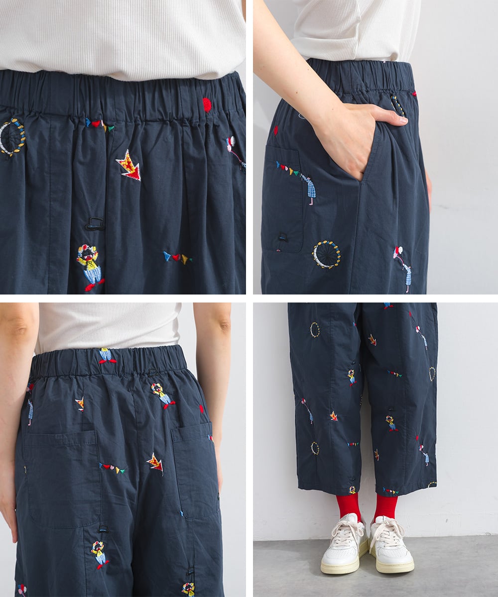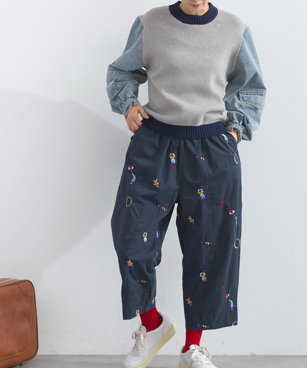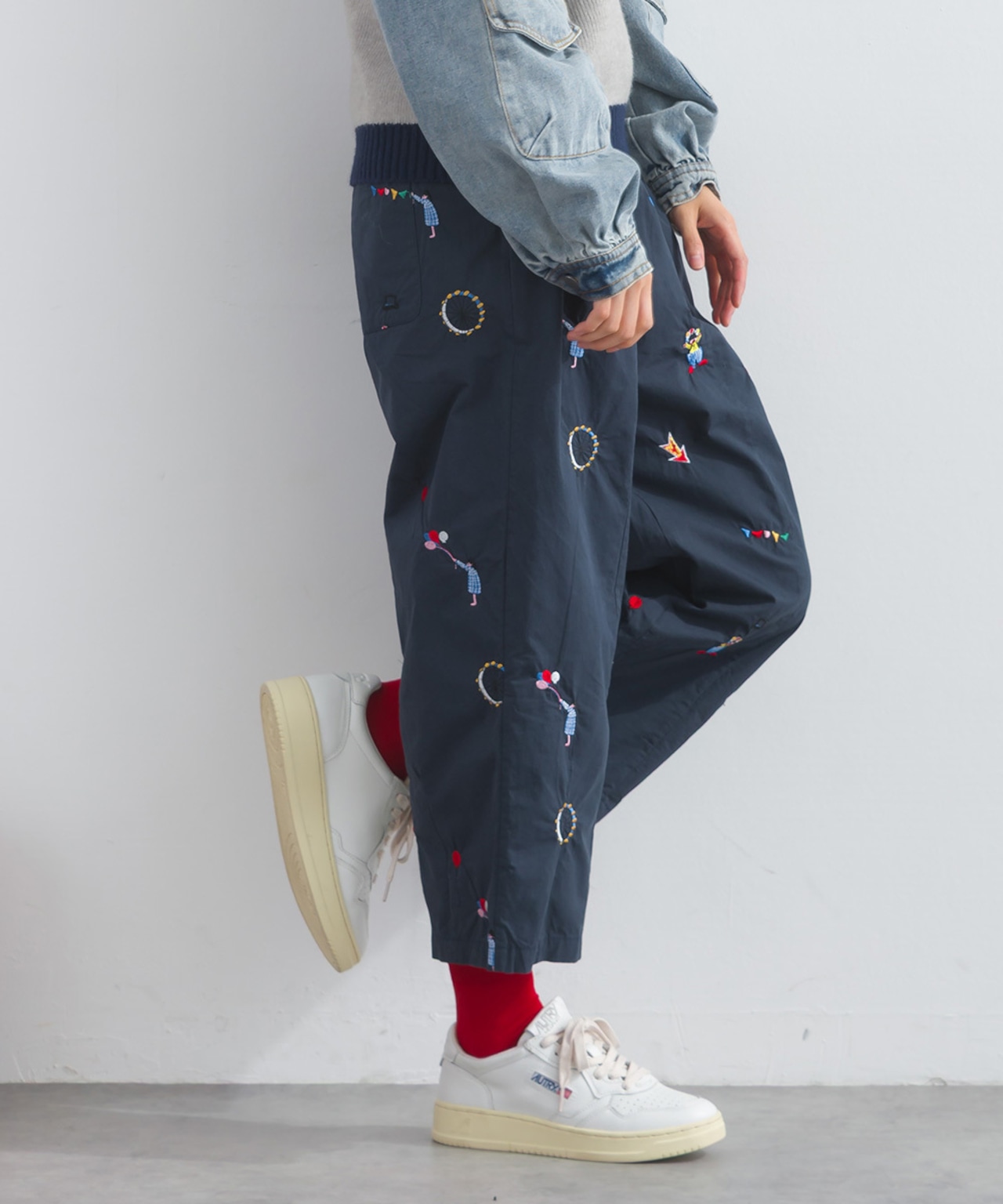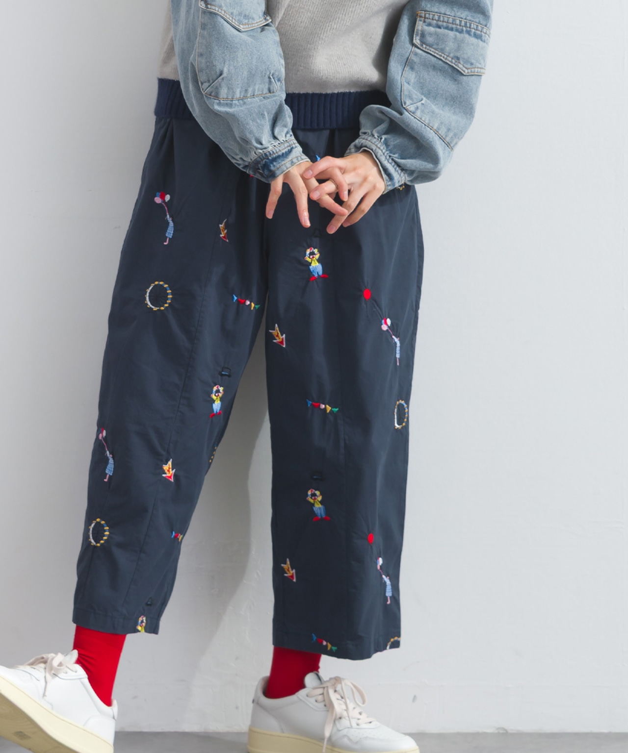 キャッチーなサーカス風総柄刺繍を散りばめたステッチパンツ。