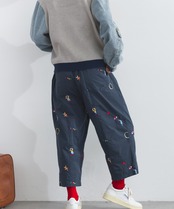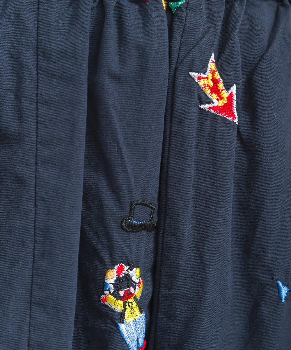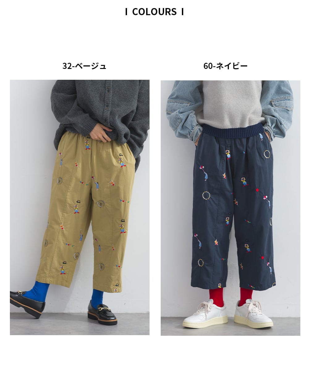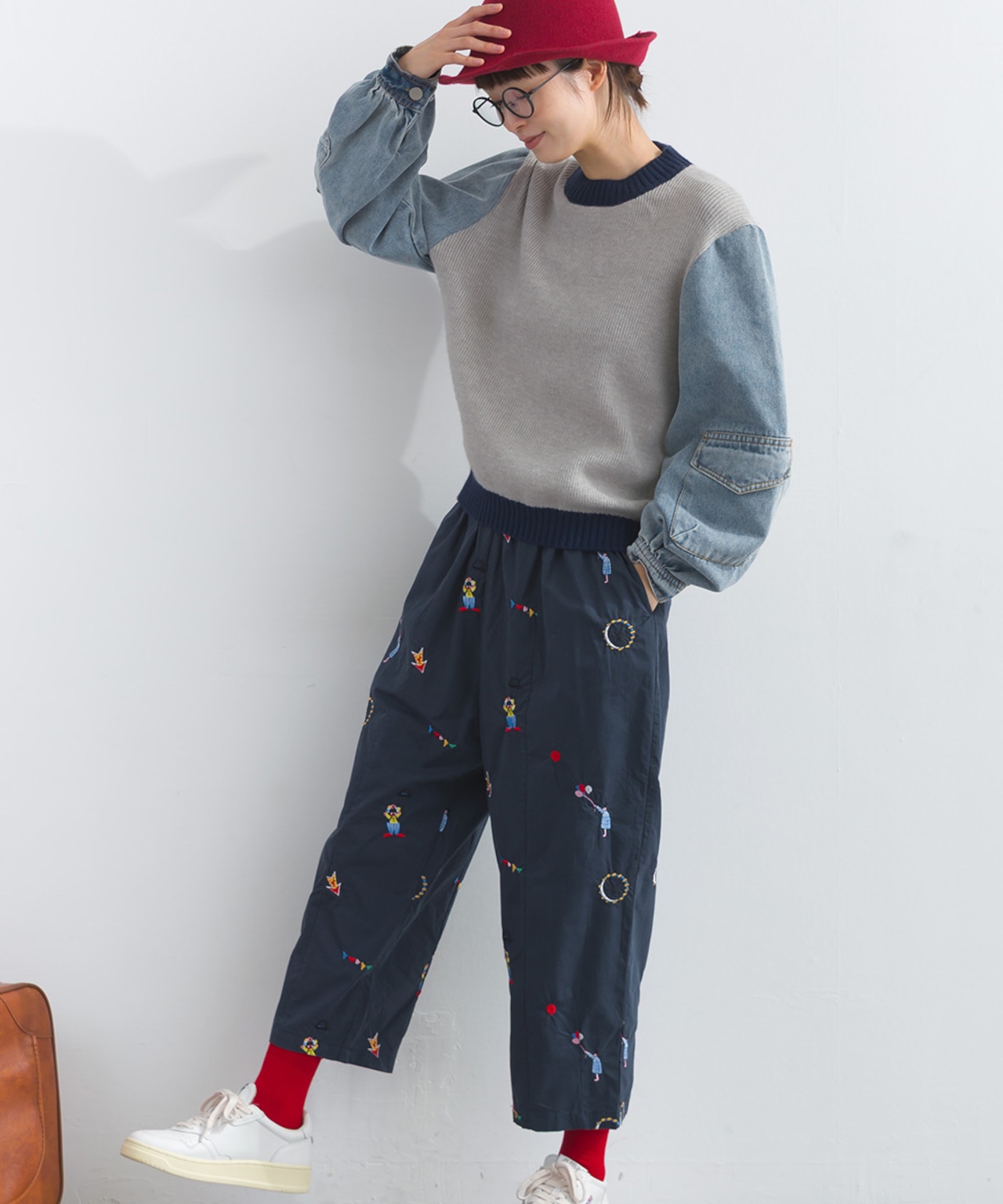 キャッチーなサーカス風総柄刺繍を散りばめたステッチパンツ。
