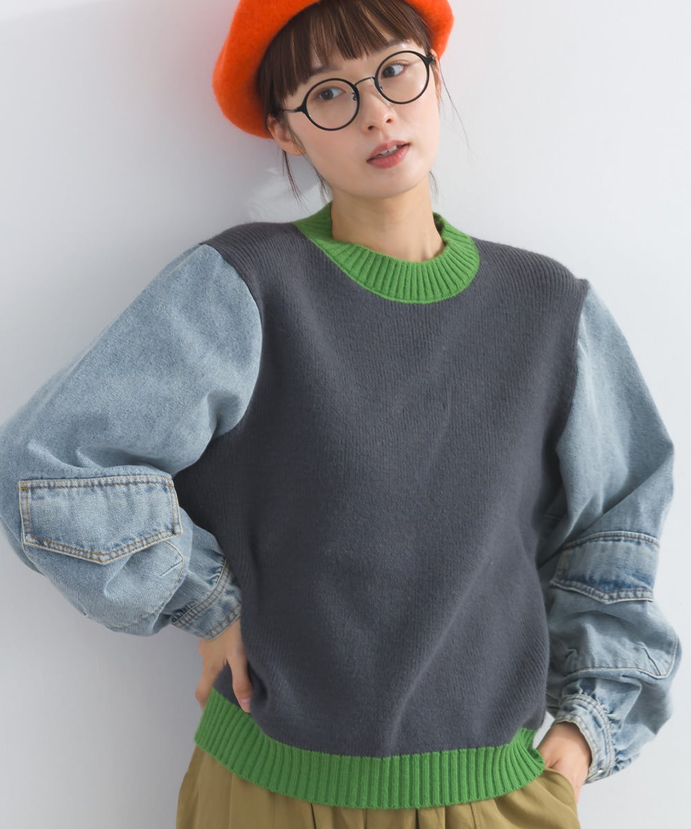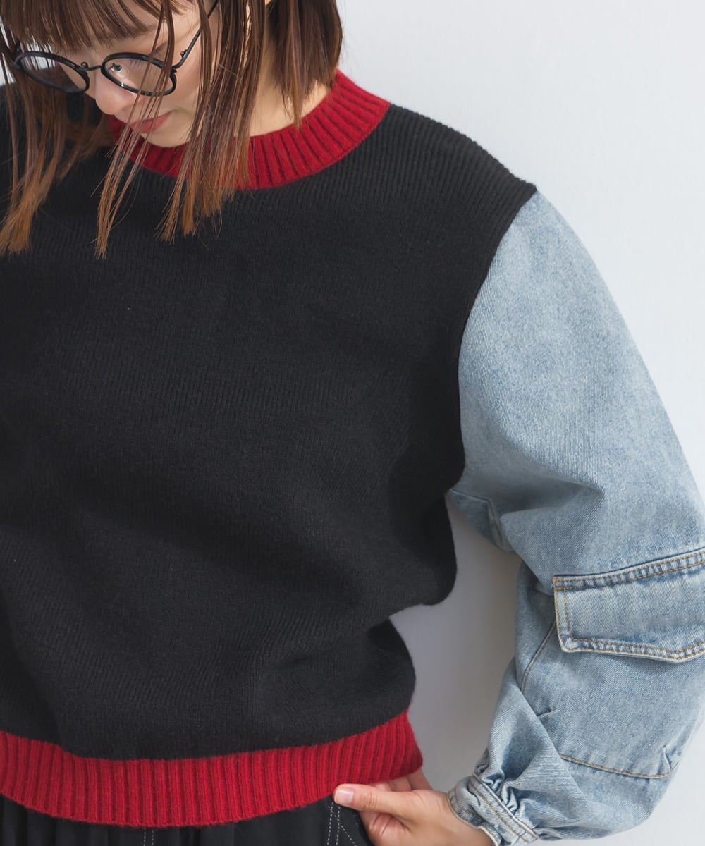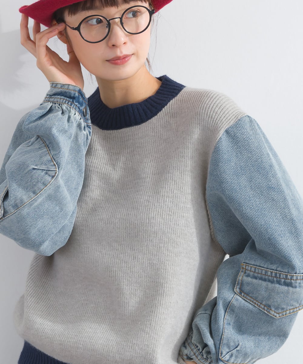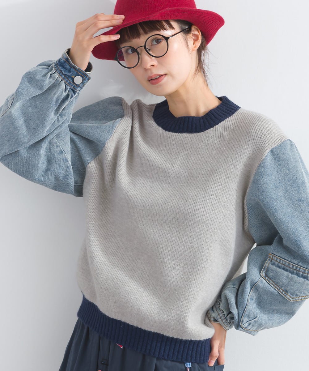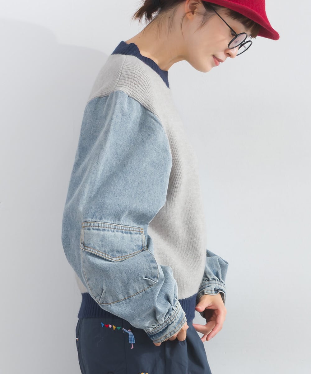 本体は柔らかなニット素材を使用し、袖部分にはしっかりとしたデニム生地を切替え。