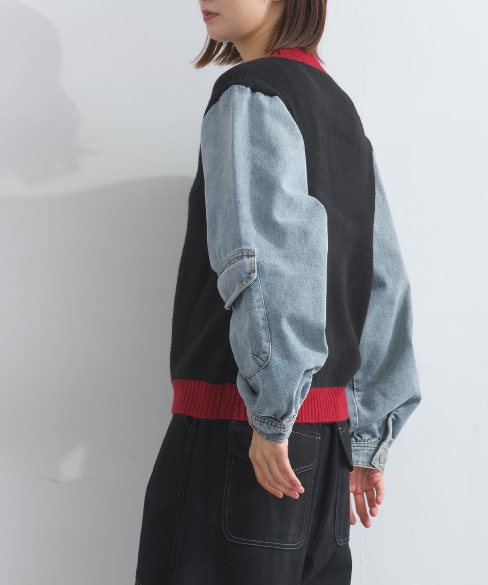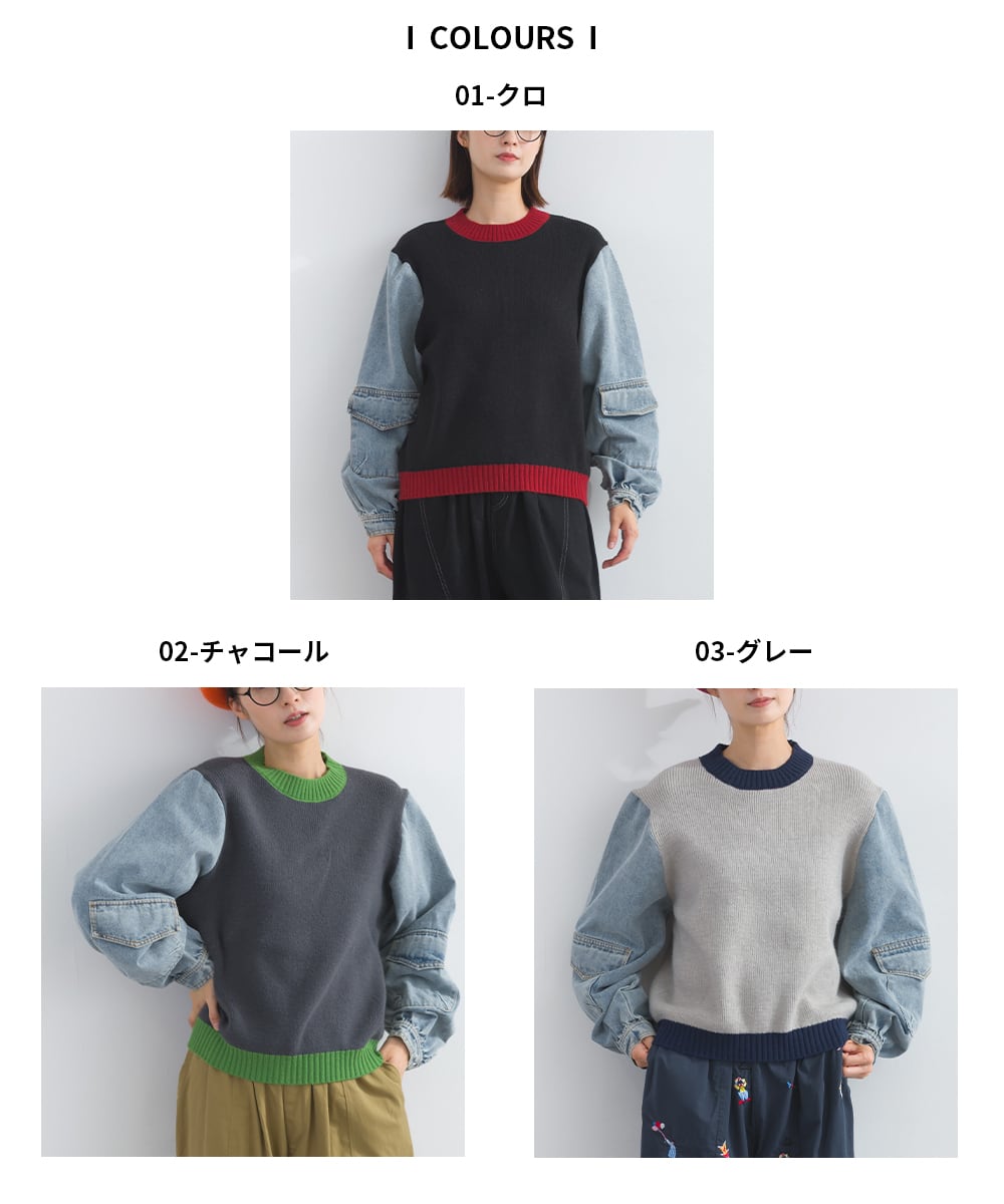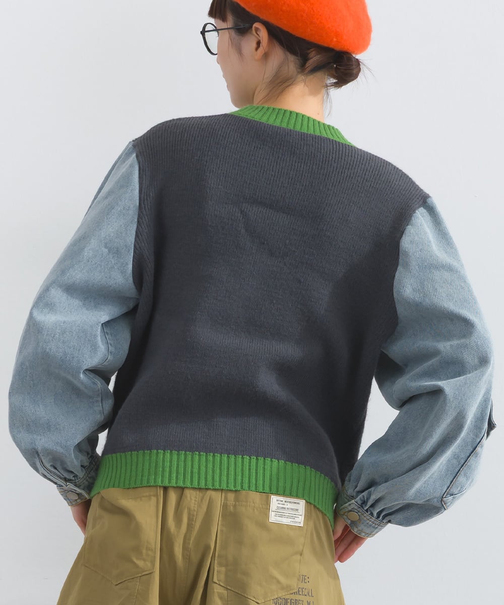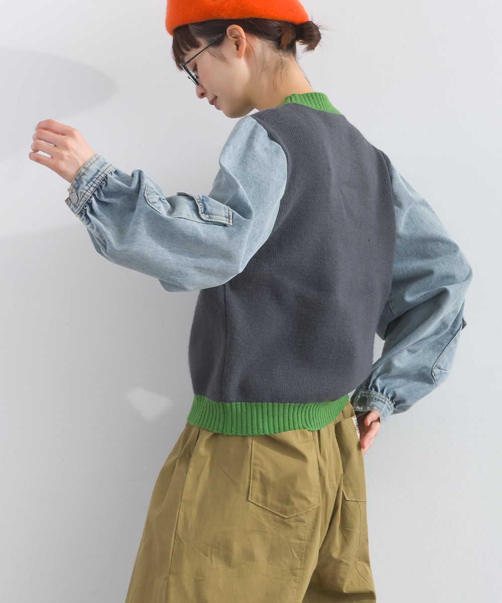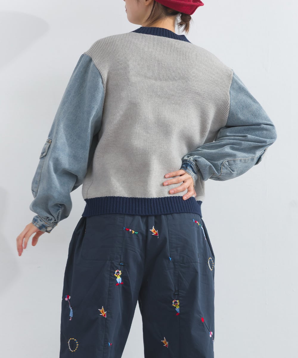 本体は柔らかなニット素材を使用し、袖部分にはしっかりとしたデニム生地を切替え。