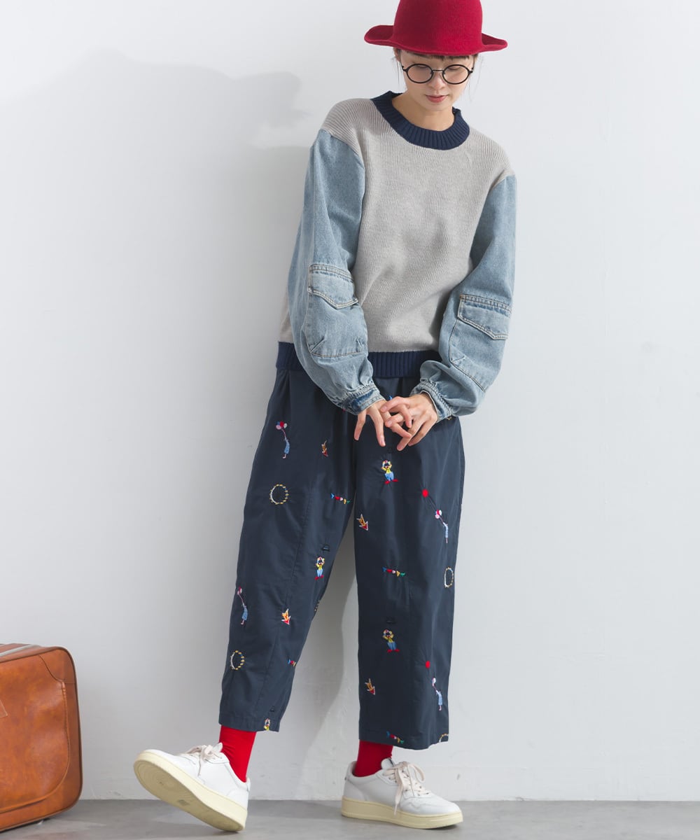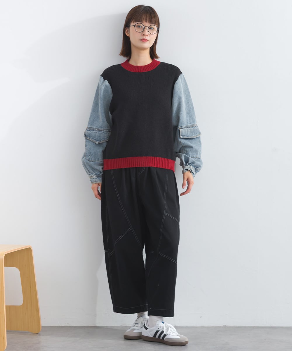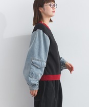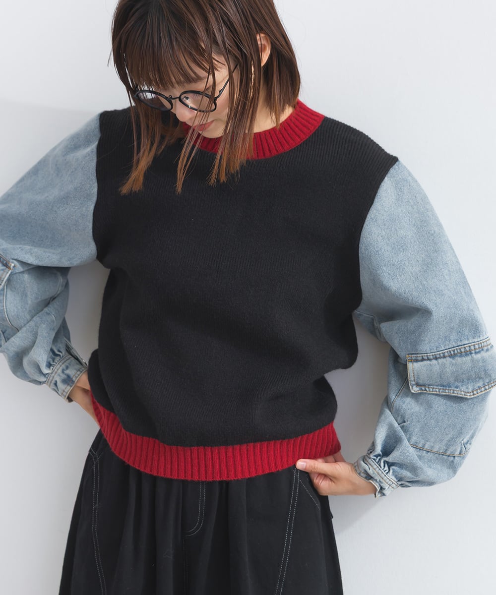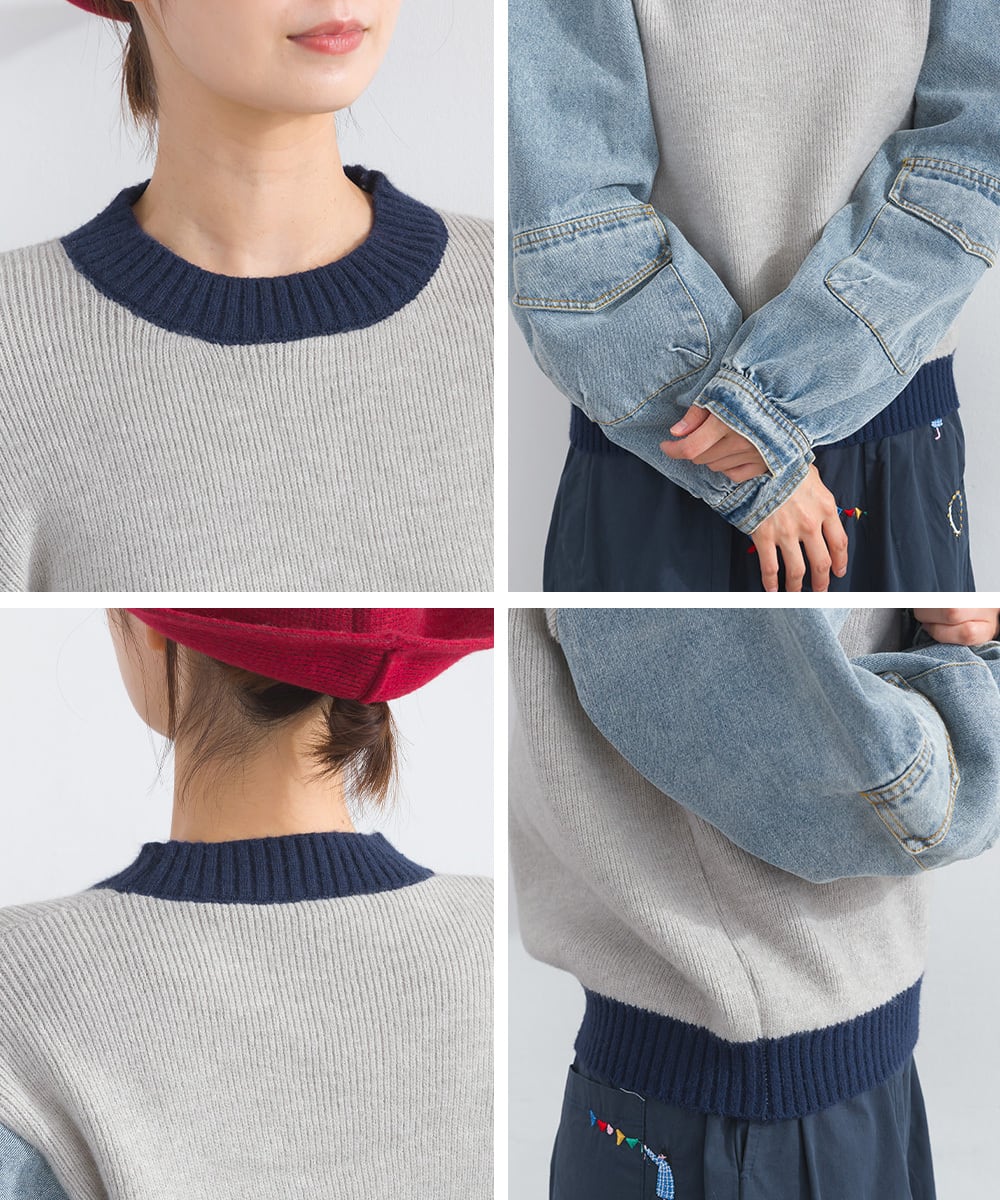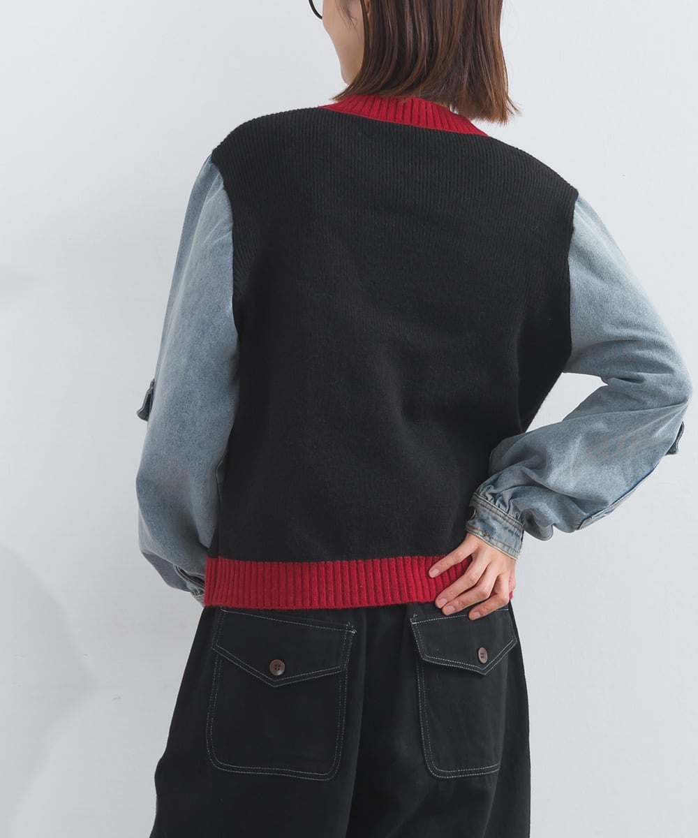 本体は柔らかなニット素材を使用し、袖部分にはしっかりとしたデニム生地を切替え。