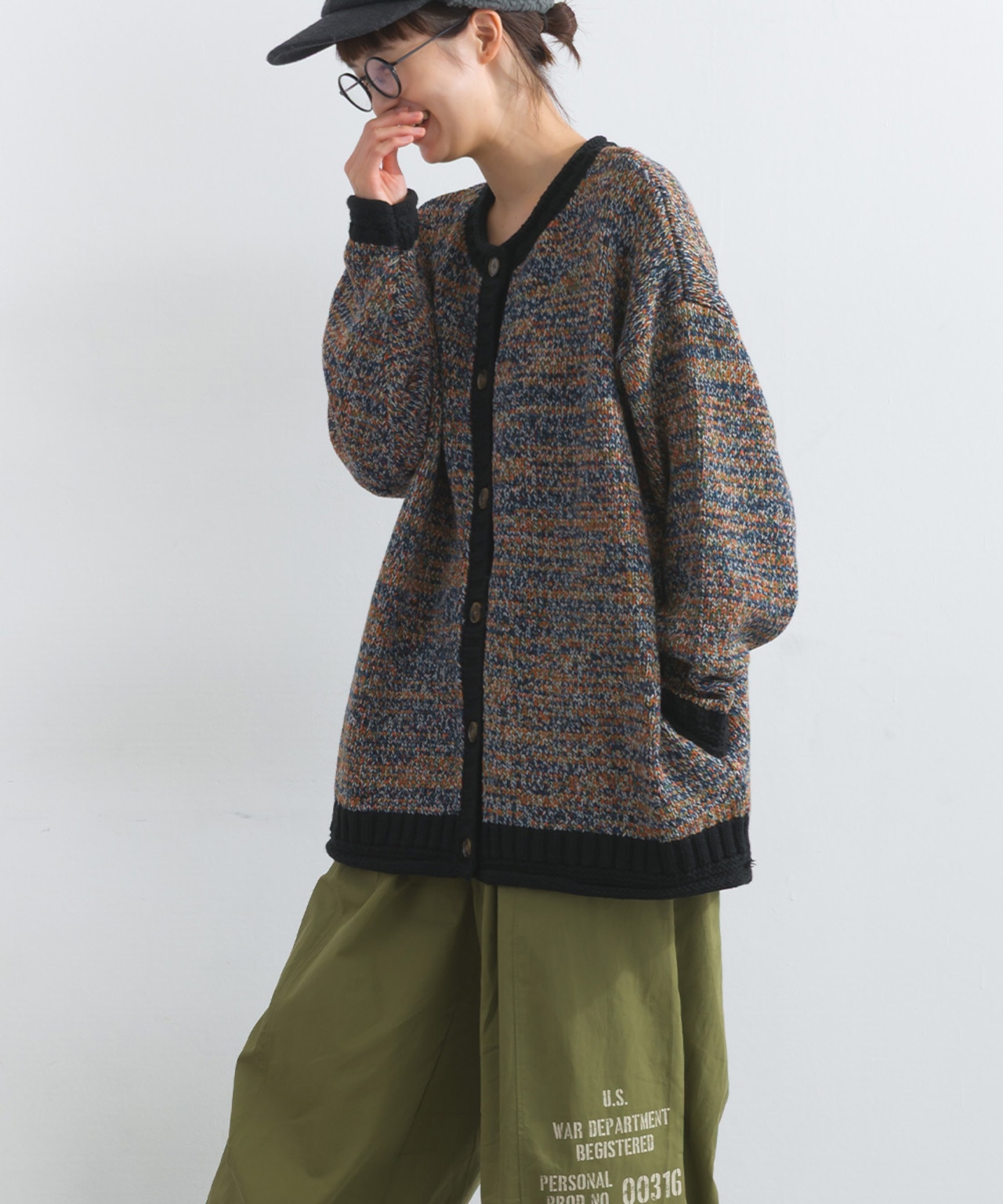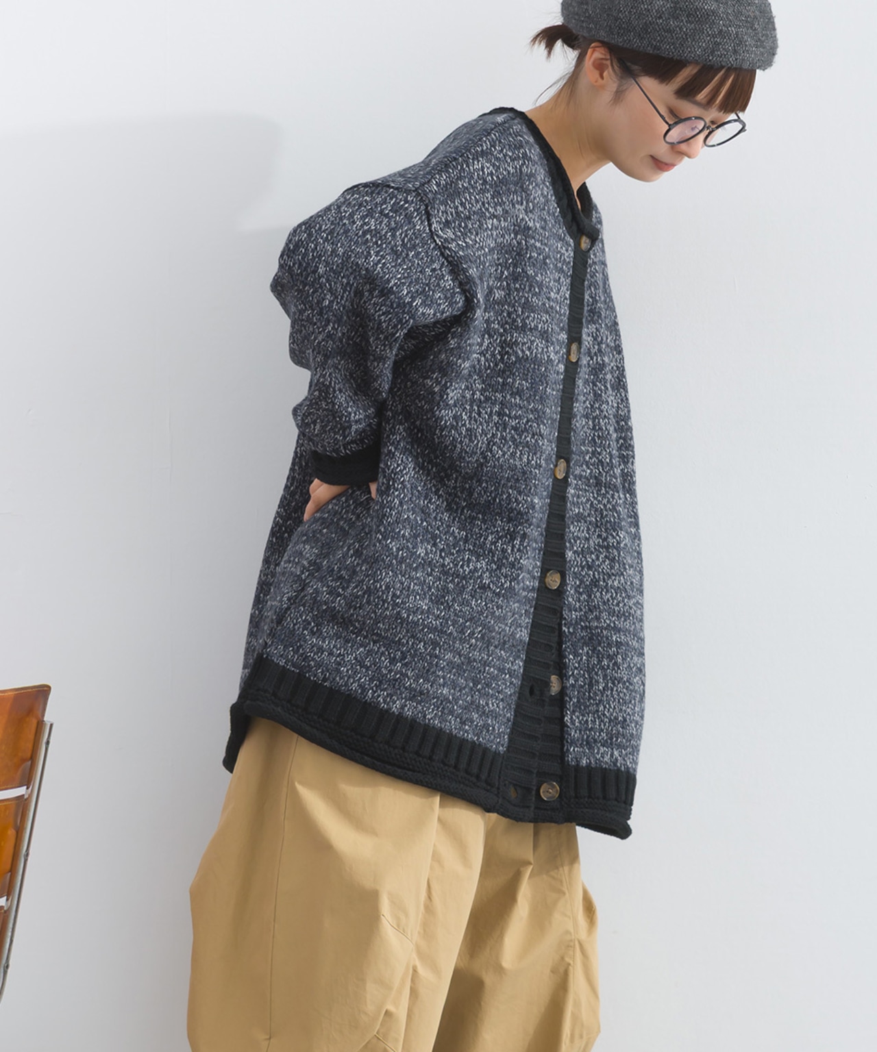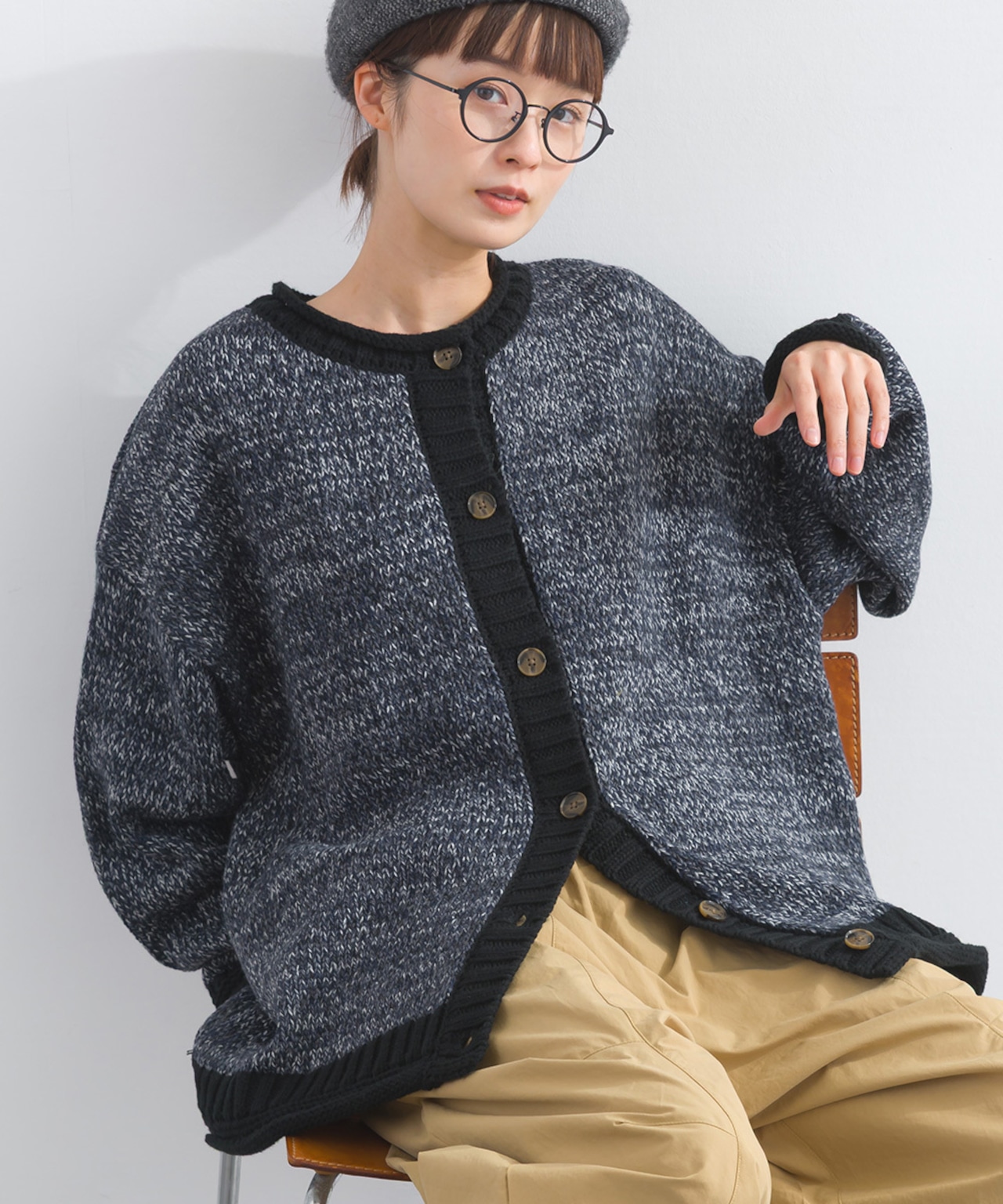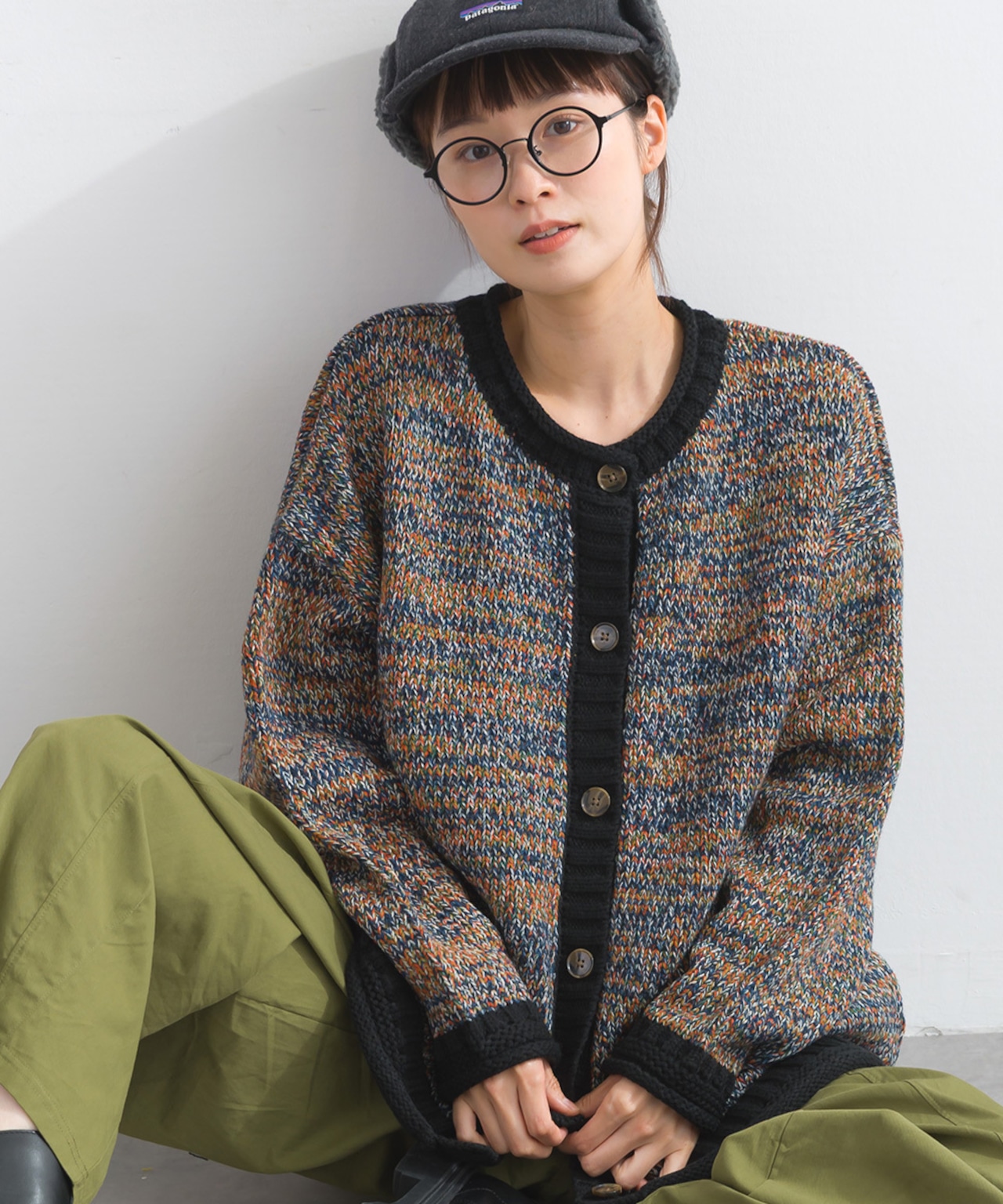 2025AW 2025秋冬新作 秋冬コーデ オーバーサイズ ワンマイルウエア iriey アイリー カジュアル ナチュラル ミセス ゆったり 体型カバー ゆったりシルエット カジュアルスタイル レイヤードコーデ ナチュラル服 着回しコーデ 大人カジュアル おうちコーデ 旅行コーデ おしゃれコーデ リラックスウェア デイリーコーデ 楽ちんコーデ ストリートミックス ミックスニット 配色カーデ ロール始末 前開きニット ドロップショルダー 配色ボタン ニットカーデ 軽アウター