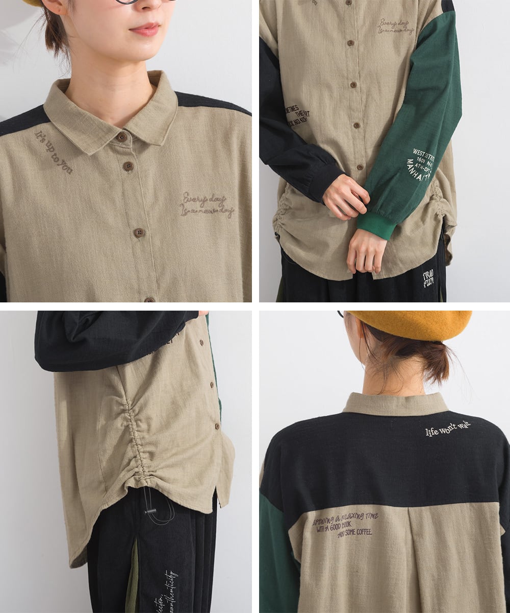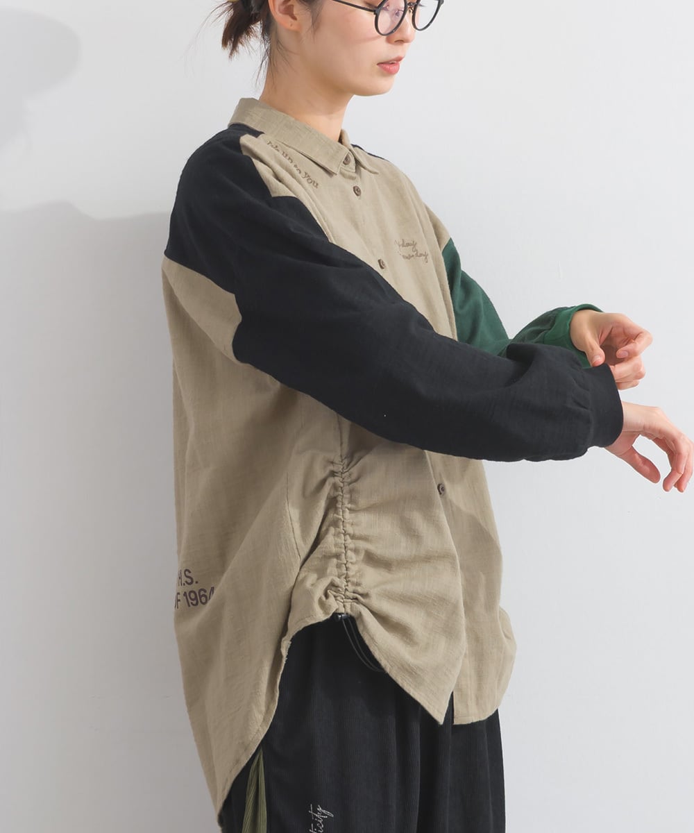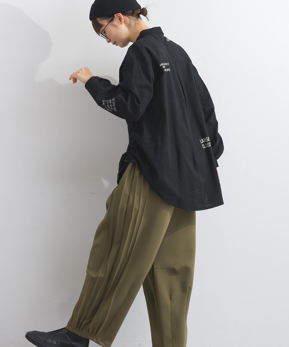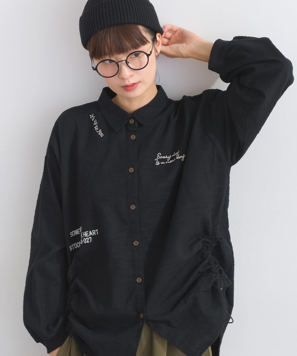 K53101 無地スラブ起毛ランダムロゴシャーリングシャツ / Solid Slub Brushed Random Logo Shirring Shirt