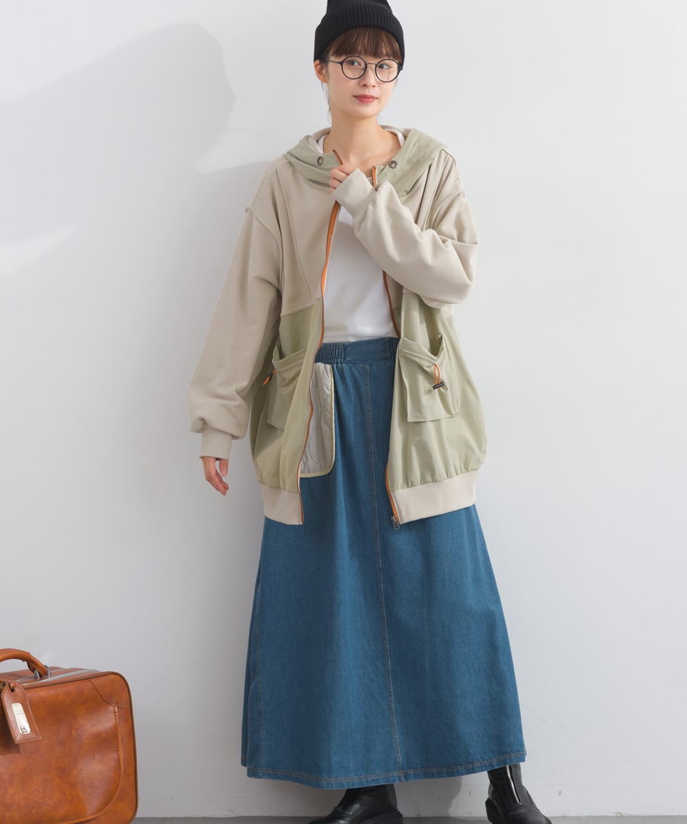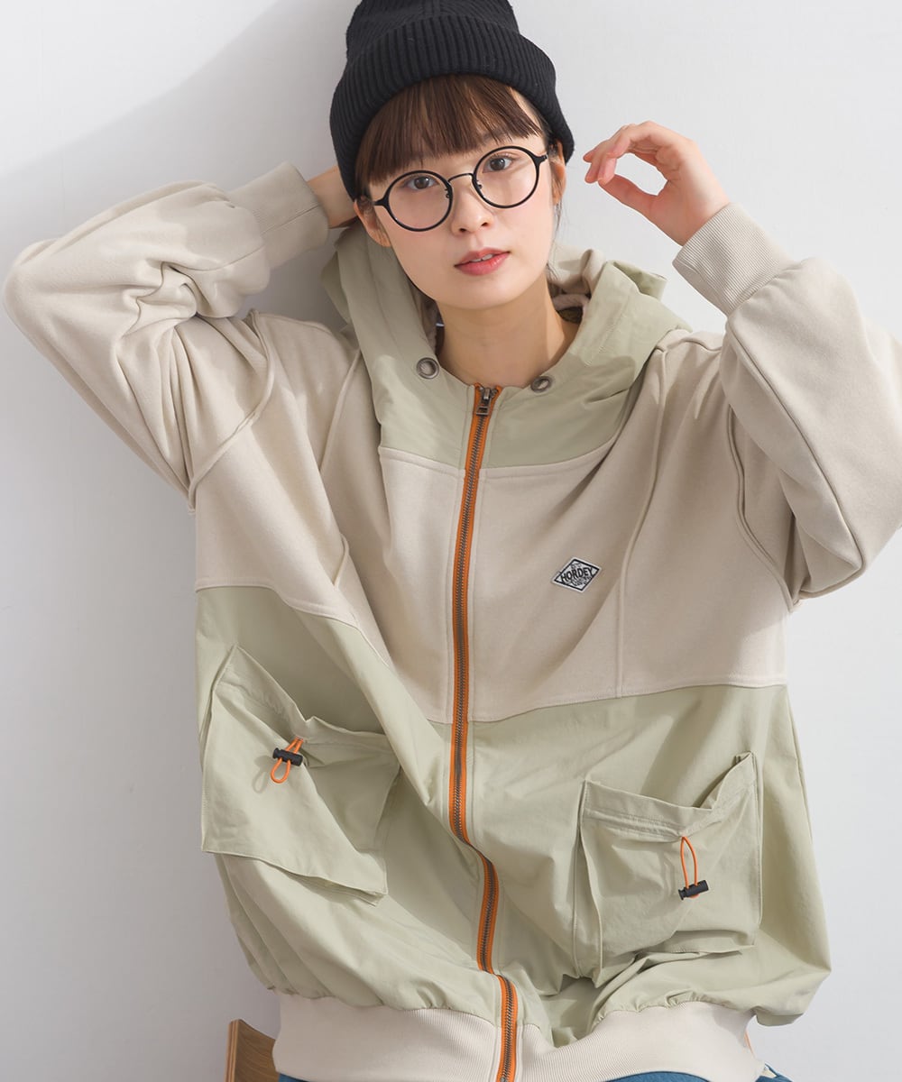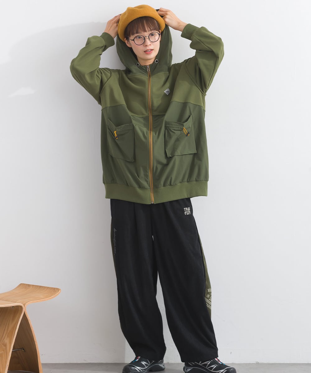 ボディはCT裏毛(程よい厚みでソフトな肌触り)と、ポケット・肩・フード周りにストレッチナイロンをドッキング。