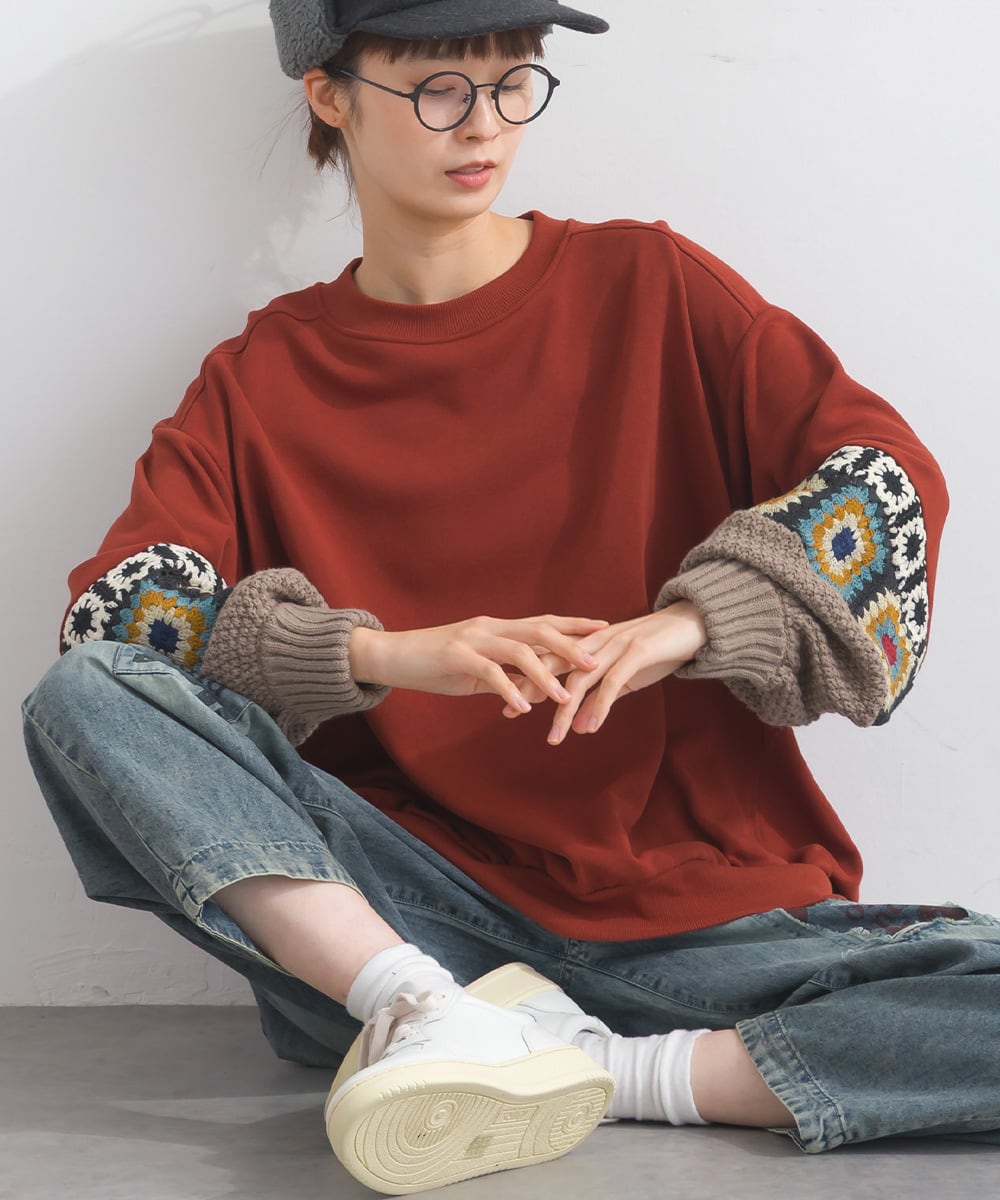 CT裏毛クロシェモチーフ袖切替スエットプルオーバー