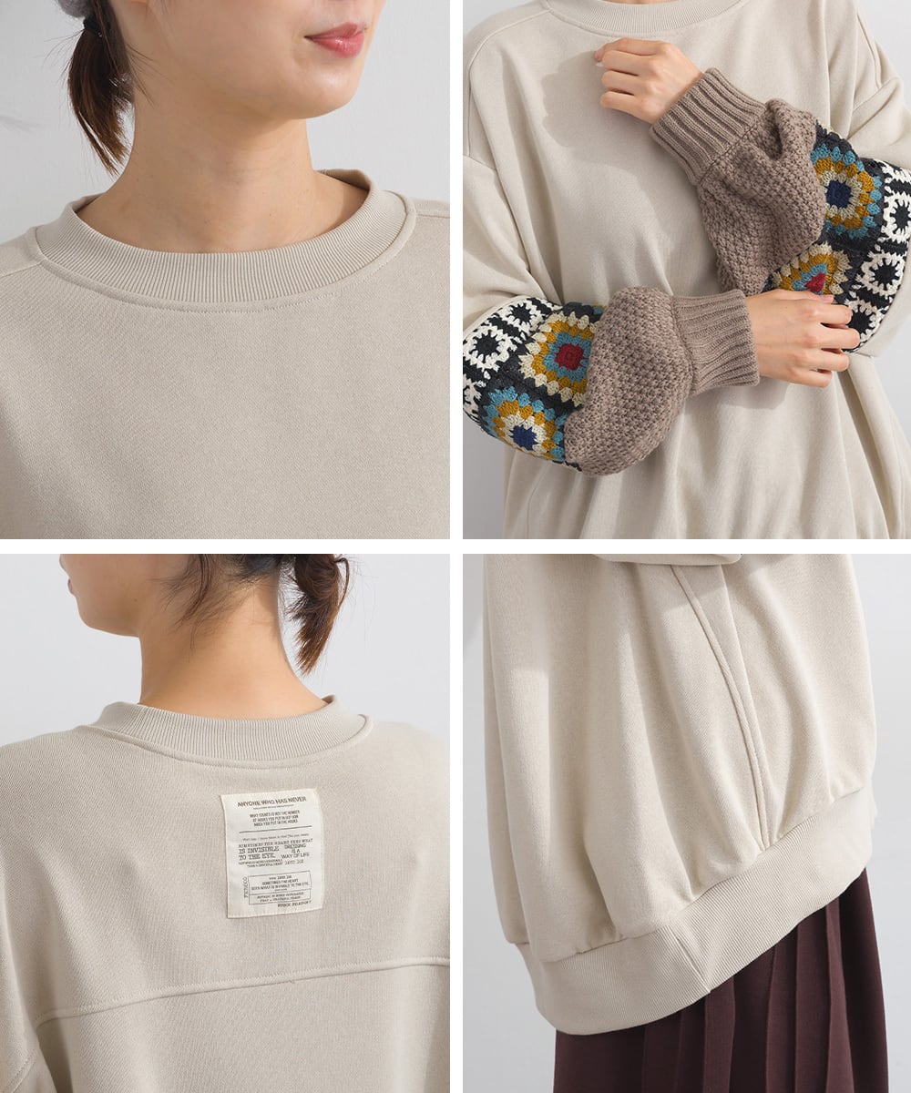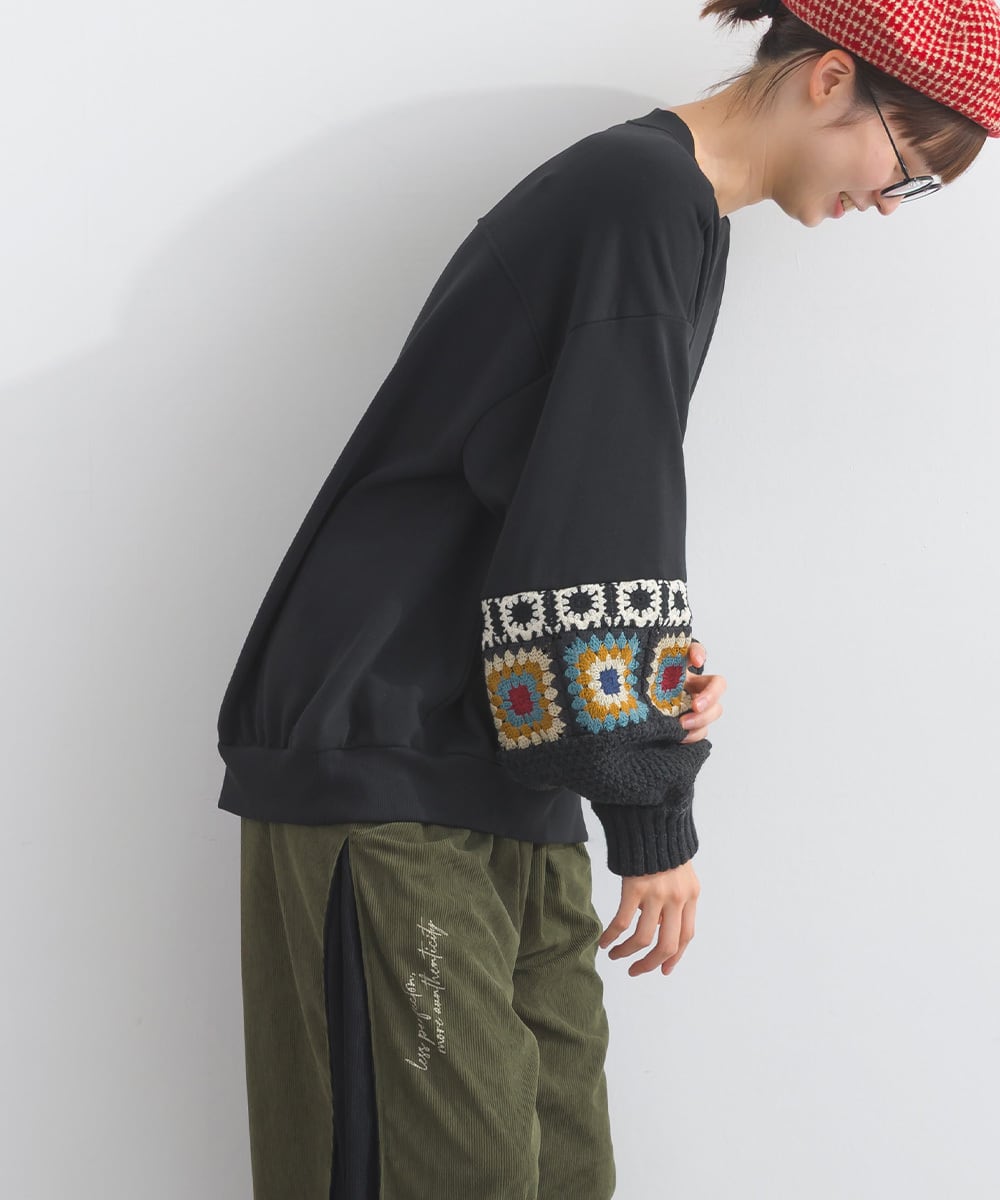 K53117 CT裏毛クロシェモチーフ袖切替スエットプルオーバー / K53117 CT Back-Fleece Crochet Motif Sleeve Switch Sweat Pullover
