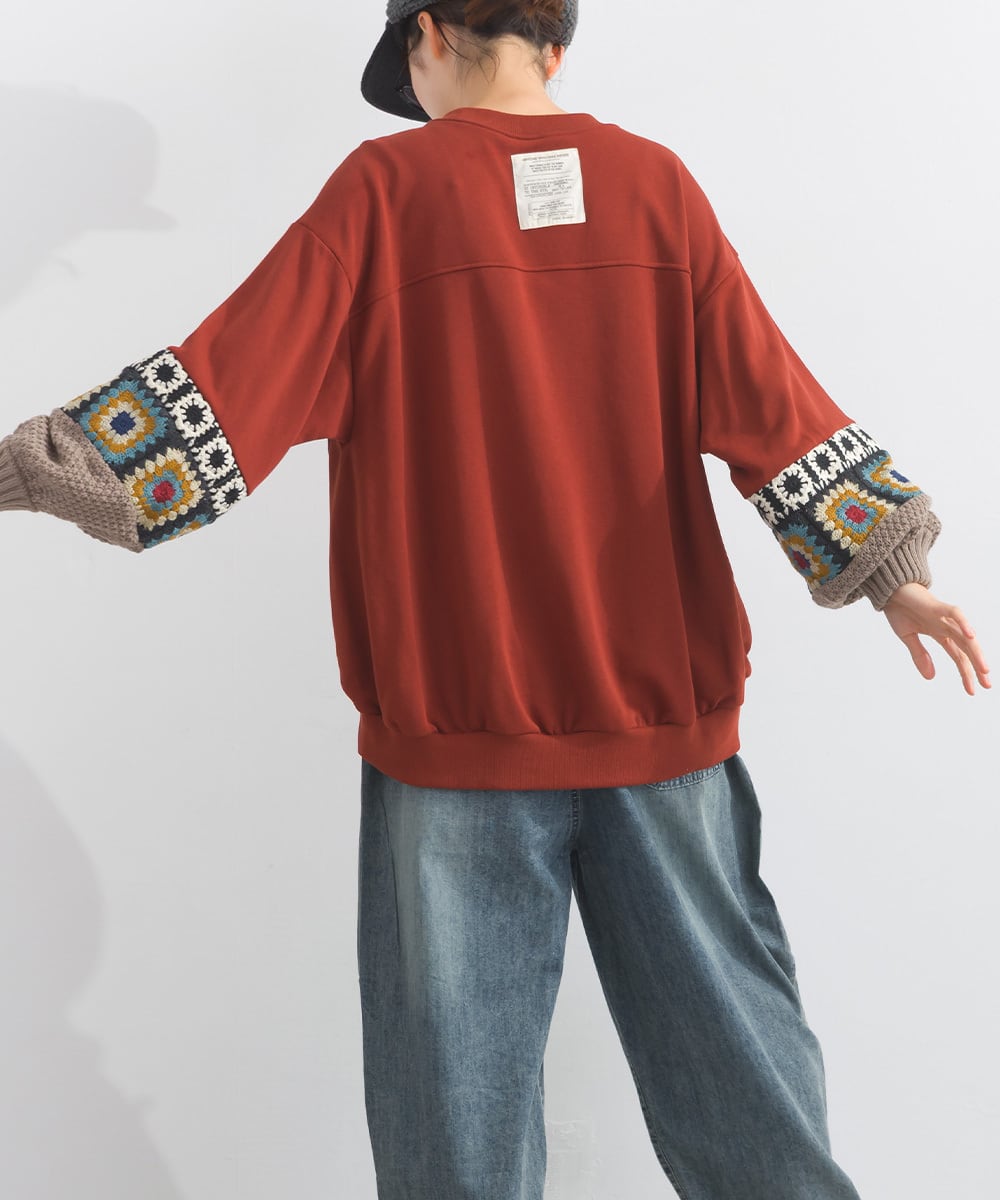 CT Back-Fleece Crochet Motif Sleeve Switch Sweat Pullover