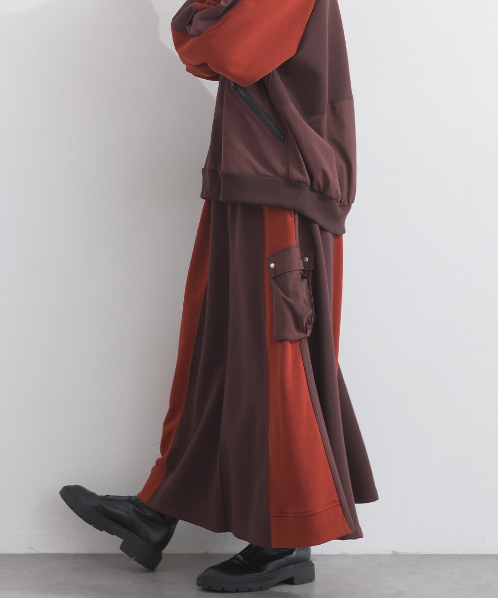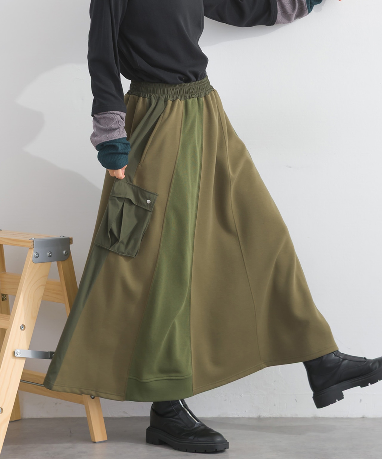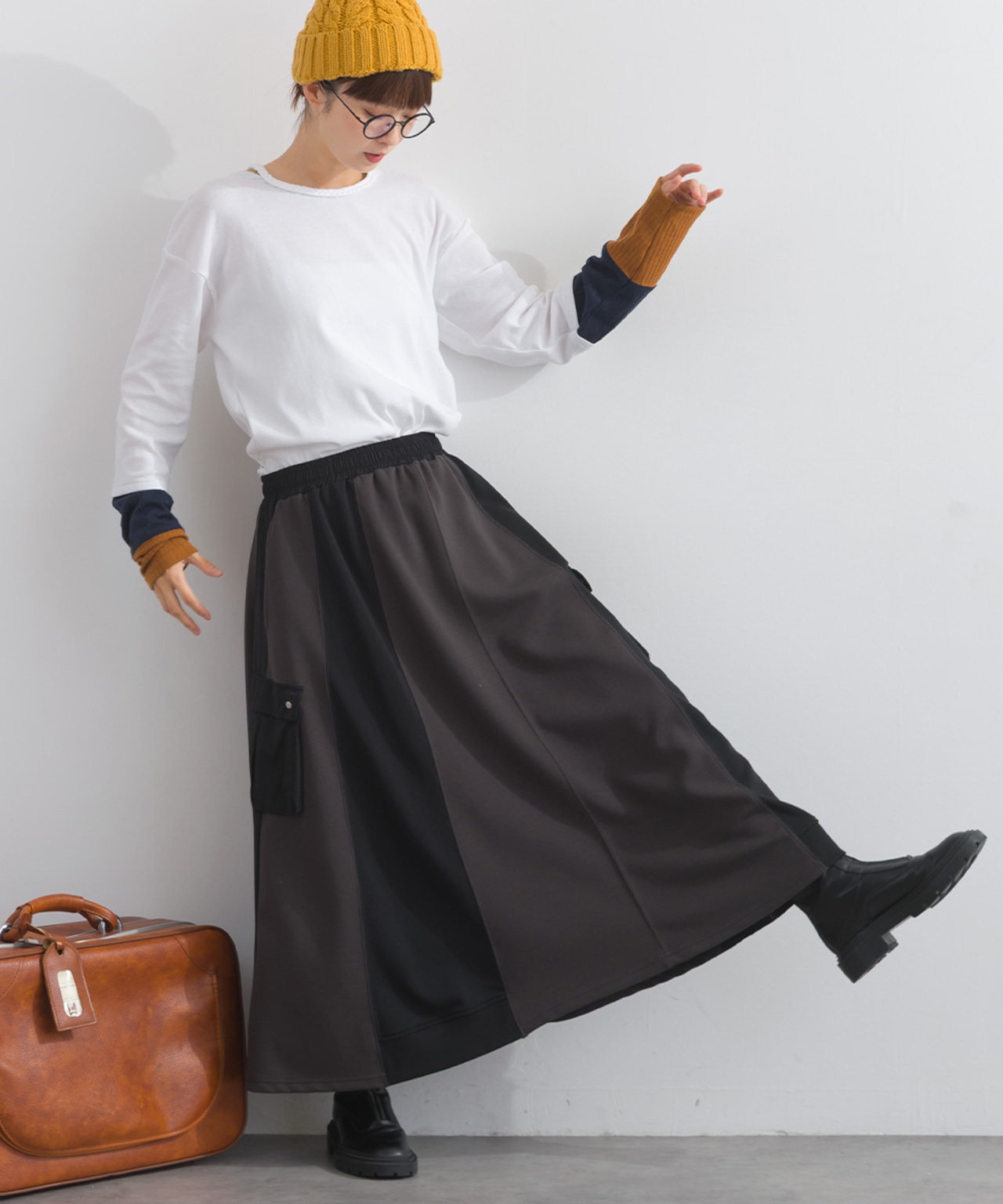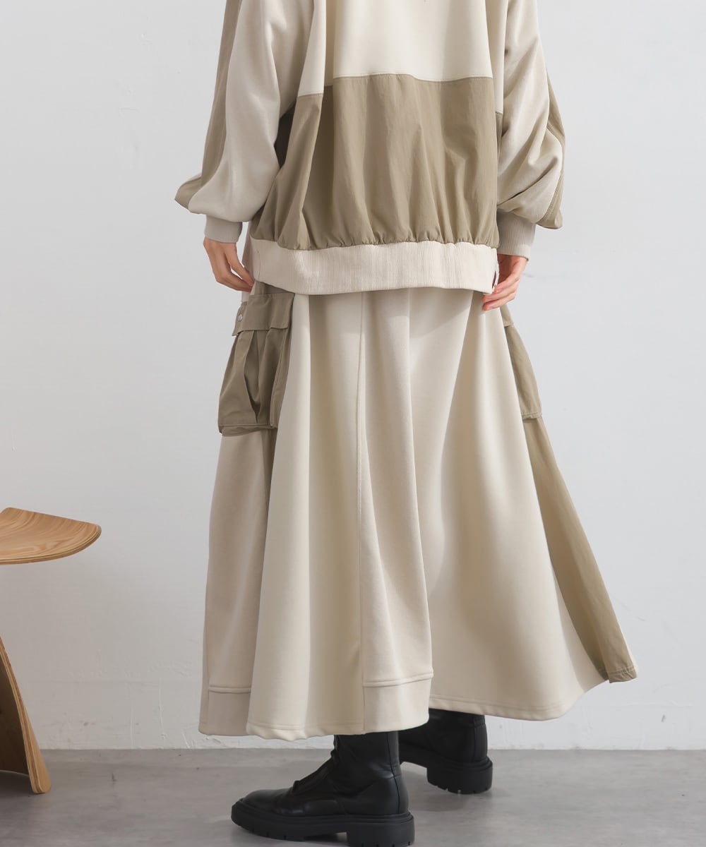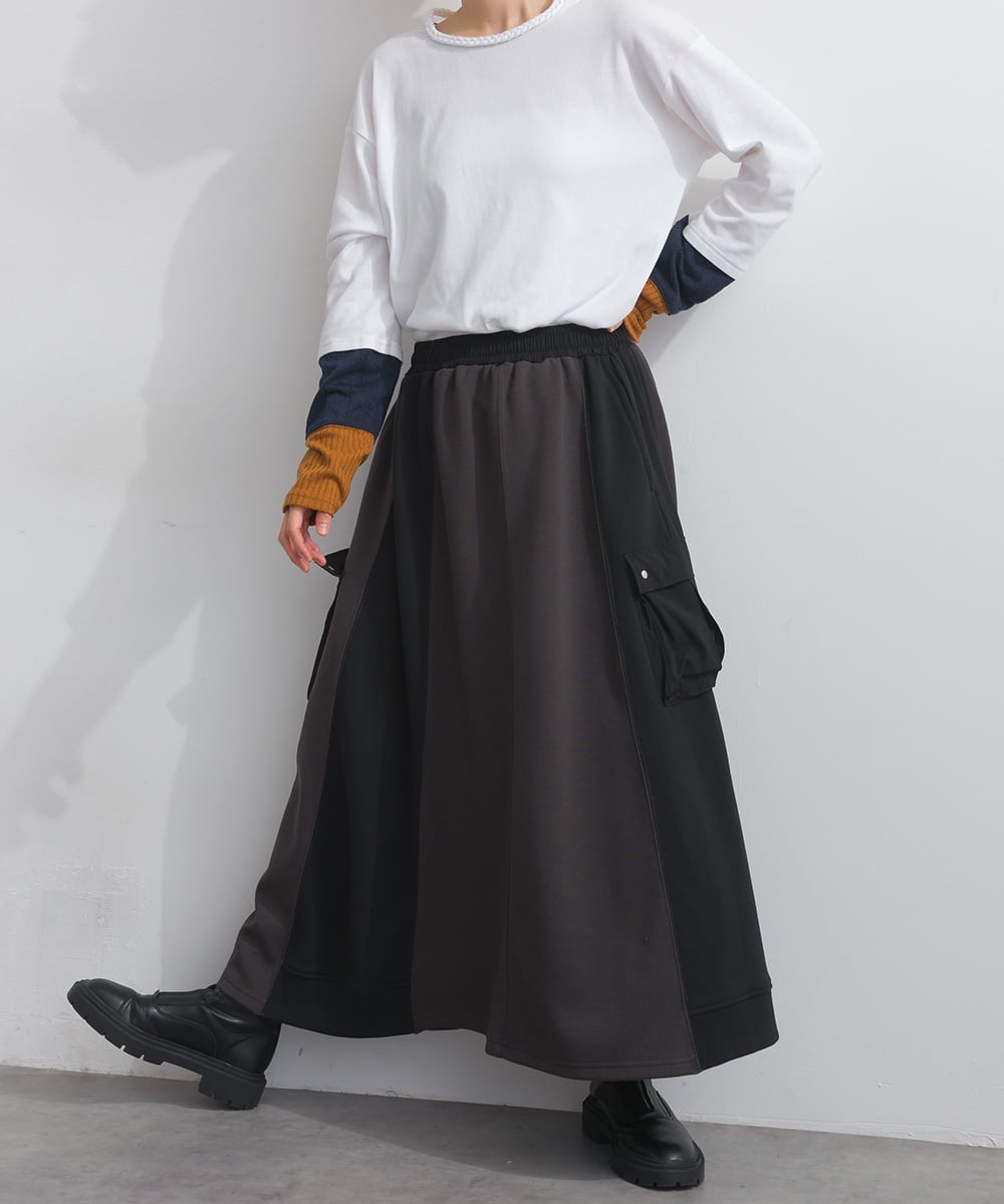 K53119 ポンチ異素材切替スカート / Ponte Mixed Fabric Flare Skirt