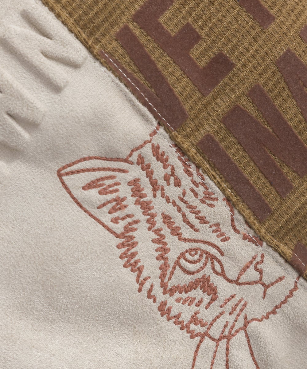 フェイクスウェードをベースにした異素材切替えデザイン。