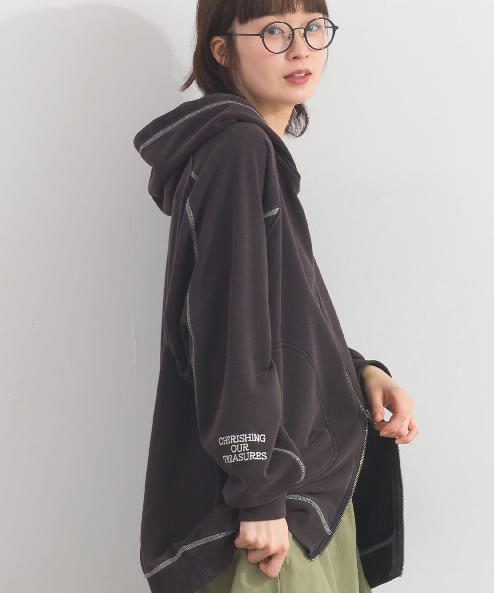 胸元の刺繍と配色ステッチがポイントになったフルZIPパーカー。