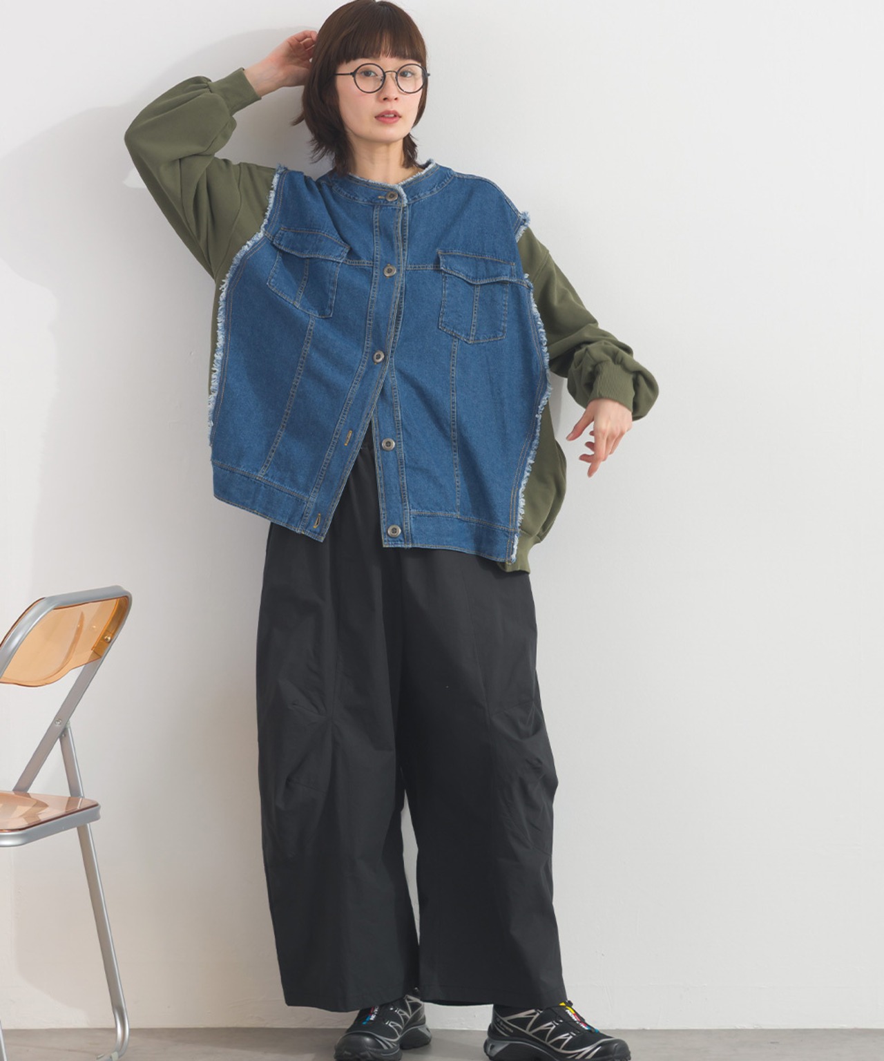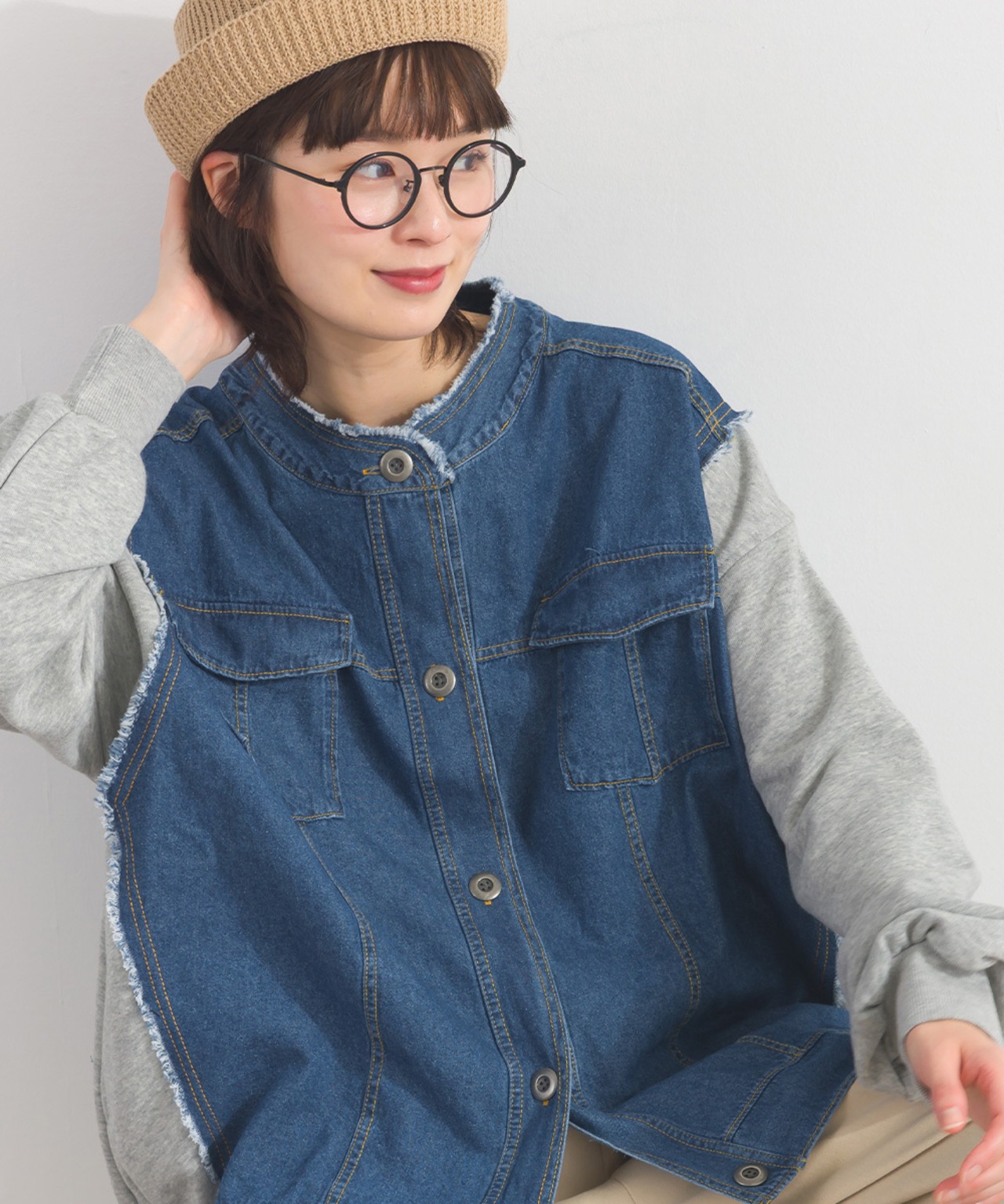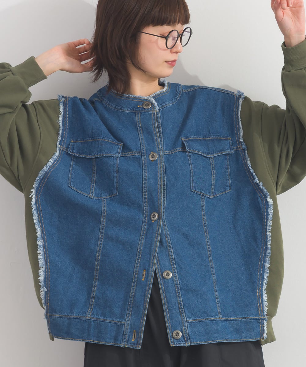 デニムジャケット風のディテールを取り入れつつ、カーディガン感覚で着用できるリメイク風クルーネックアイテム。