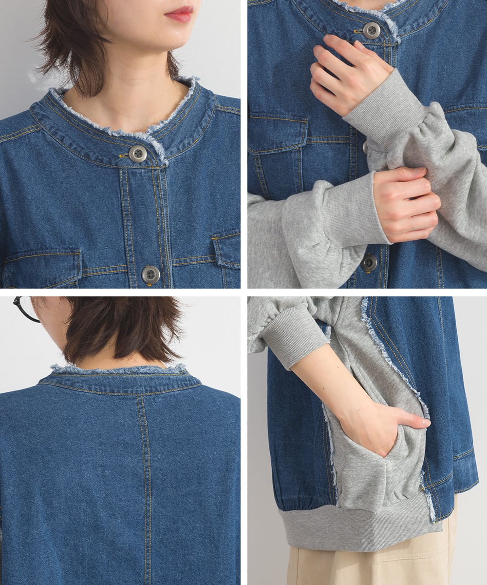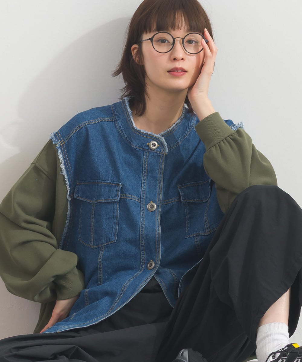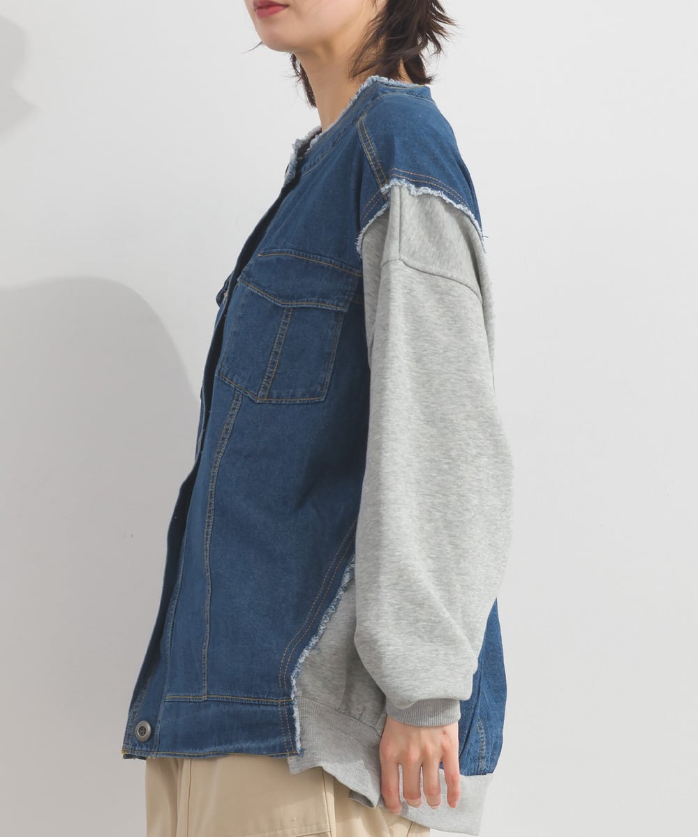 CT裏毛×8ozデニム異素材リメイク風デニム切替クルーカーディガン
