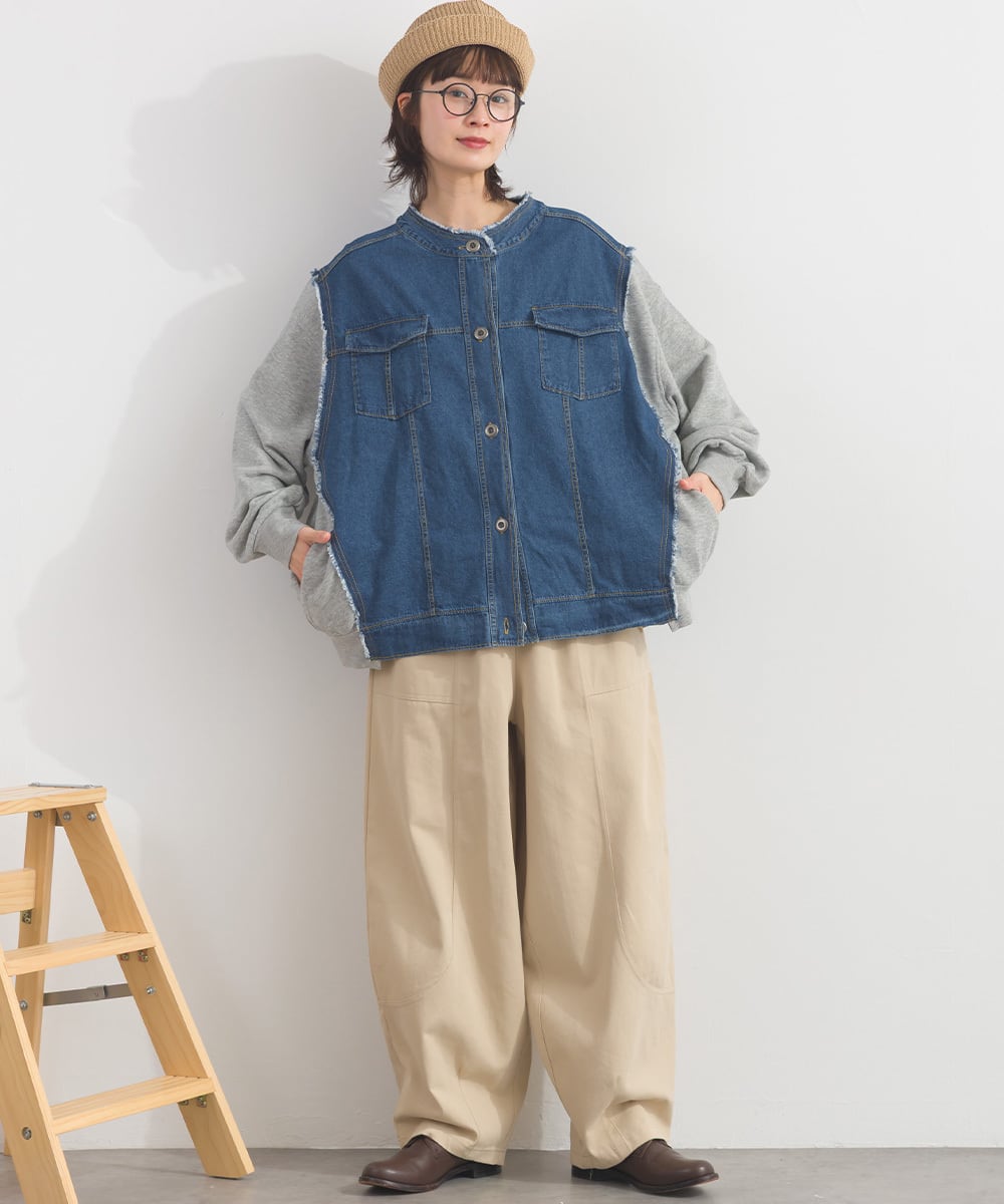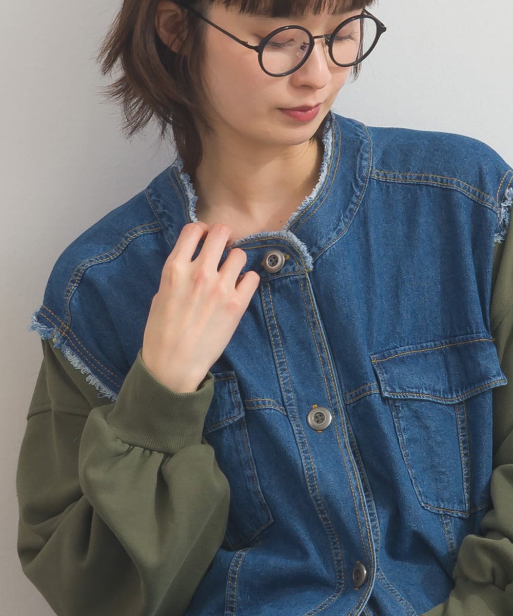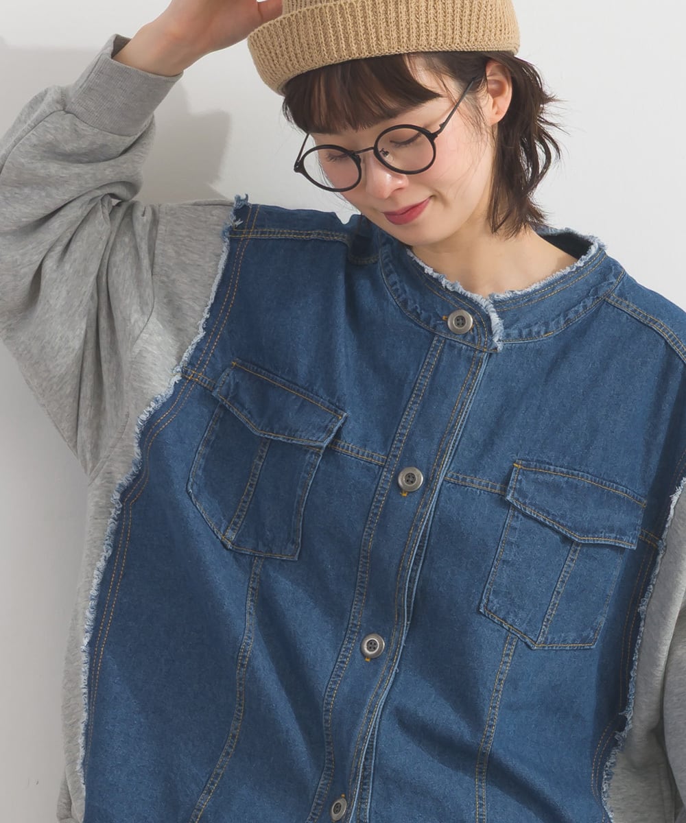 CT裏毛×8ozデニム異素材リメイク風デニム切替クルーカーディガン
