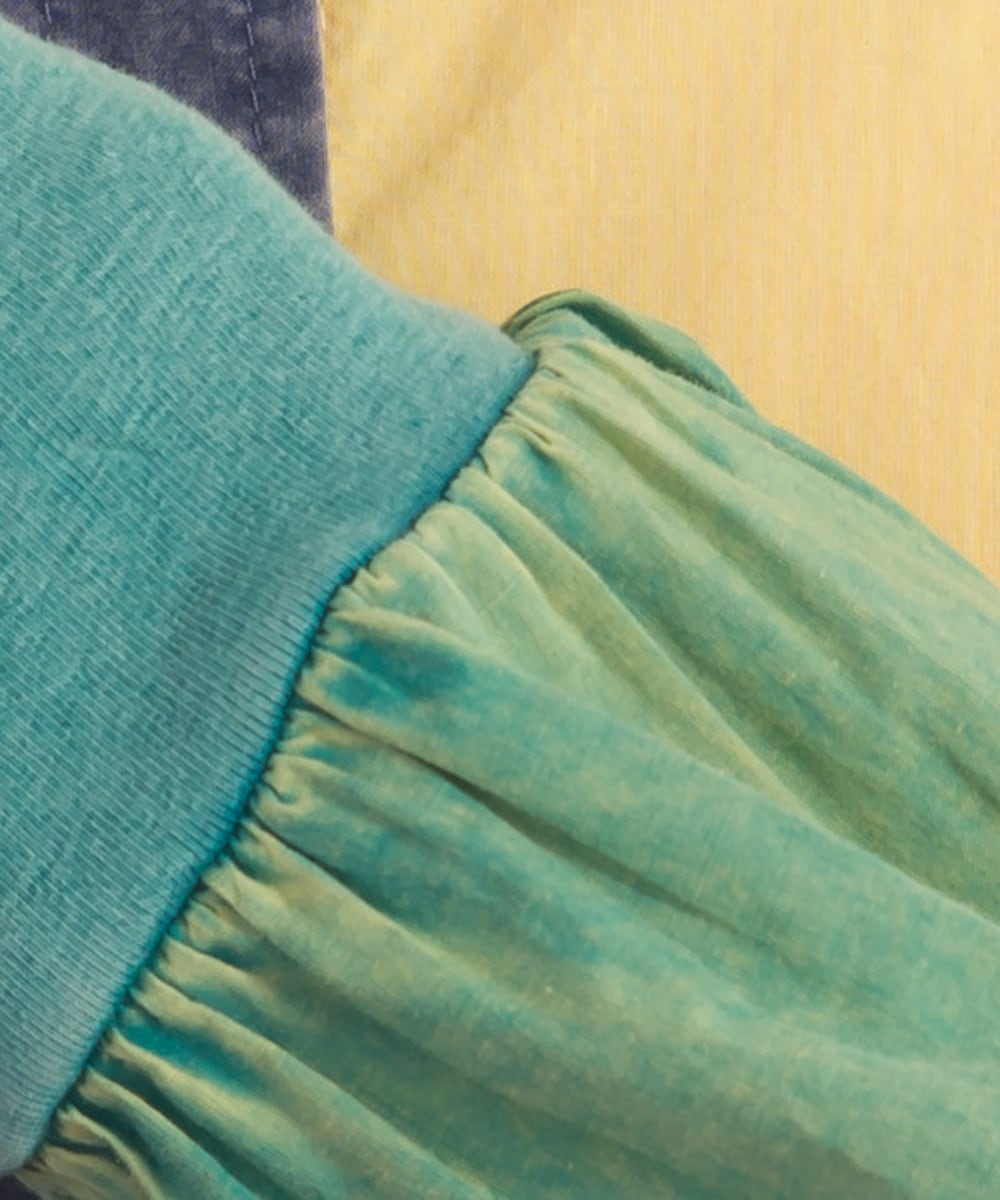 前後や袖で色を切り替えることで、シンプルながらも存在感のある一枚に仕上げています。