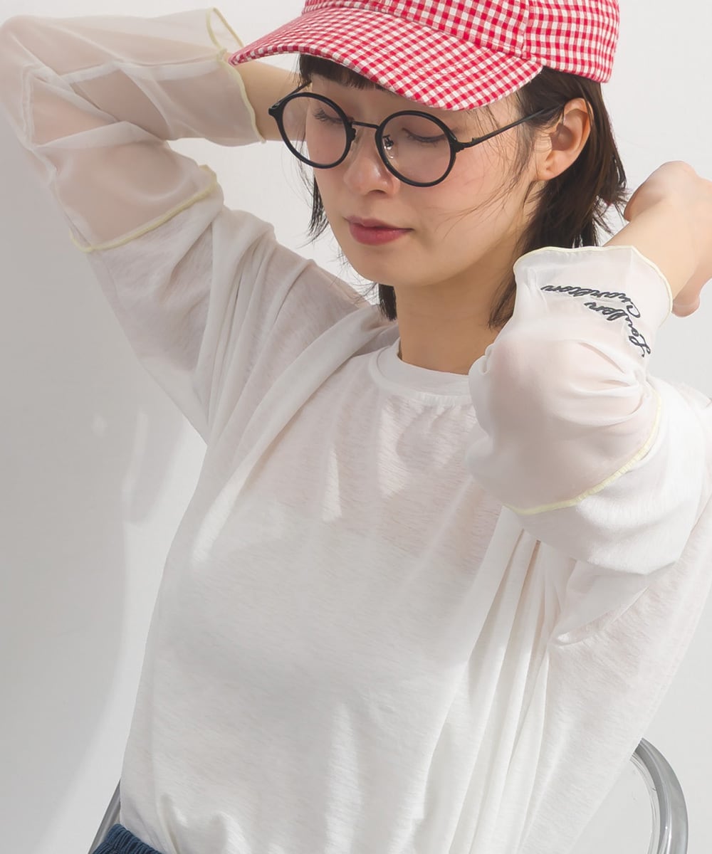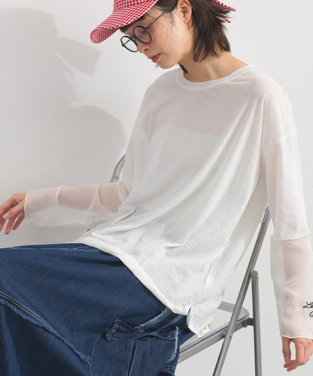 シンプルなロングTシャツに、袖部分をシアー素材で切り替えたデザインカットソー。