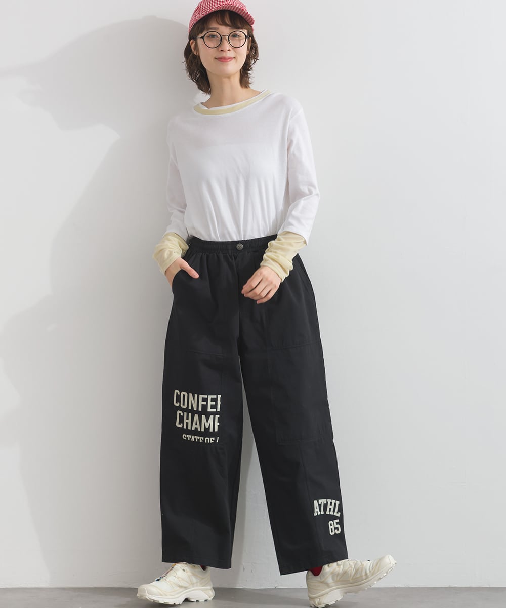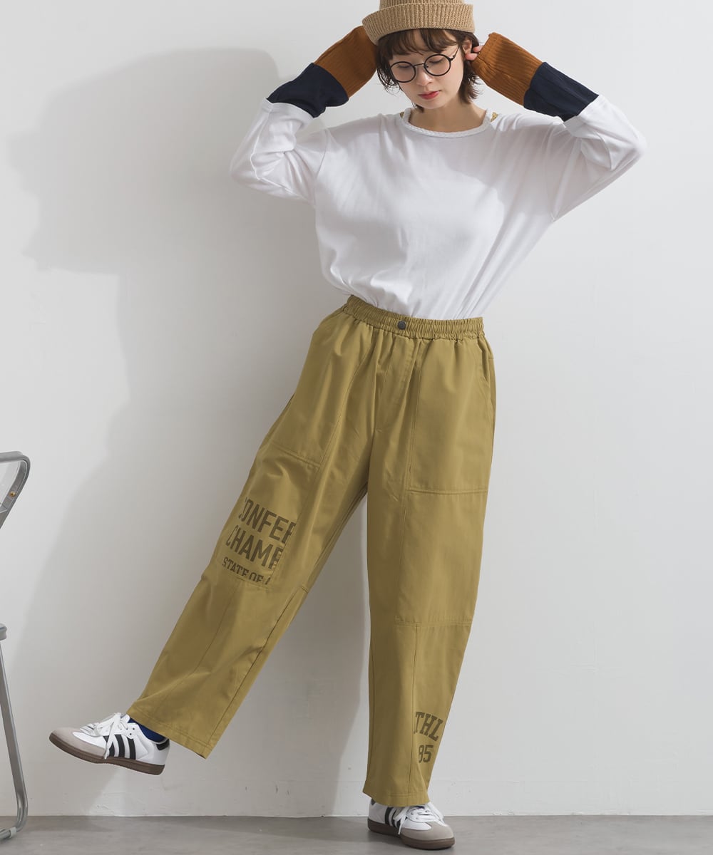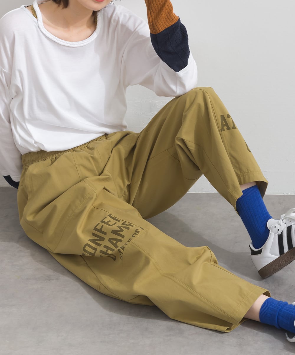 2026SS 2026春夏新作 春夏コーデ オーバーサイズ ワンマイルウエア iriey アイリー カジュアル ナチュラル ミセス ゆったり 体型カバー ゆったりシルエット ワークパンツ レディース ツイル プリントパンツ ロゴ ボトムス ウエストゴム カジュアル ストリート ミリタリー風 体型カバー 春夏 秋 ゆったりシルエット 着回し 黒 ベージュ カーキ 大人カジュアル イージーパンツ 韓国ファッション ワンマイルウェア 人気パンツ