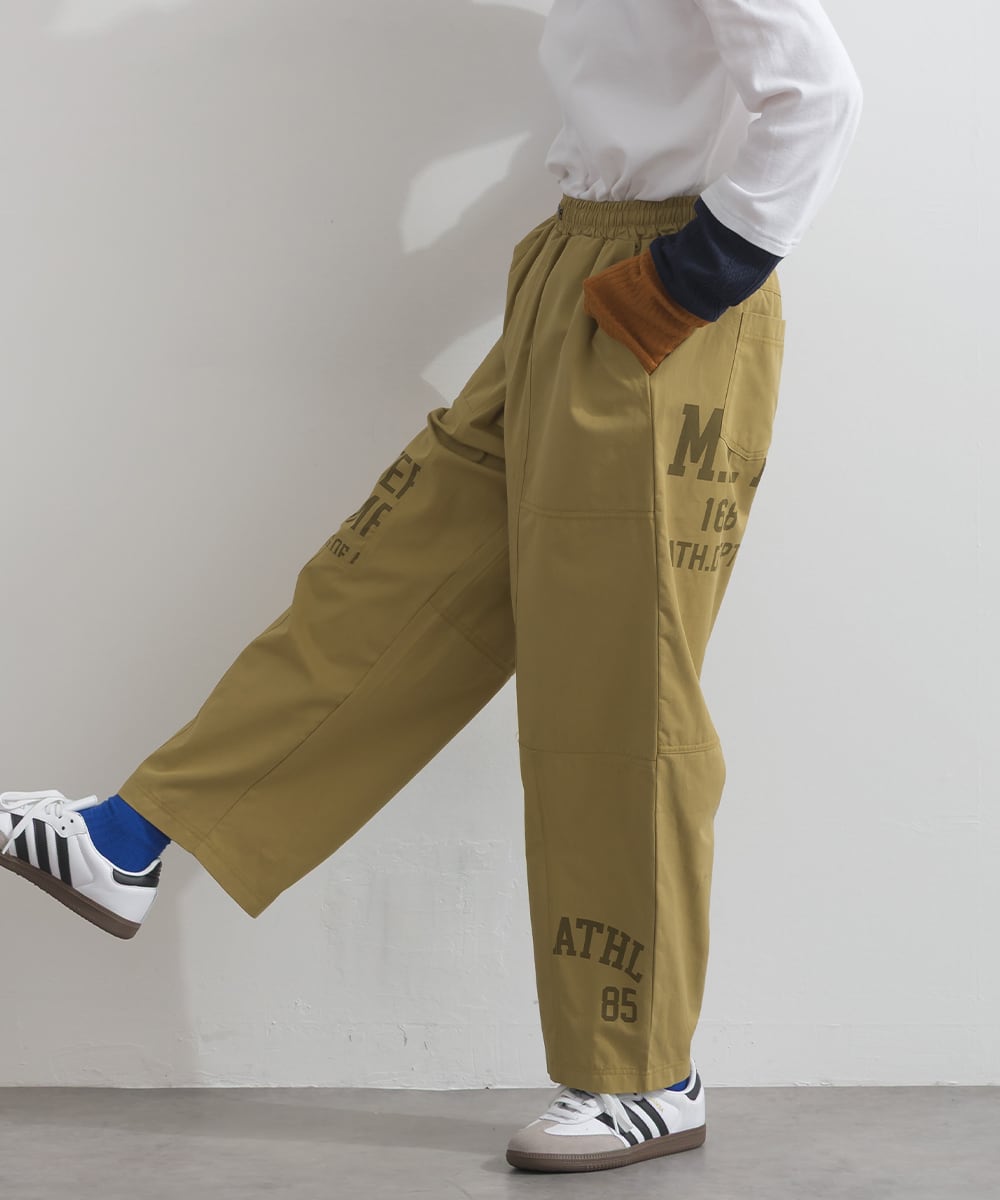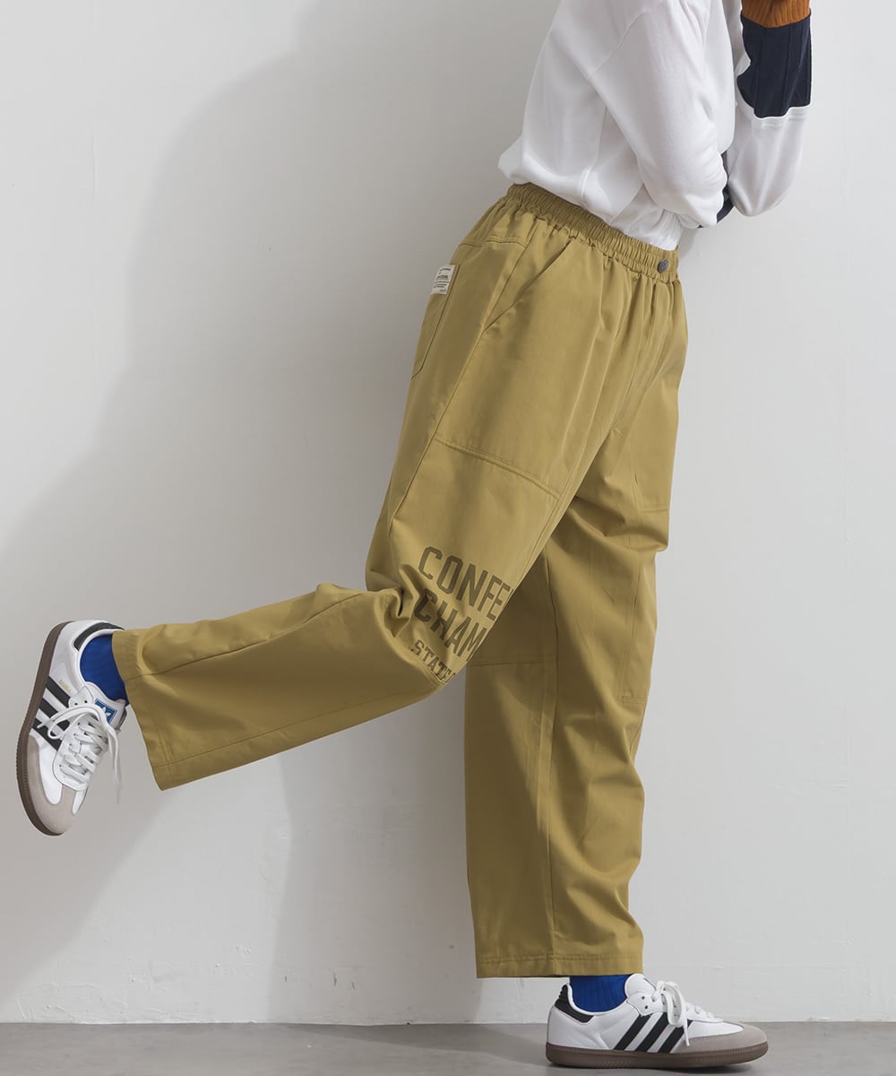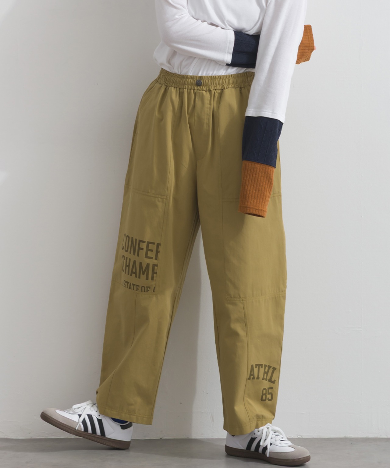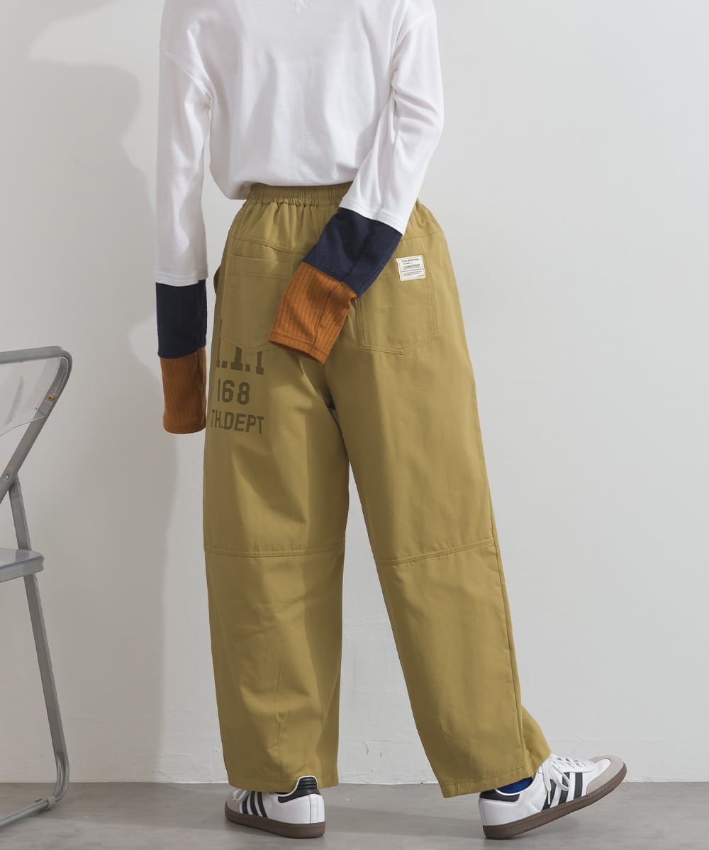 ワークパンツをベースに、ロゴプリントをアクセントとして加えたデザインパンツ。