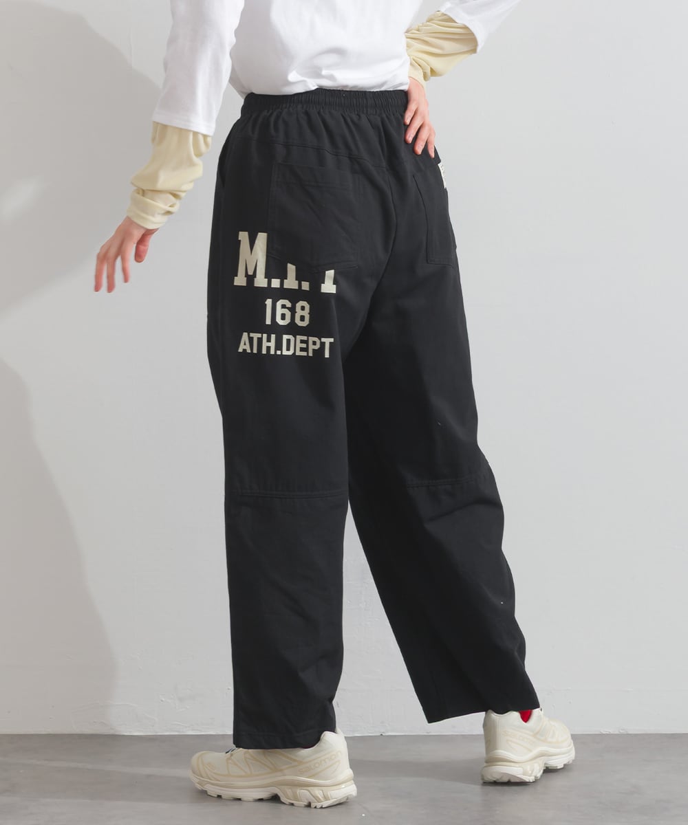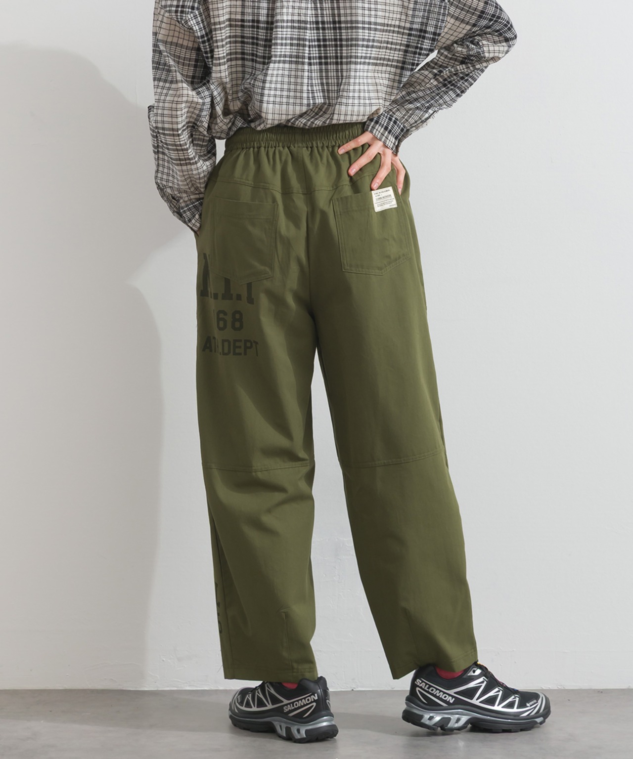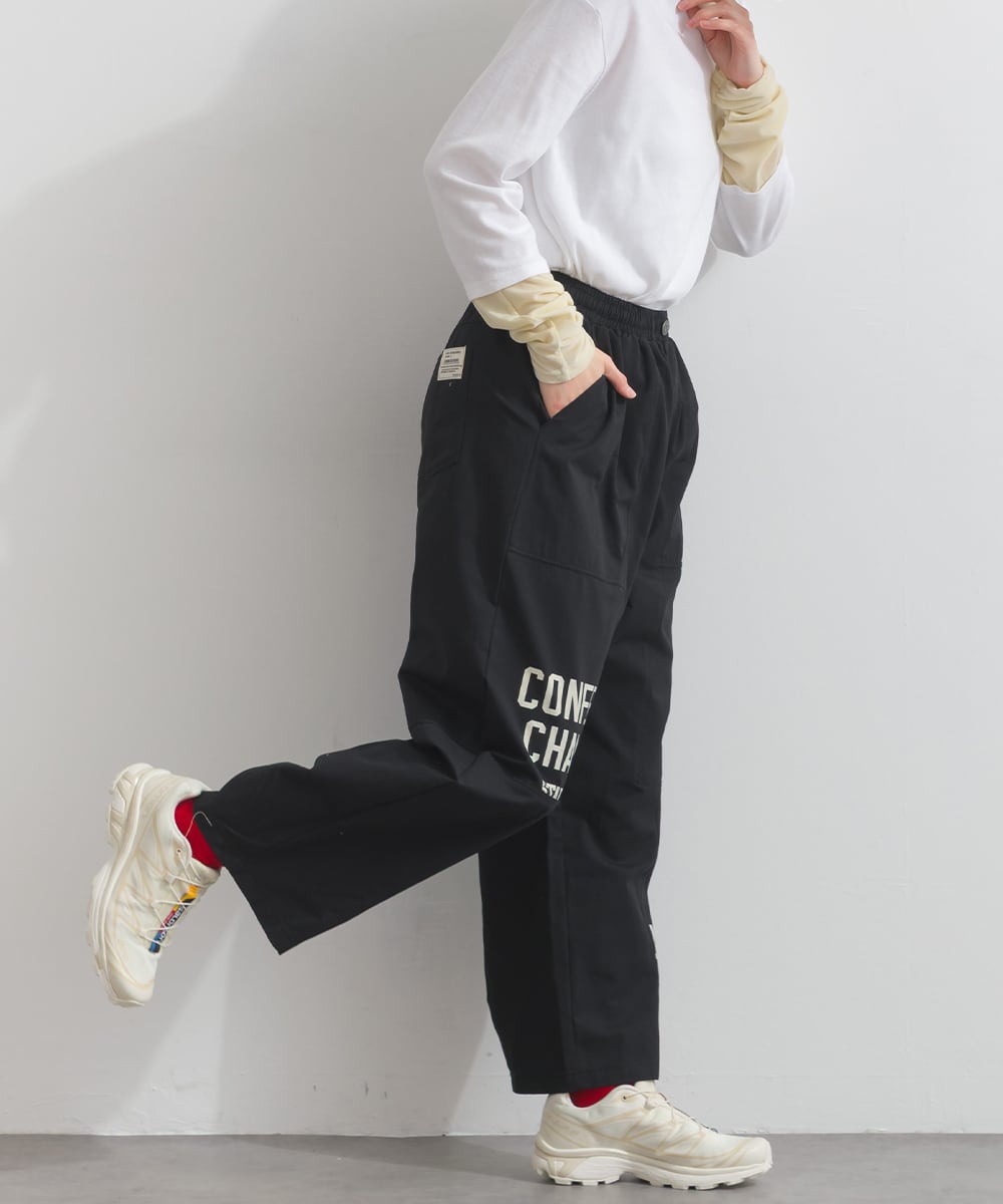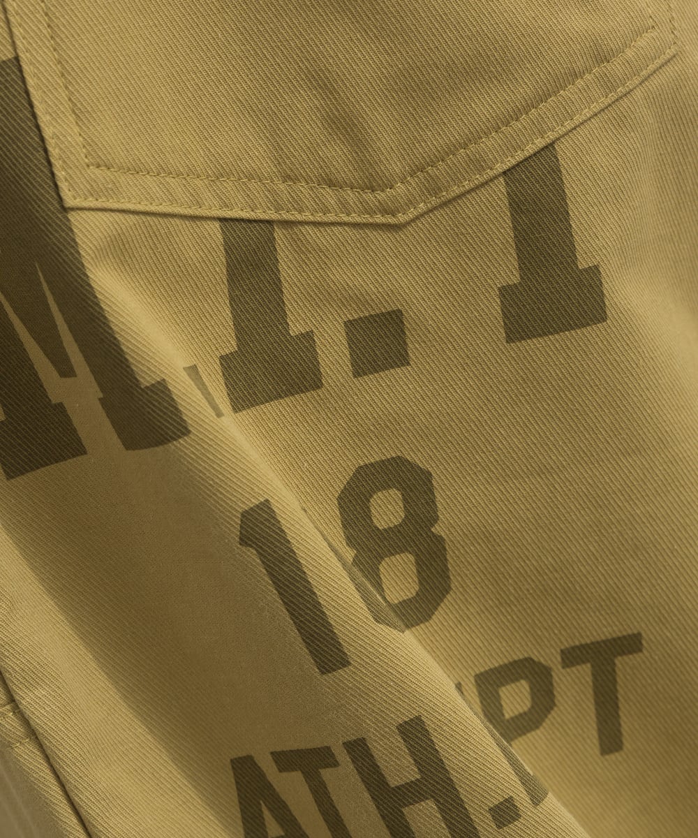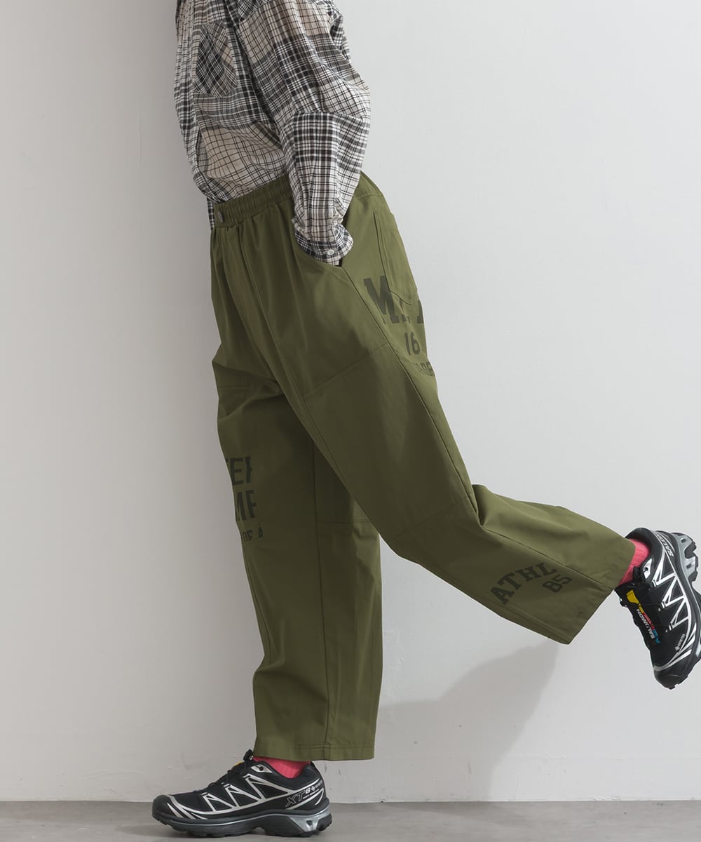 ワークパンツをベースに、ロゴプリントをアクセントとして加えたデザインパンツ。