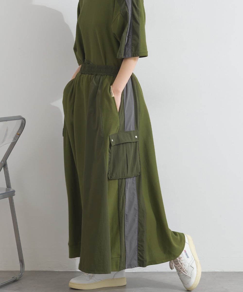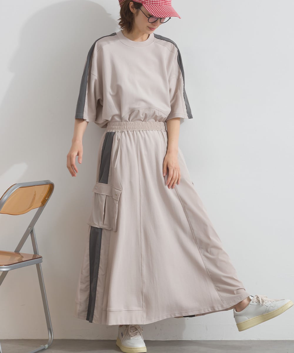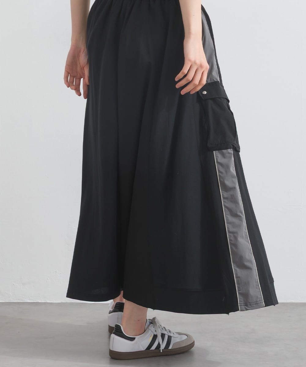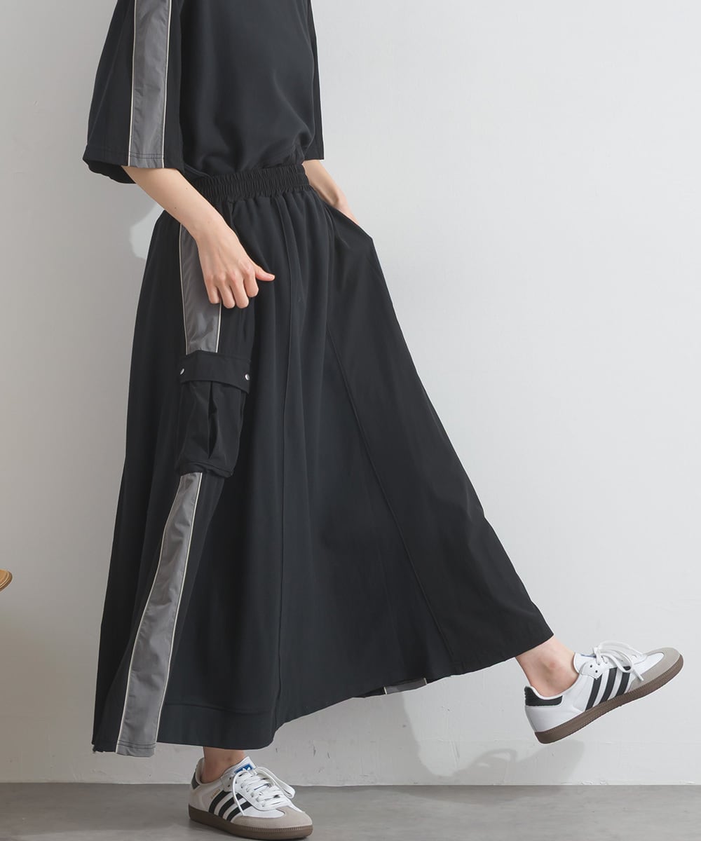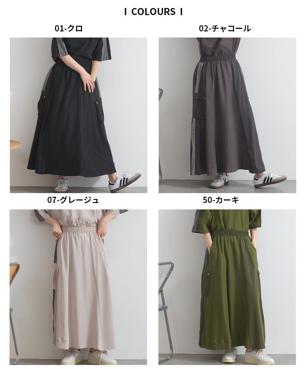 2026春新作 2026SS オーバーサイズ ワンマイルウエア iriey アイリー カジュアル ナチュラル ミセス ゆったり 体型カバー トラックスカート リメイク風 セットアップ スポーティ コットン ウエストゴム イージースカート レディース 配色切替 ツイルスカート Aライン ウエストゴム 体型カバー 春スカート 秋スカート ワンマイルウェア 大人カジュアル スタイルアップ ミリタリー風 配色デザイン トレンドボトム 配色ライン フレアスカート シルケットツイル レディースロングスカート きれいめ カジュアル 春夏 着回し 無地 カーキ グレージュ チャコール ブラック 人気