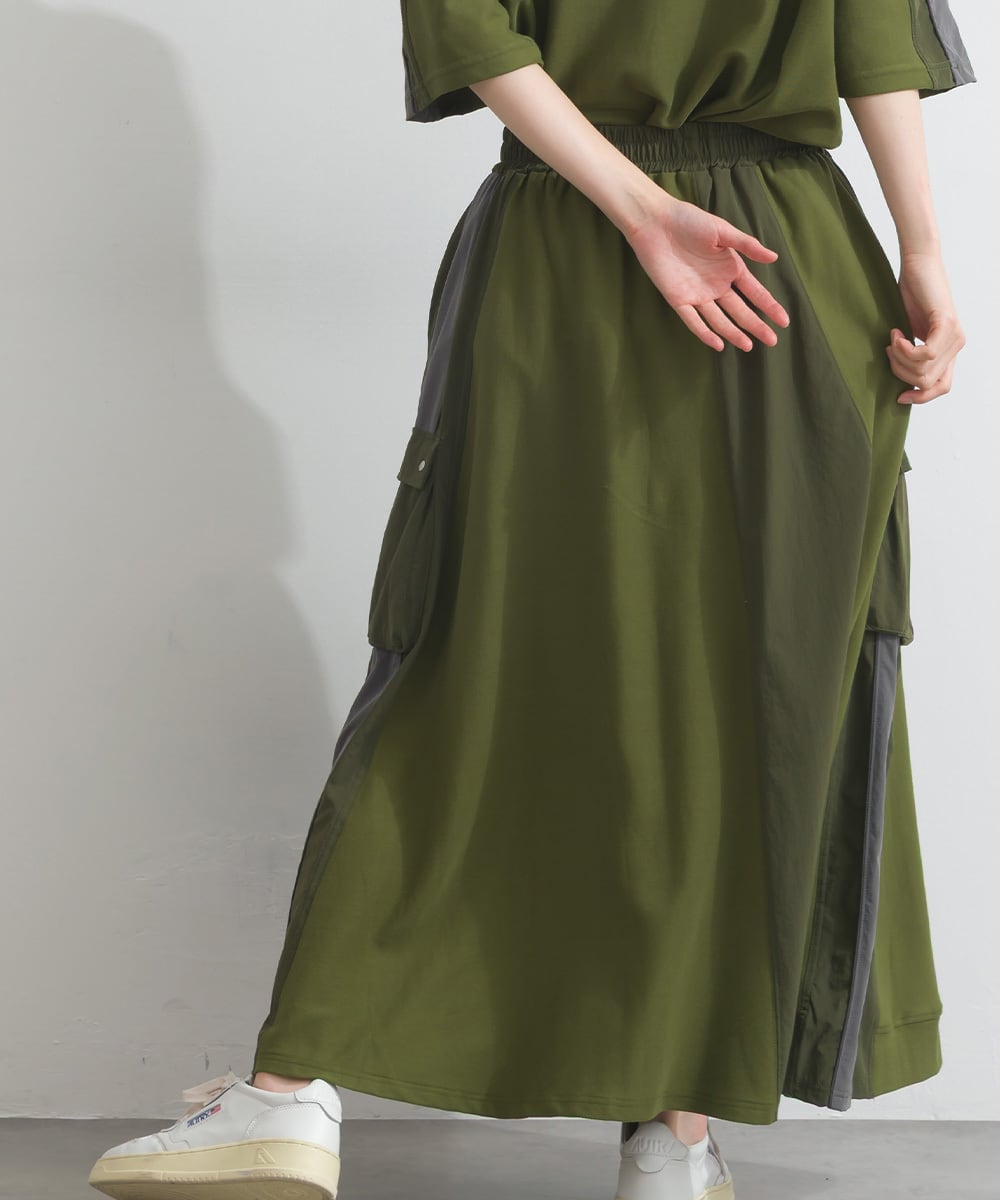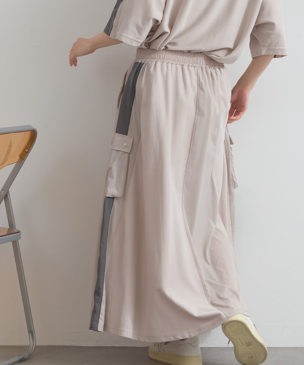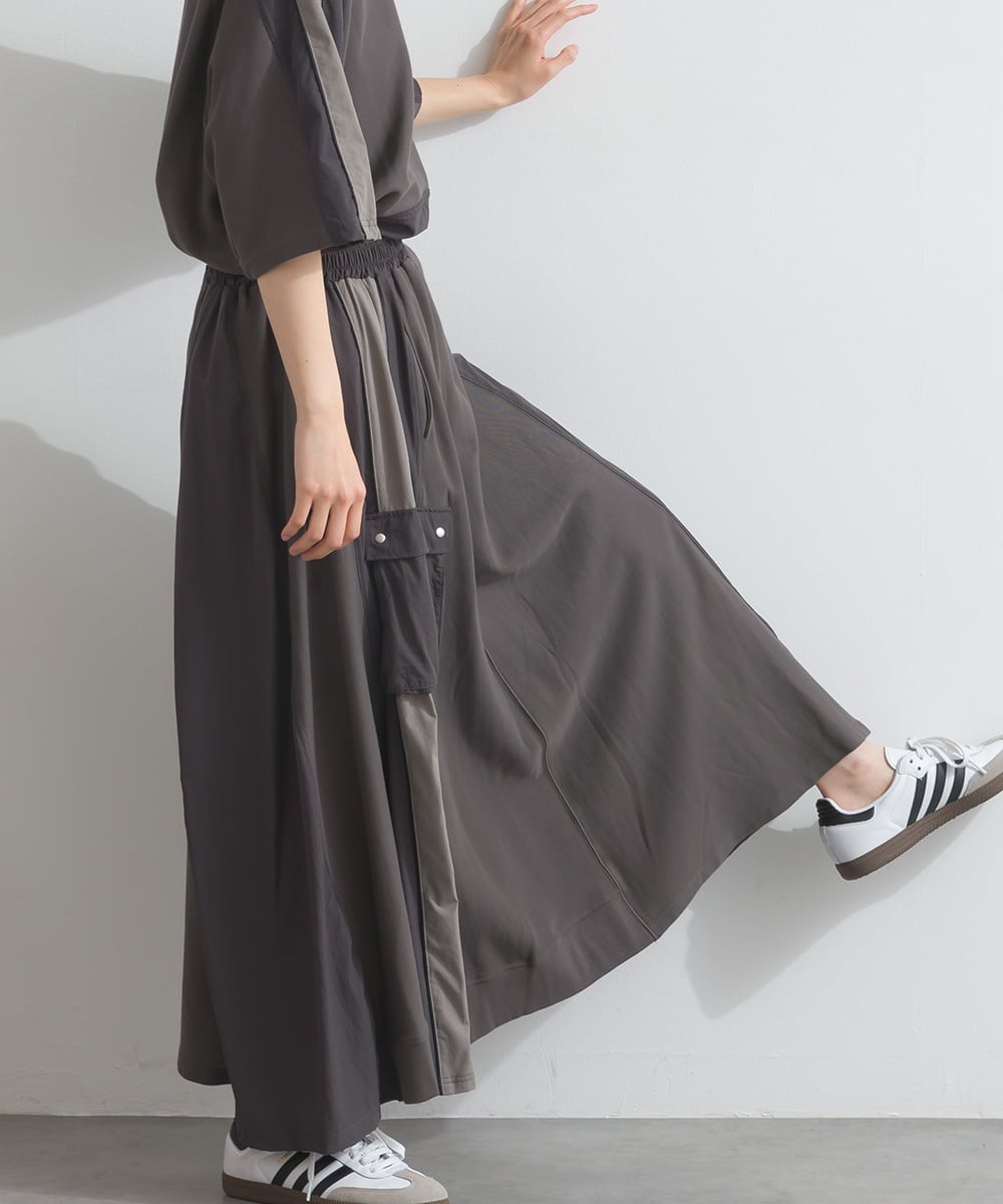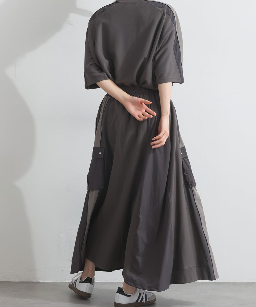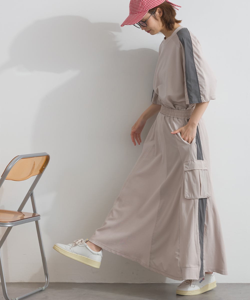 2026春新作 2026SS オーバーサイズ ワンマイルウエア iriey アイリー カジュアル ナチュラル ミセス ゆったり 体型カバー トラックスカート リメイク風 セットアップ スポーティ コットン ウエストゴム イージースカート レディース 配色切替 ツイルスカート Aライン ウエストゴム 体型カバー 春スカート 秋スカート ワンマイルウェア 大人カジュアル スタイルアップ ミリタリー風 配色デザイン トレンドボトム 配色ライン フレアスカート シルケットツイル レディースロングスカート きれいめ カジュアル 春夏 着回し 無地 カーキ グレージュ チャコール ブラック 人気