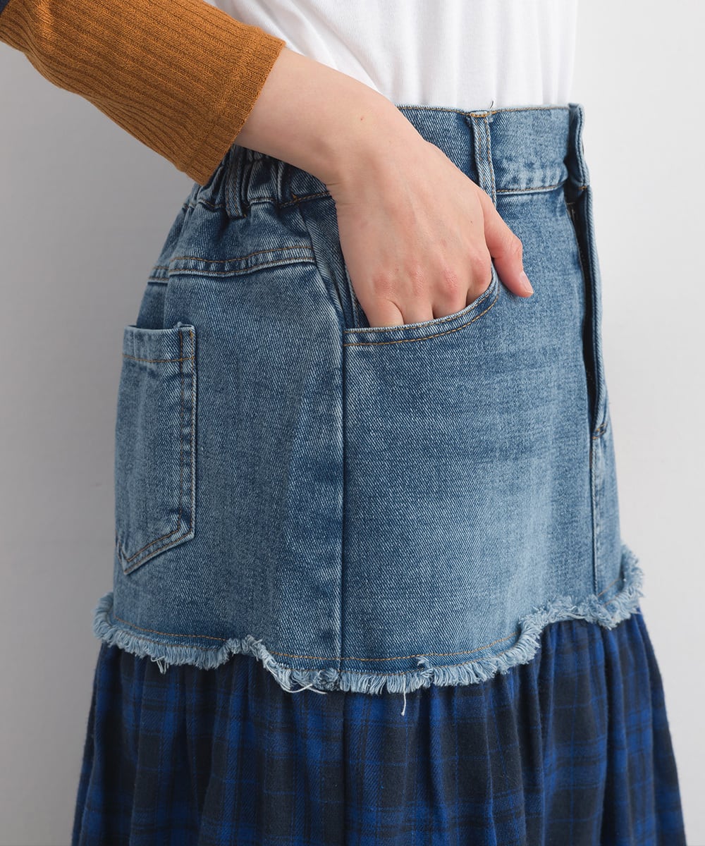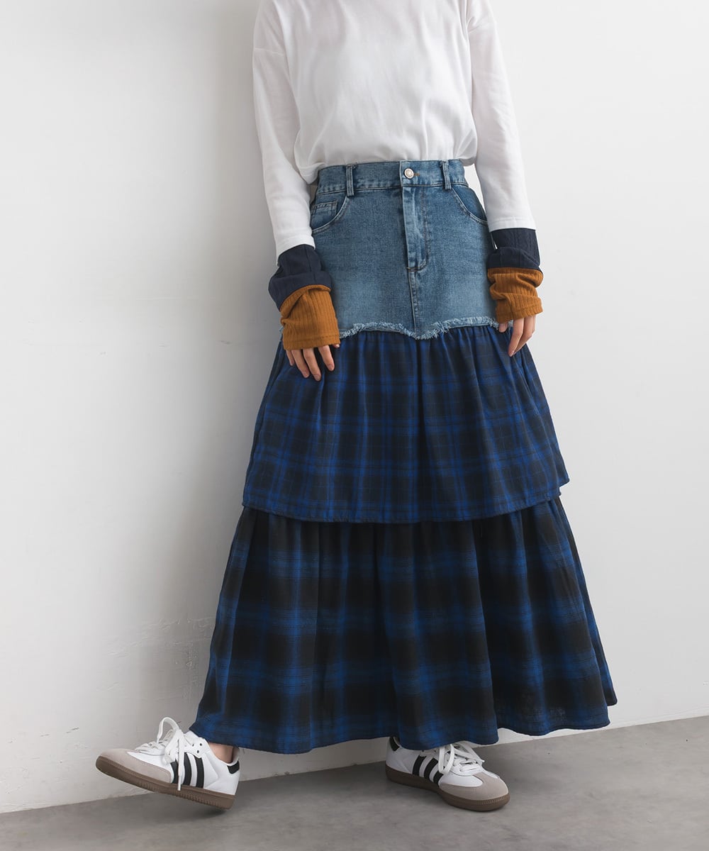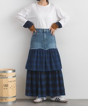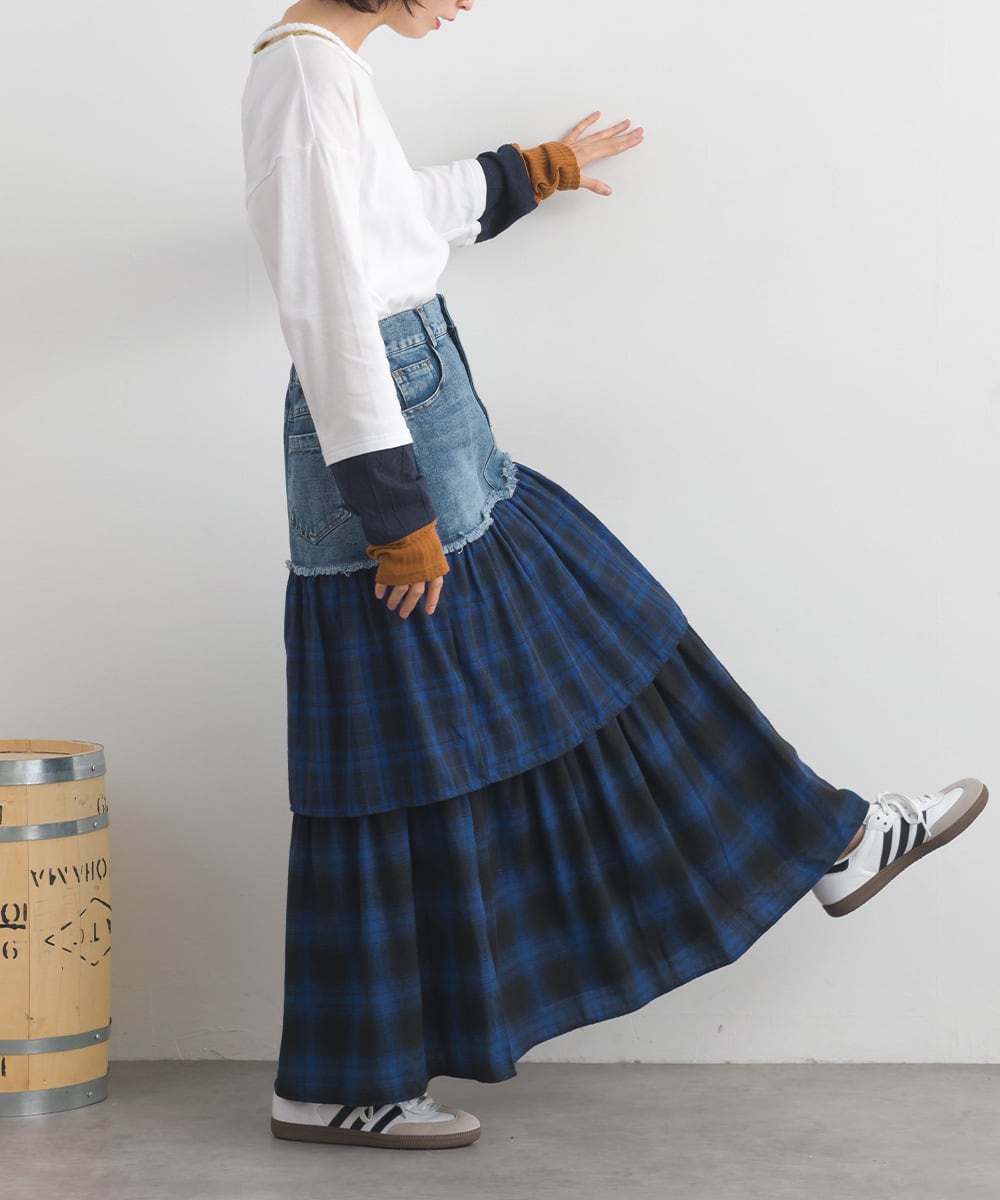 D261138 デニム×チェックティアードスカート / Denim & Check Tiered Skirt