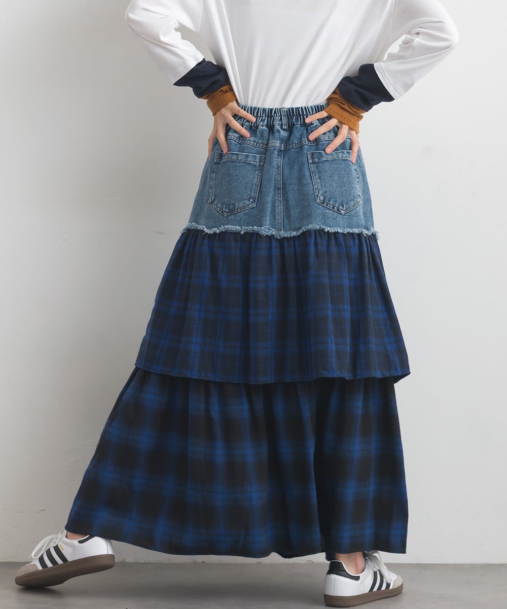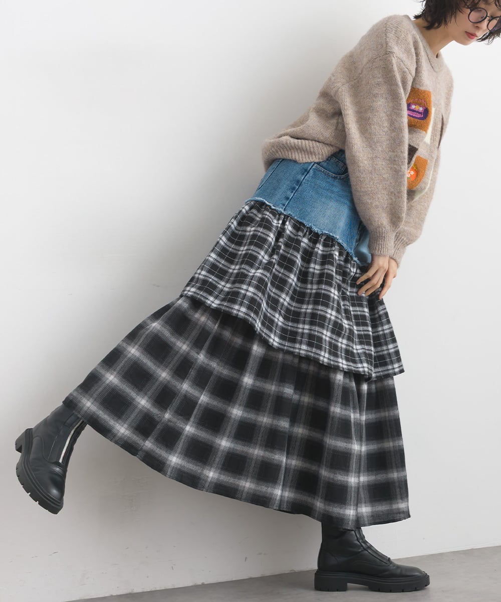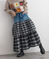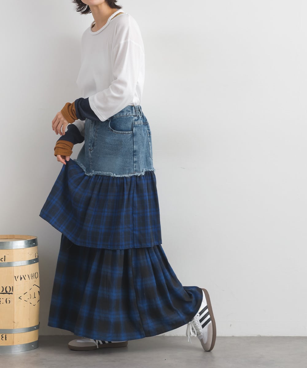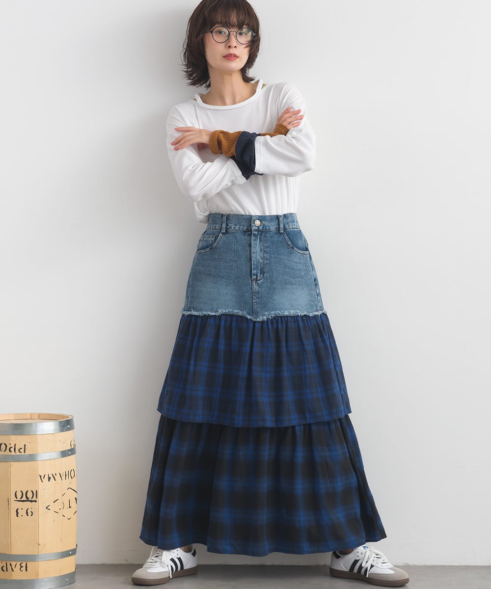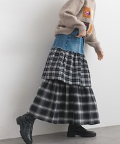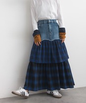 デニムのカジュアルさに、チェック柄の柔らかい風合いを掛け合わせたティアードスカート。