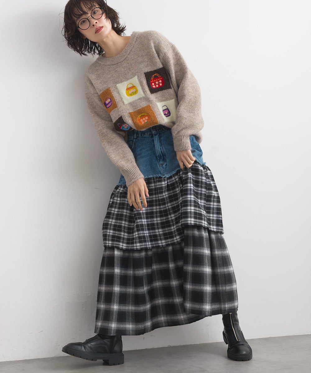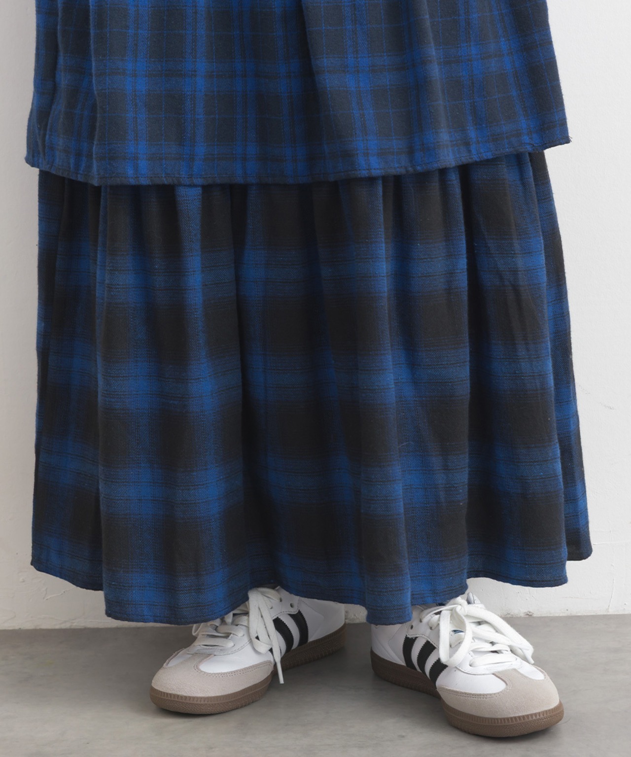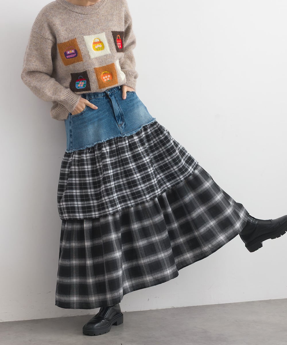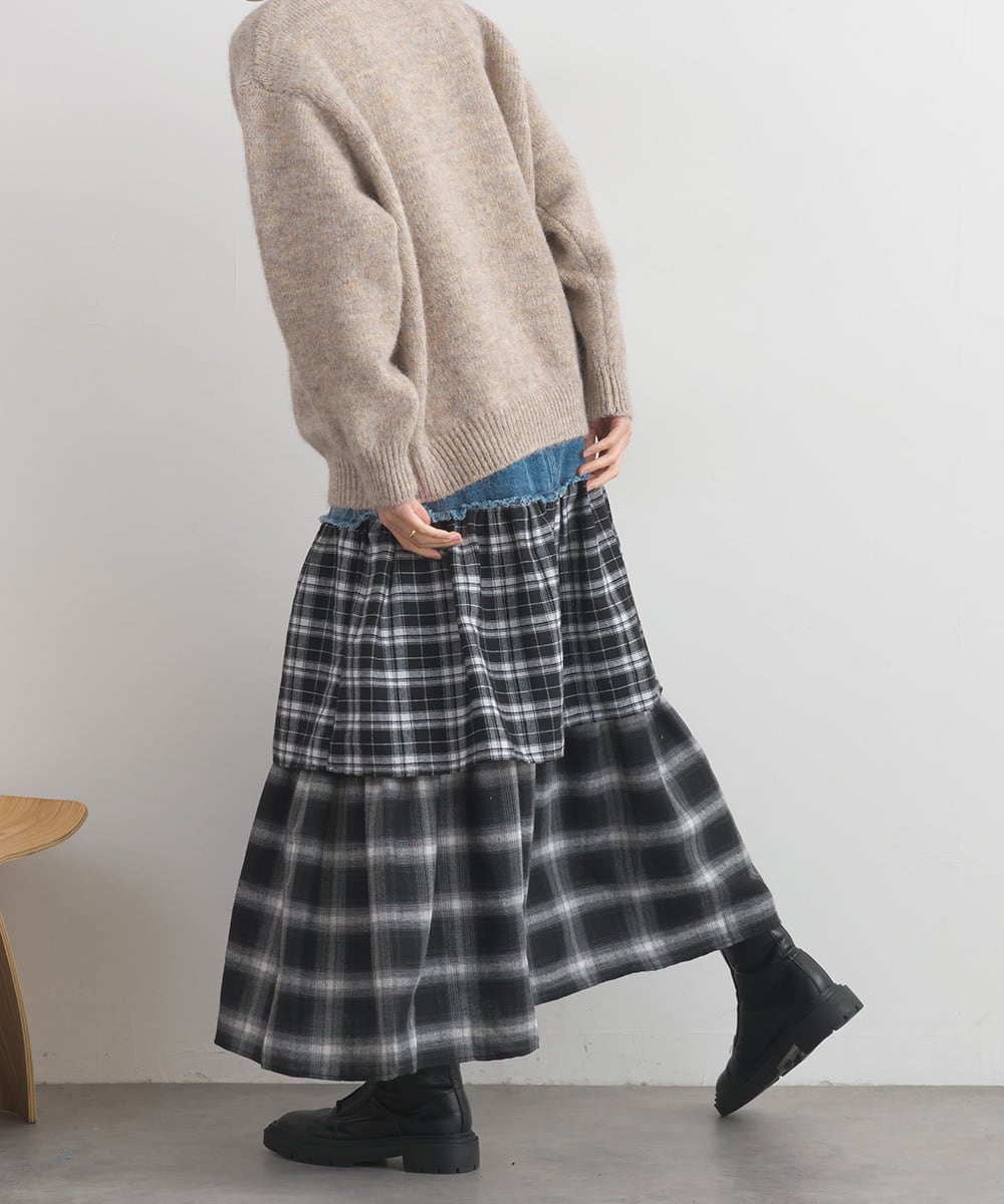 デニムのカジュアルさに、チェック柄の柔らかい風合いを掛け合わせたティアードスカート。
