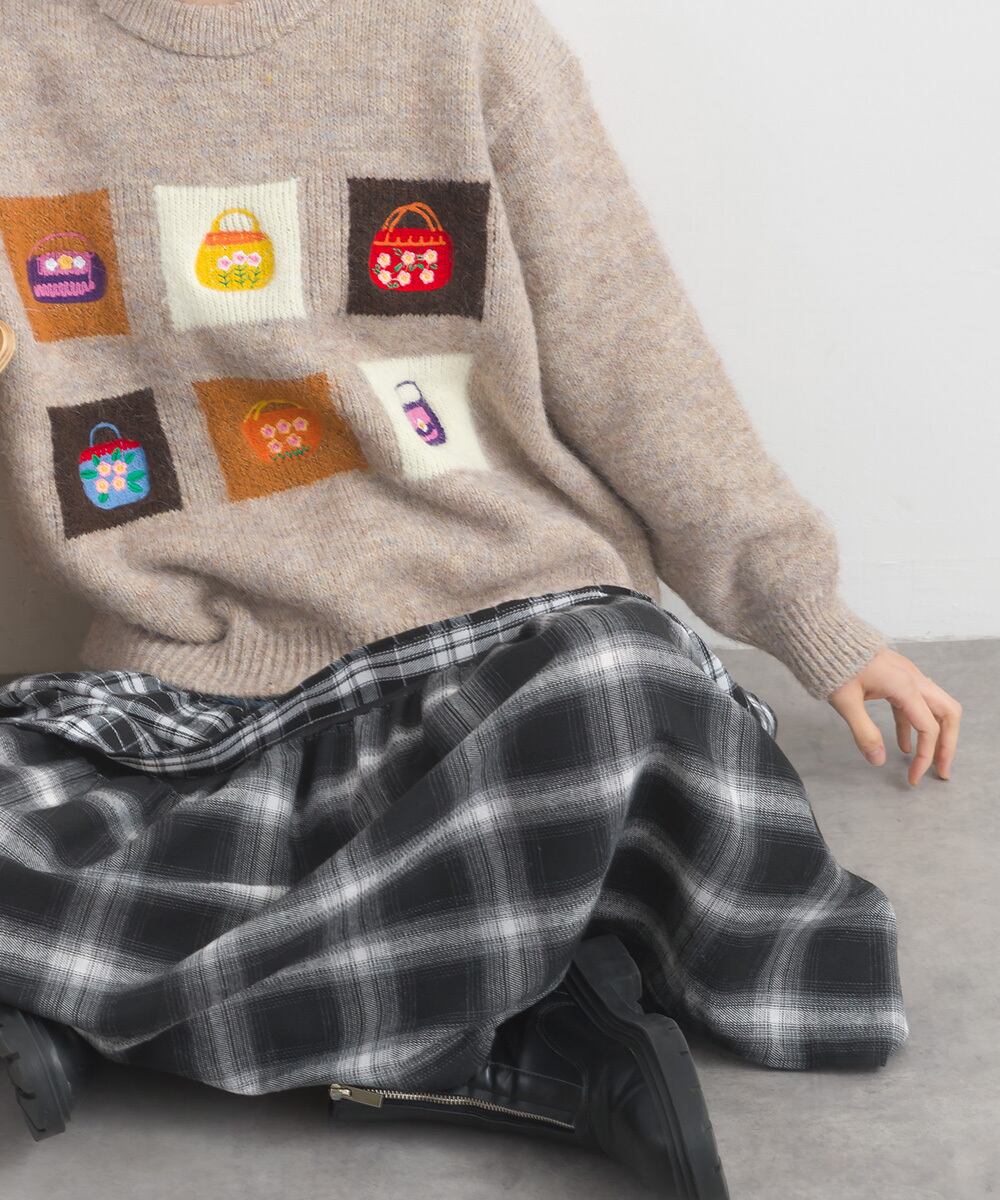 段ごとに異なるチェックパターンが重なり、動くたびに表情が変わるデザイン性の高い一枚です。