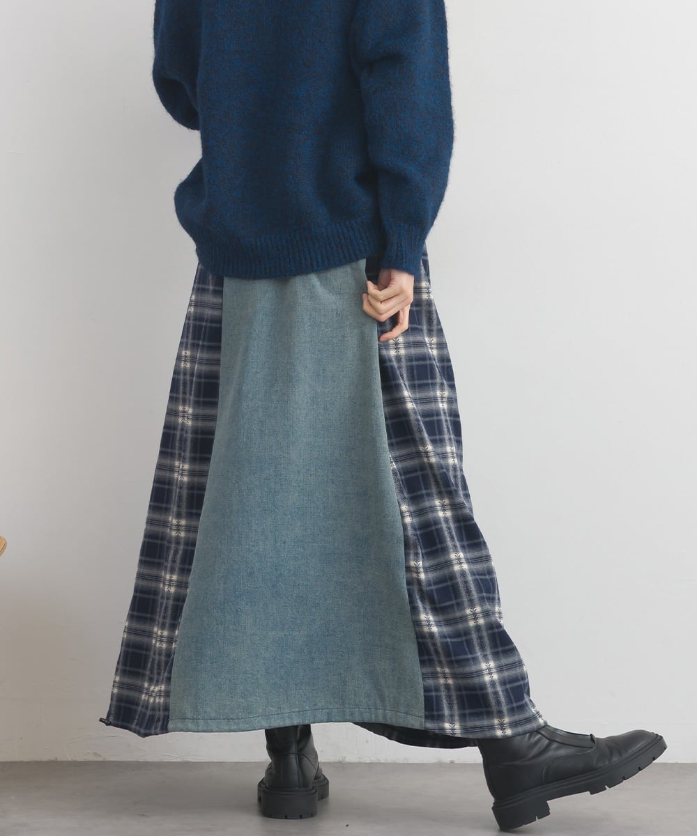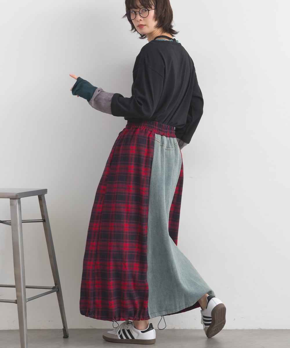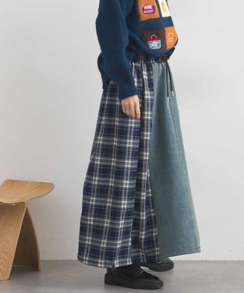 This long skirt features a vertical panel design combining denim and check patterns for a rich, expressive look.