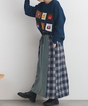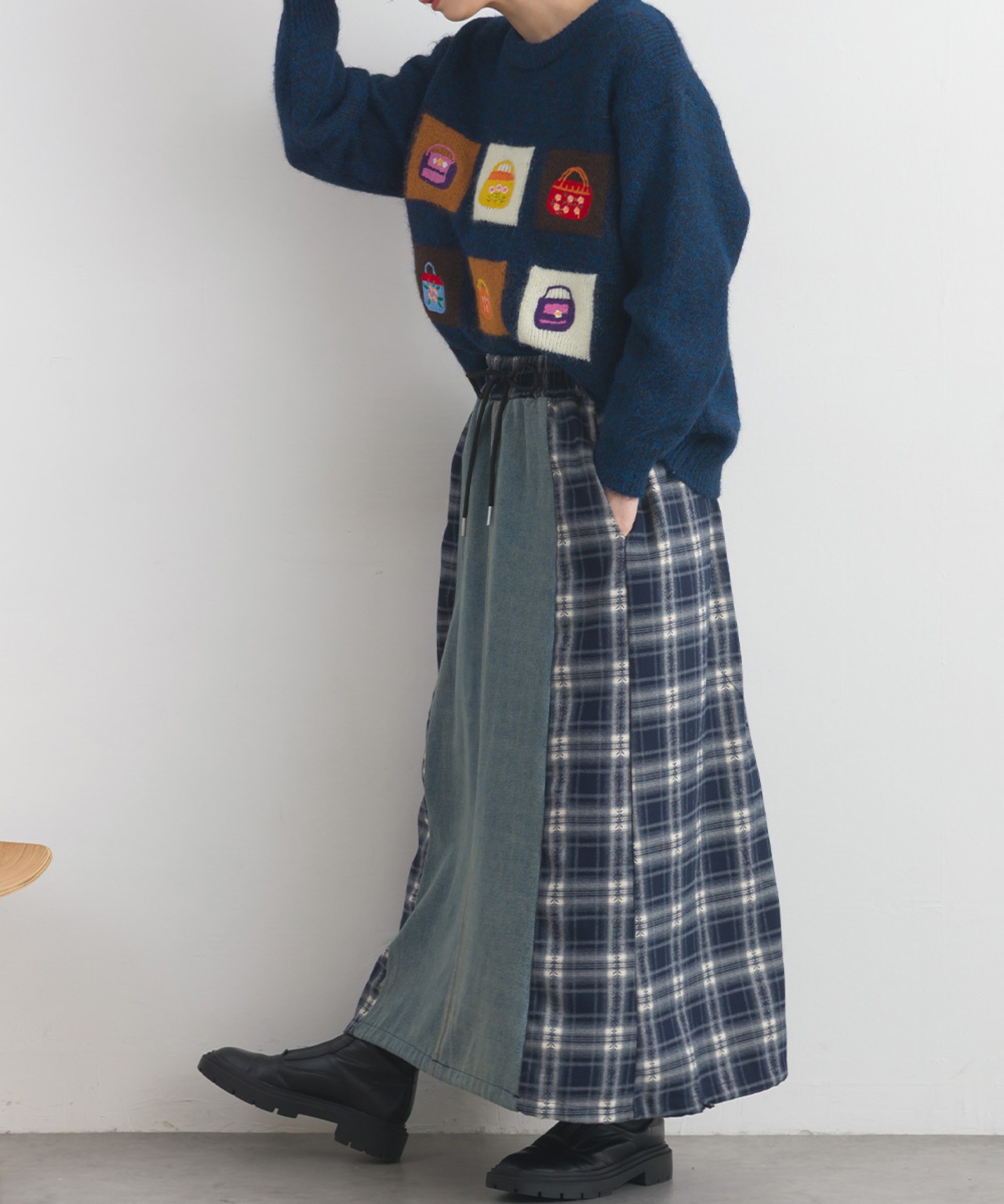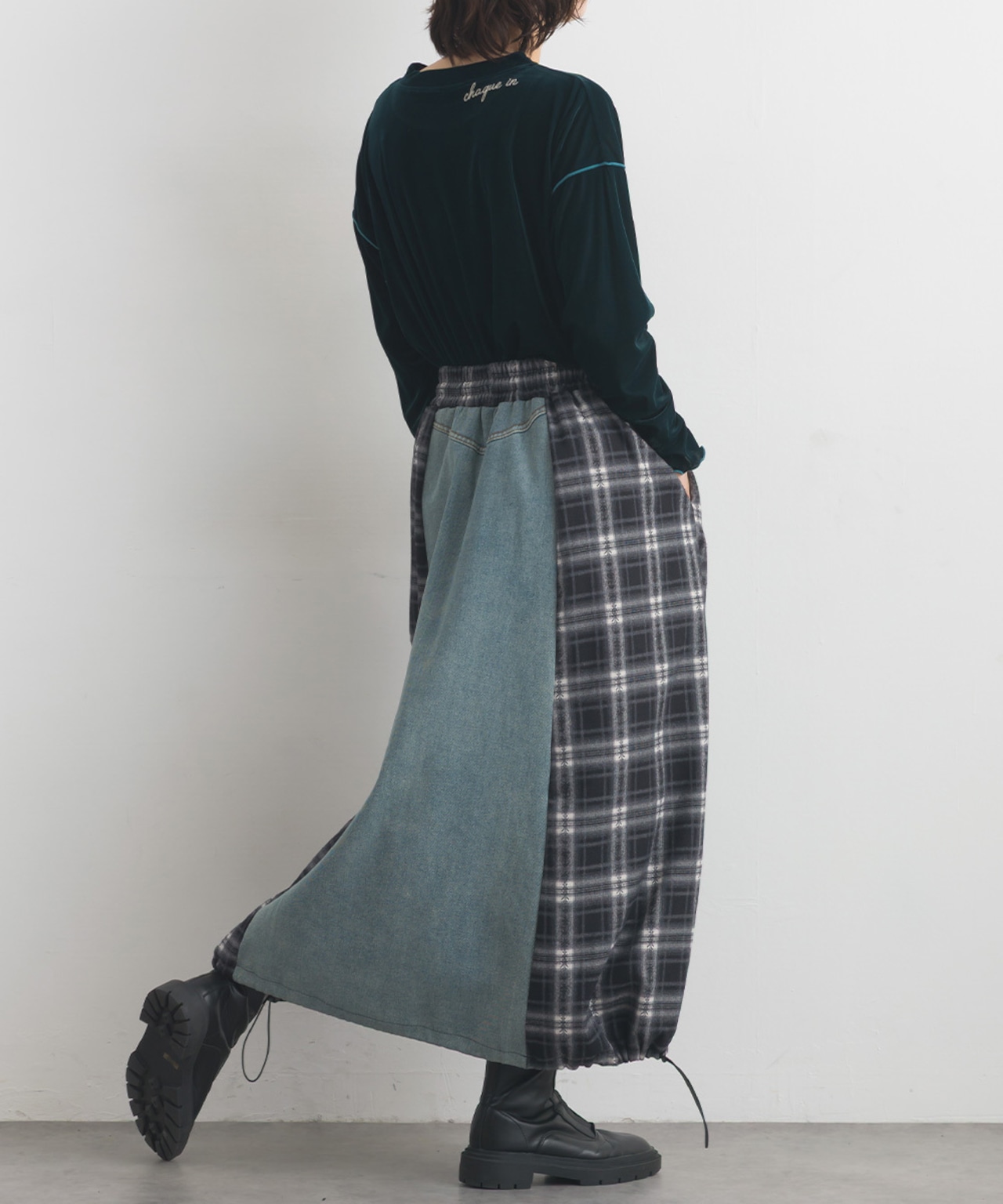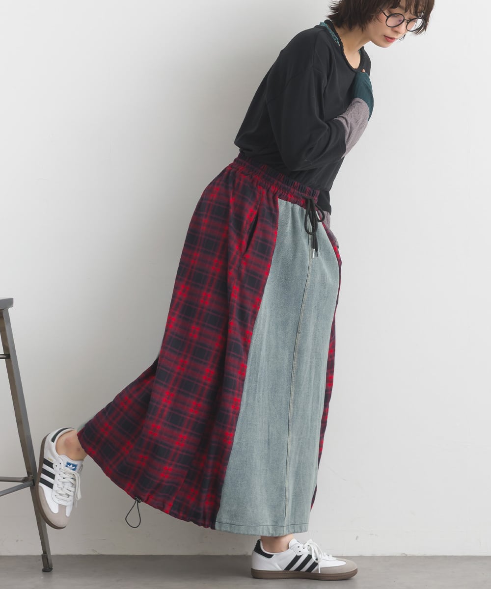 This long skirt features a vertical panel design combining denim and check patterns for a rich, expressive look.