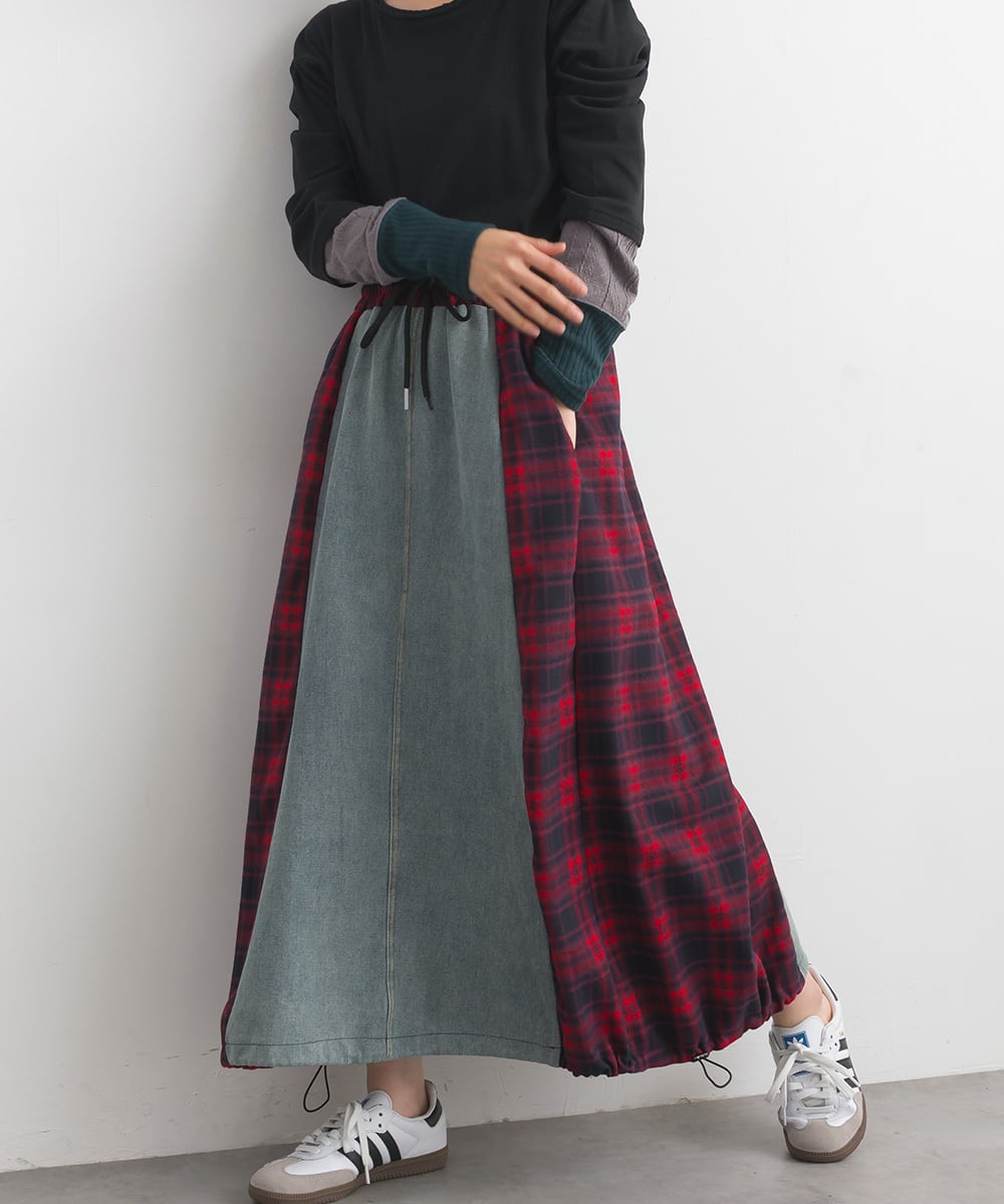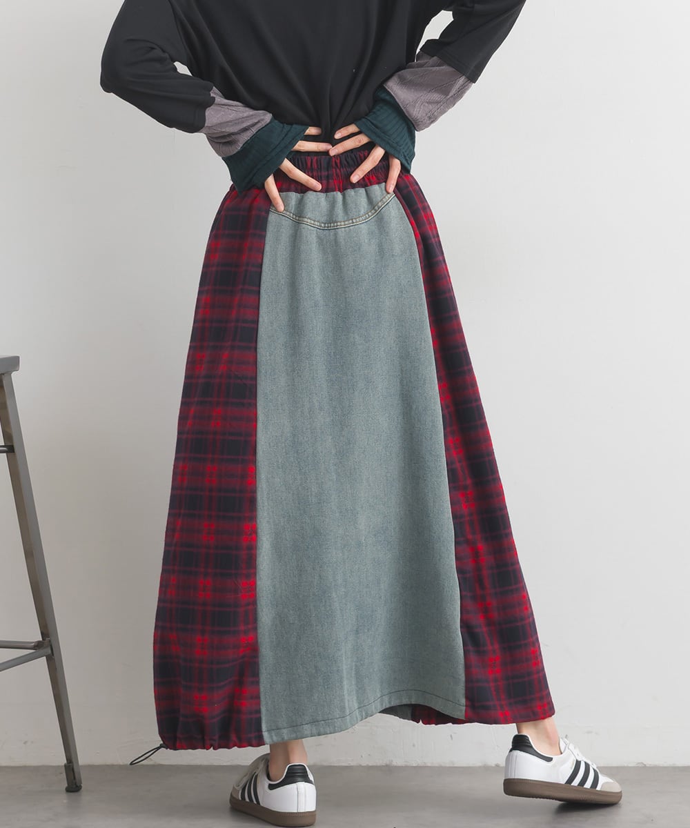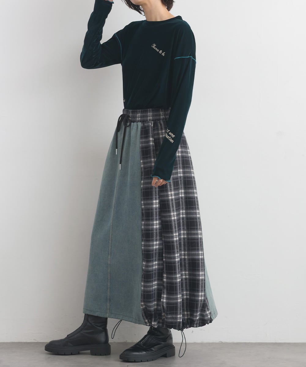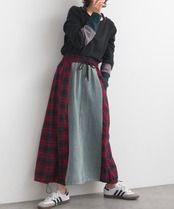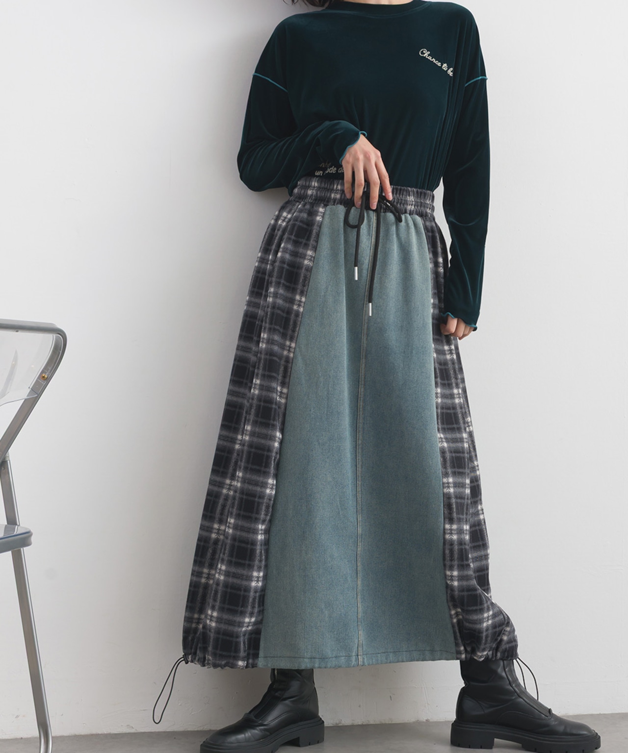 デニムとチェック柄を縦に切り替えた表情豊かなロングスカート。