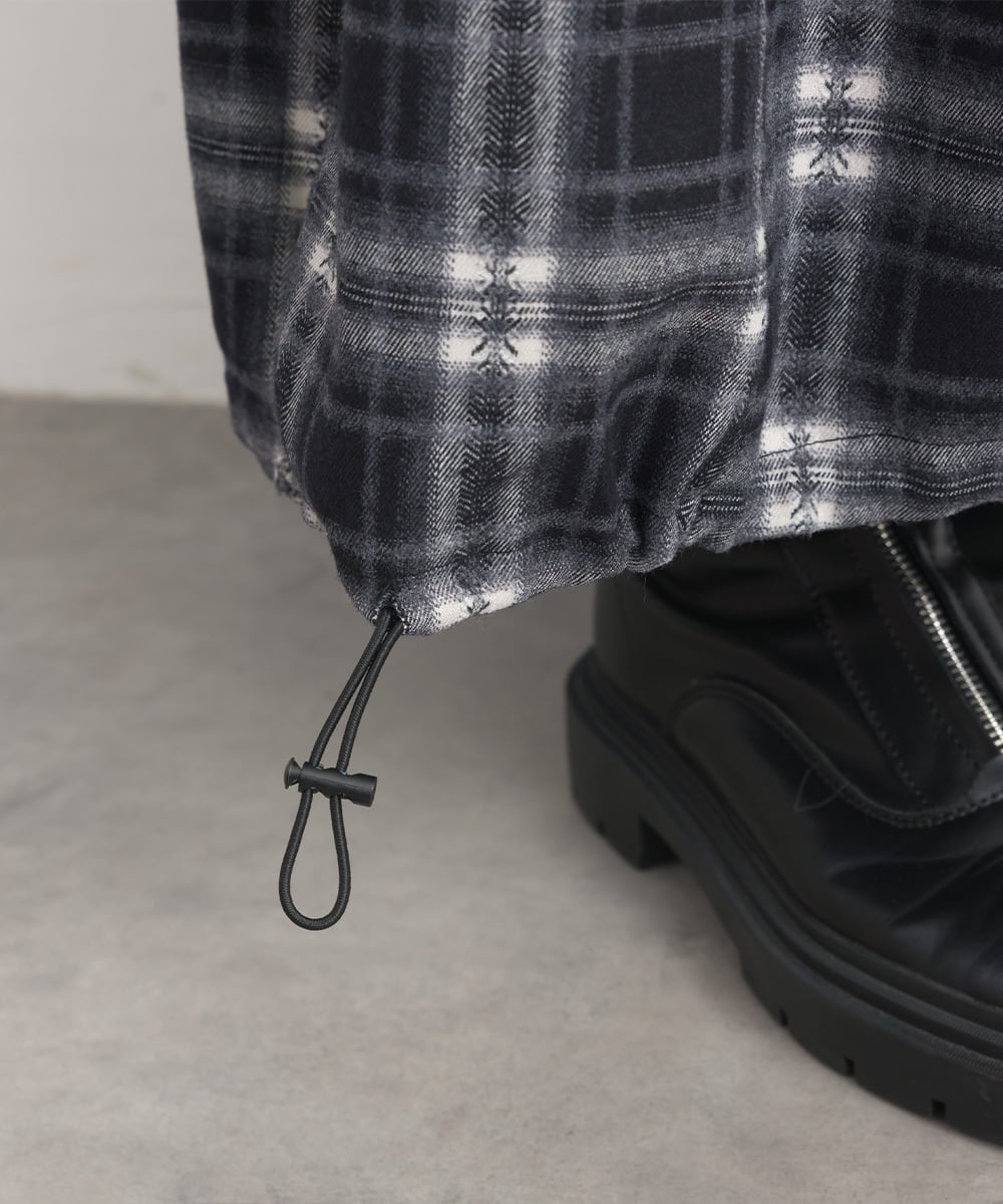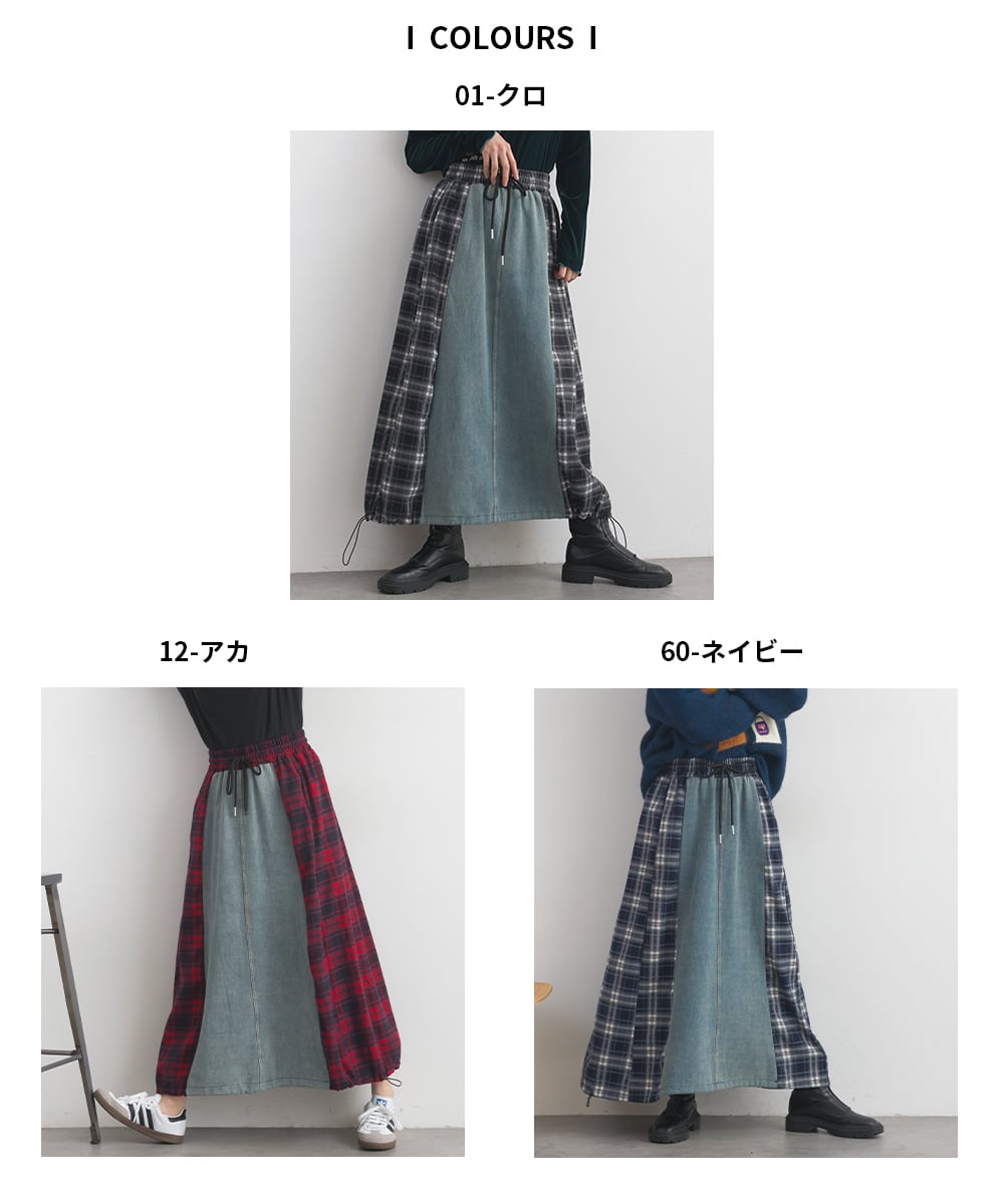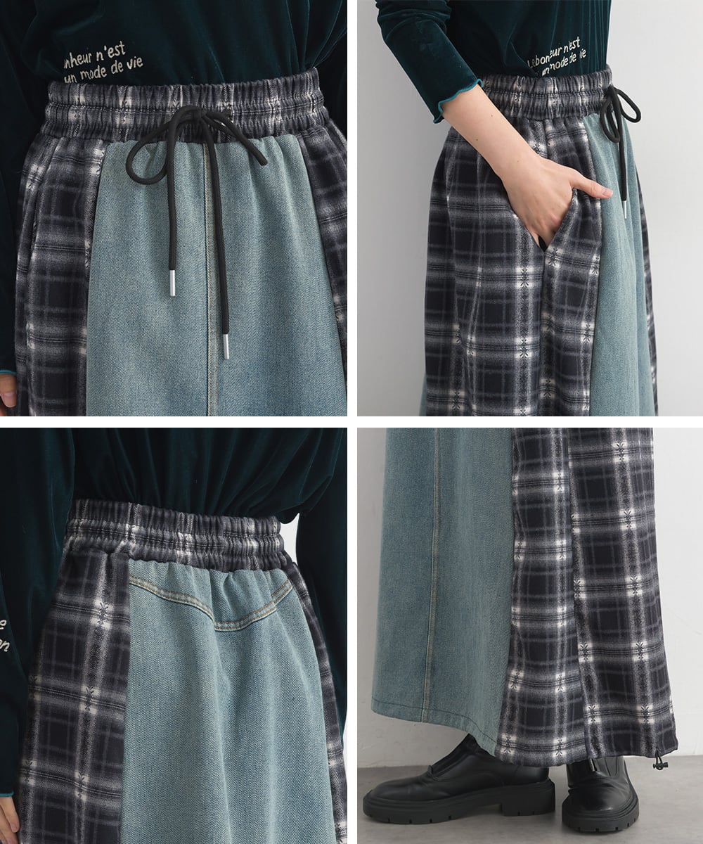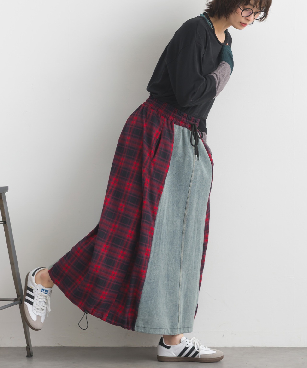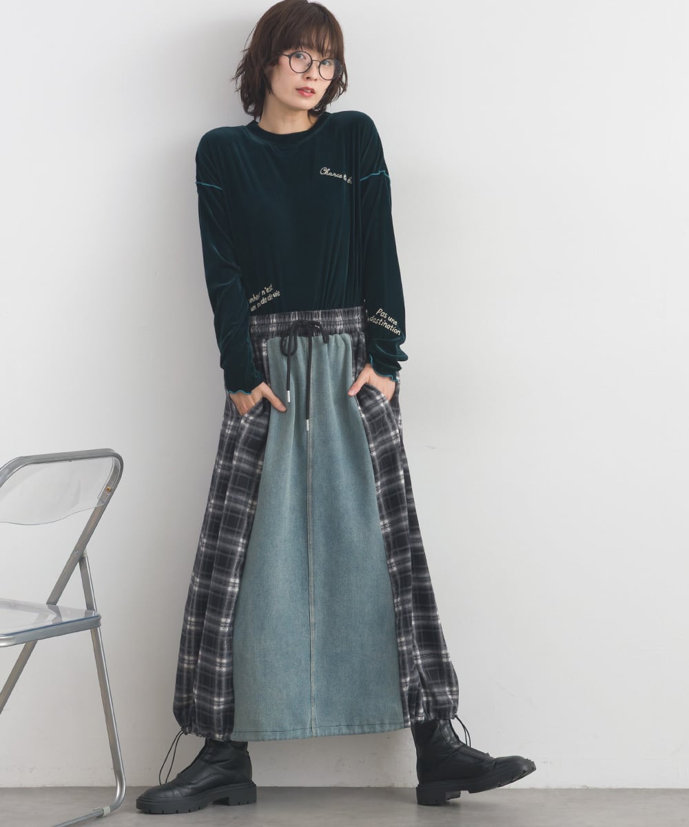 デニムとチェック柄を縦に切り替えた表情豊かなロングスカート。