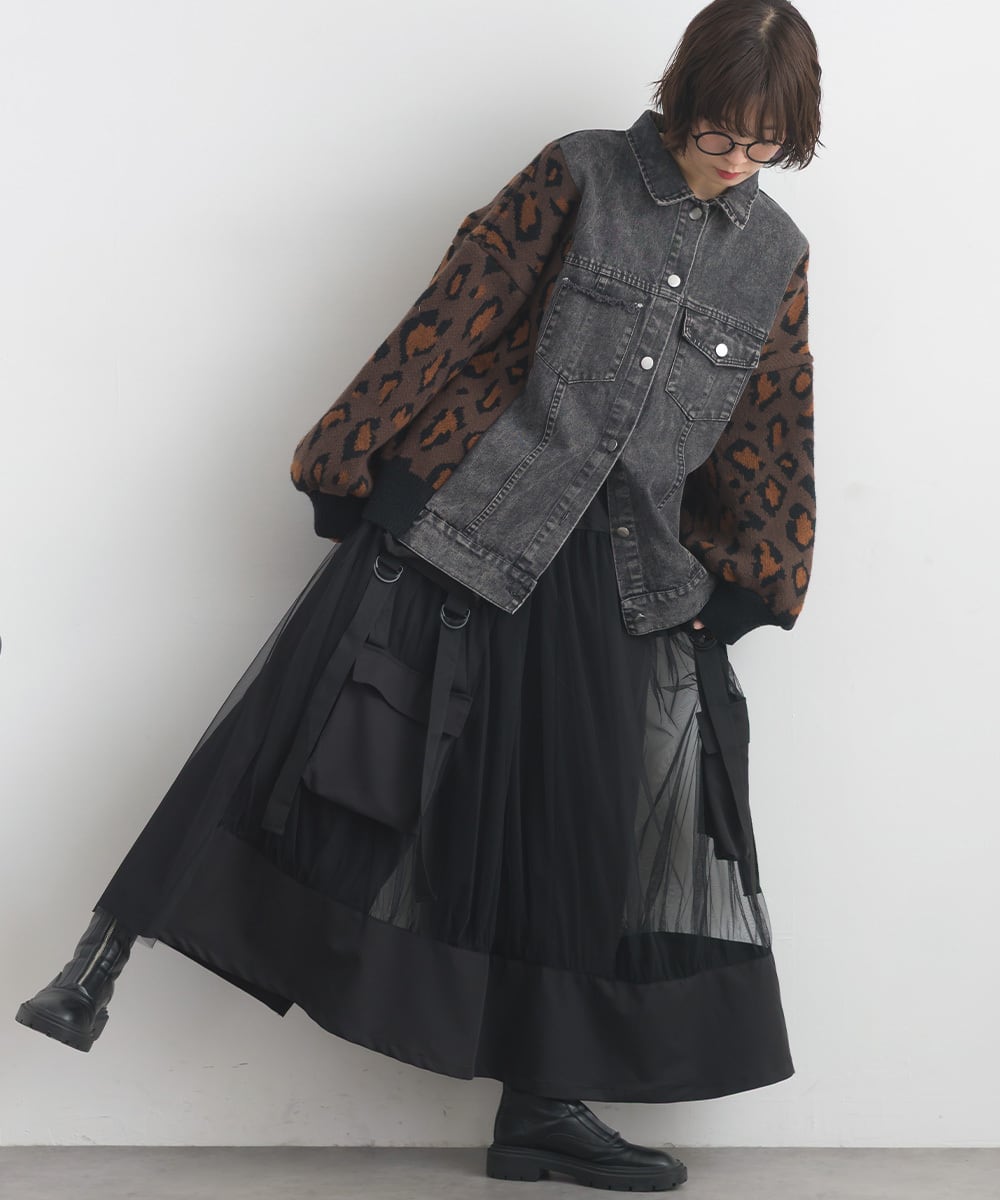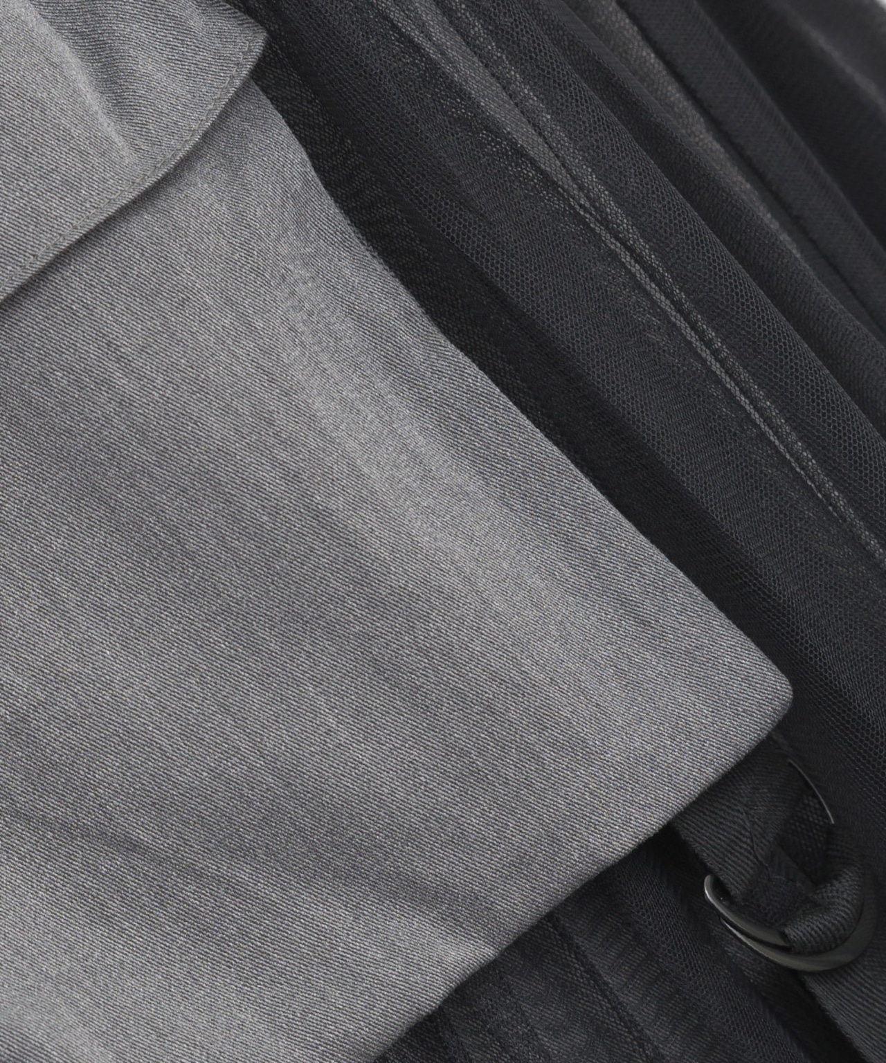 ポケットディテールがアクセントになりつつ、チュールが重なることで程よい抜け感がプラスされ、モードな印象に。