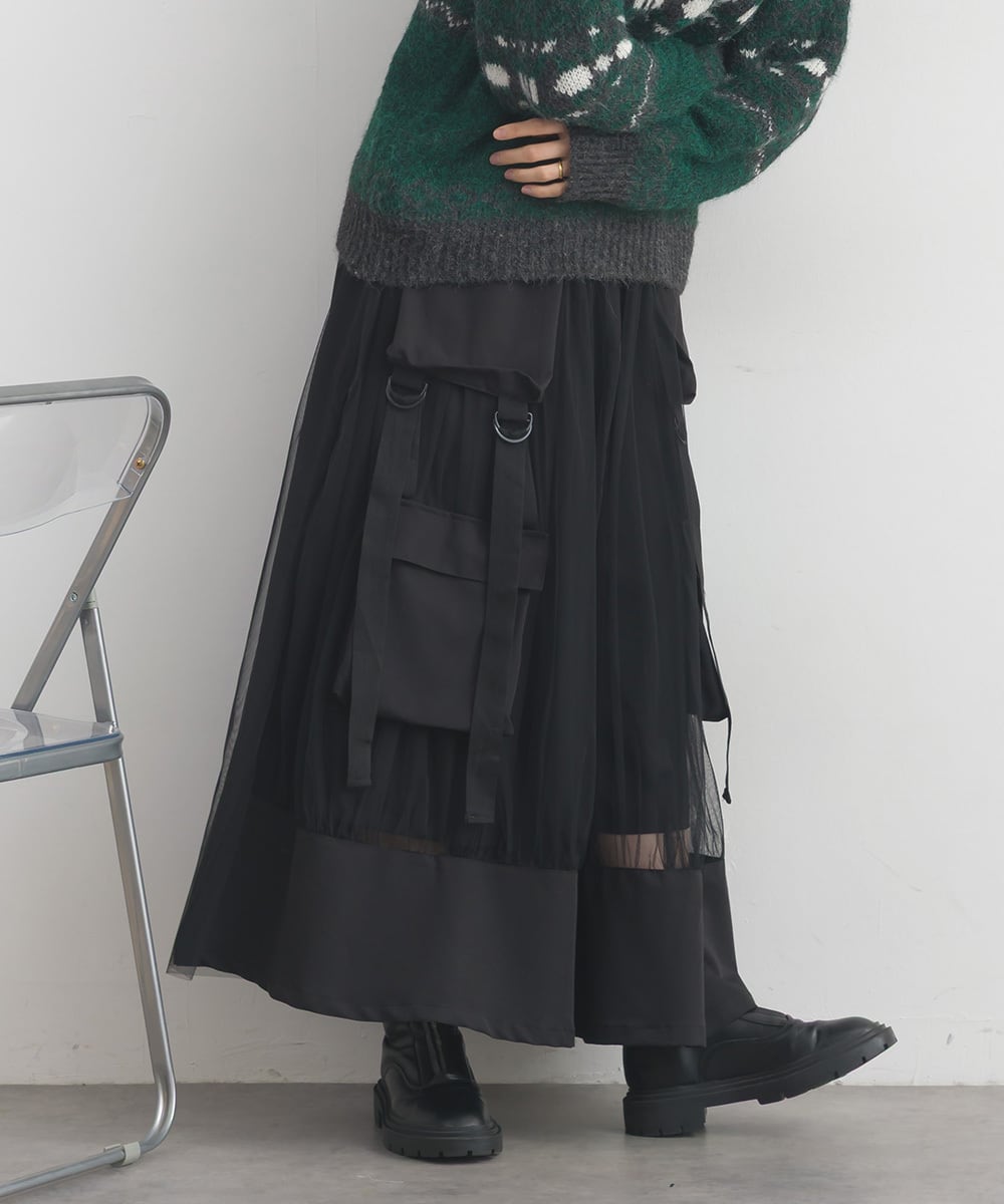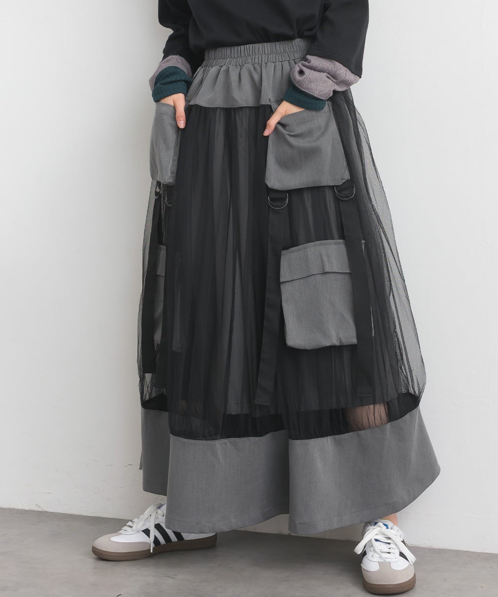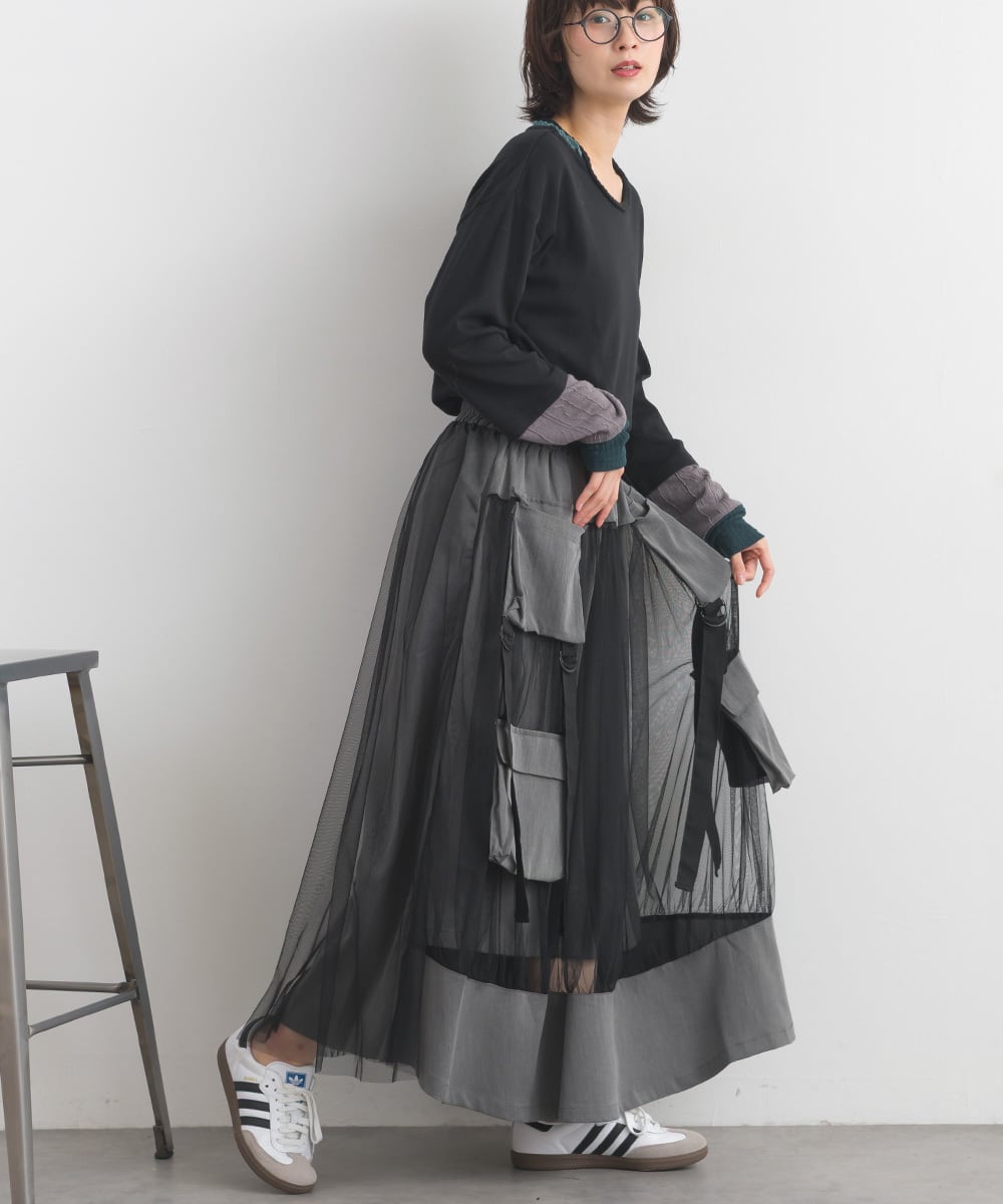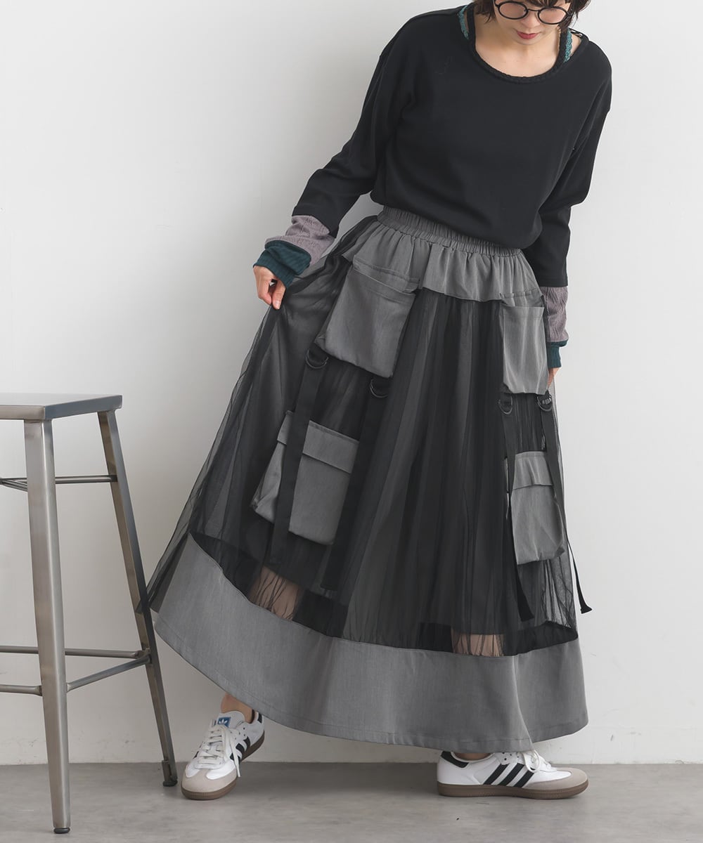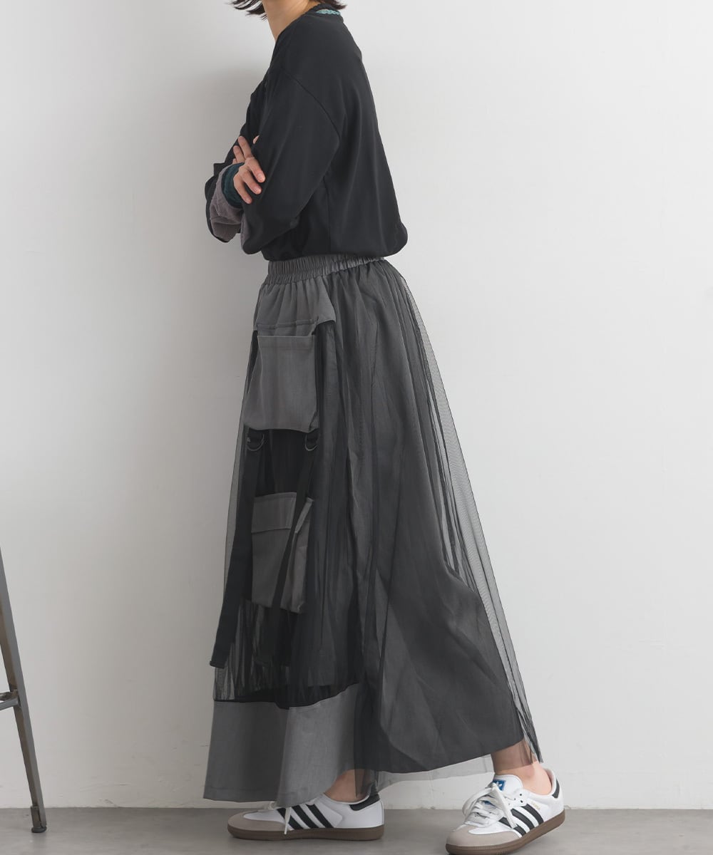 配色切替にチュールを重ね、他にはない雰囲気をまとわせたユーティリティスカート。